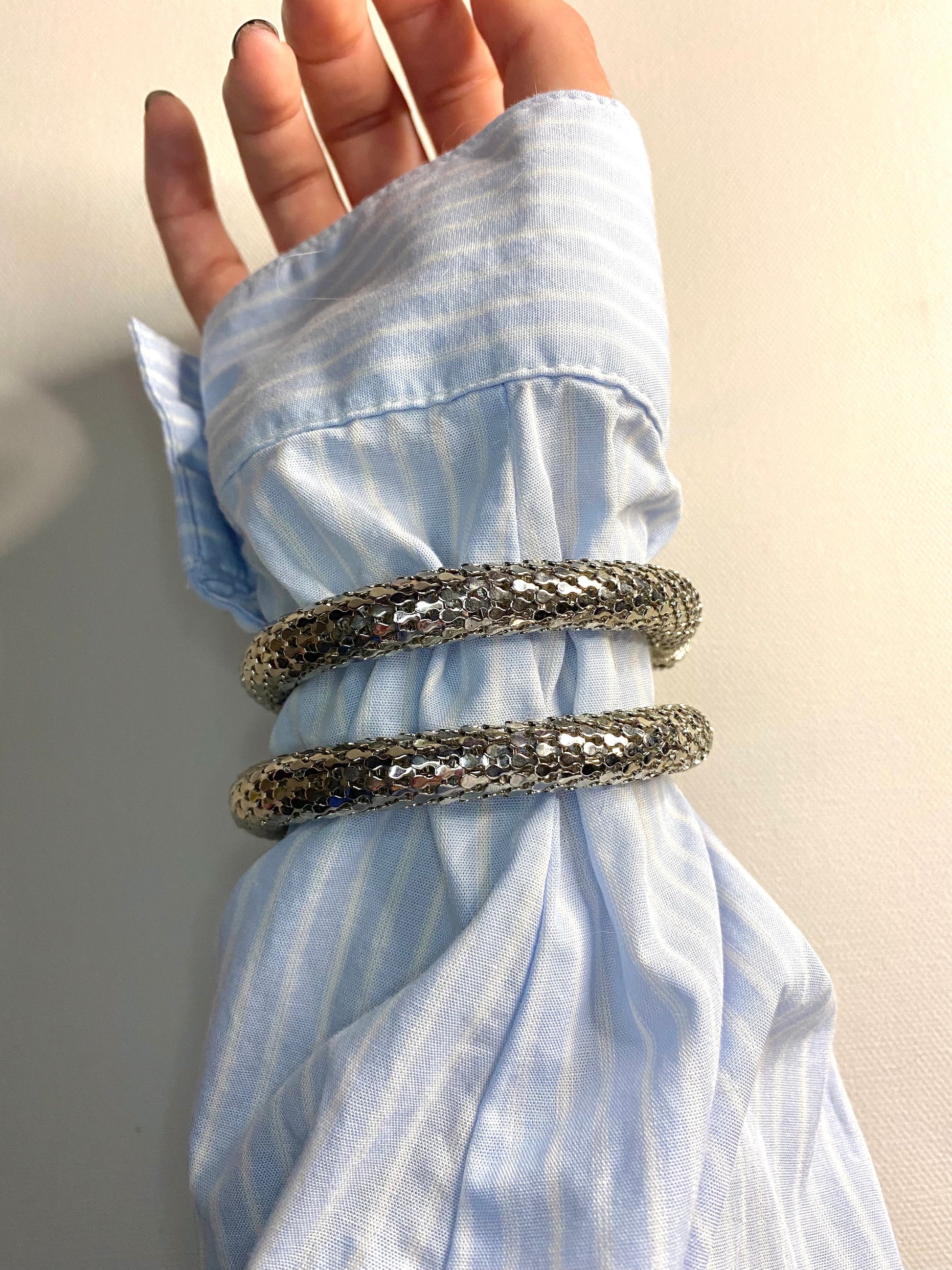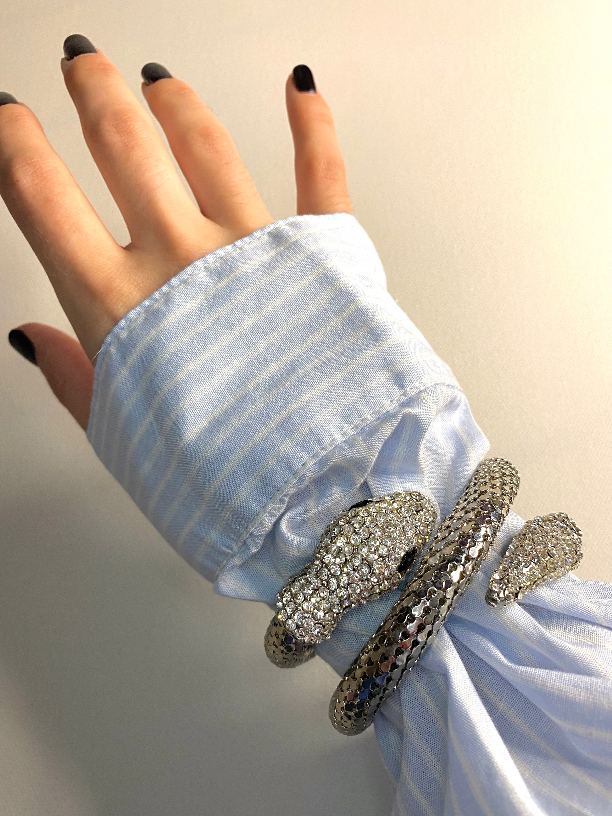 EN/ This snake bracelet is made of silver metal, with zircons at the ends and black crystals on the eyes. The bracelet wraps around the wrist to adapt to its width, the mesh is flexible.