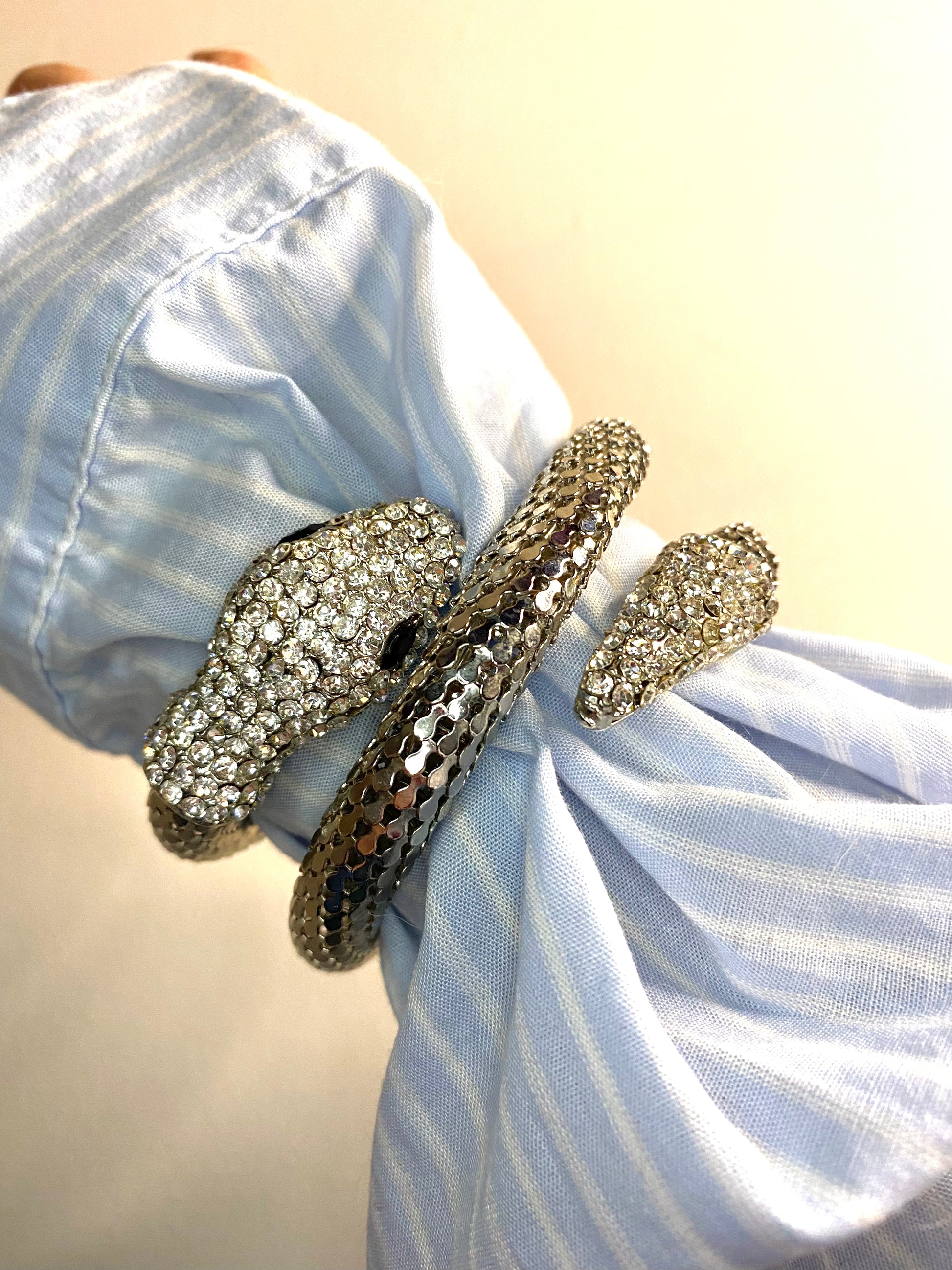 FR/ Ce bracelet serpent est en métal argenté, avec des zircons aux extrémités et des cristaux noirs sur les yeux. Le bracelet s’enroule autour du poignet pour s’adapter à sa largeur, la maille est souple et flexible.