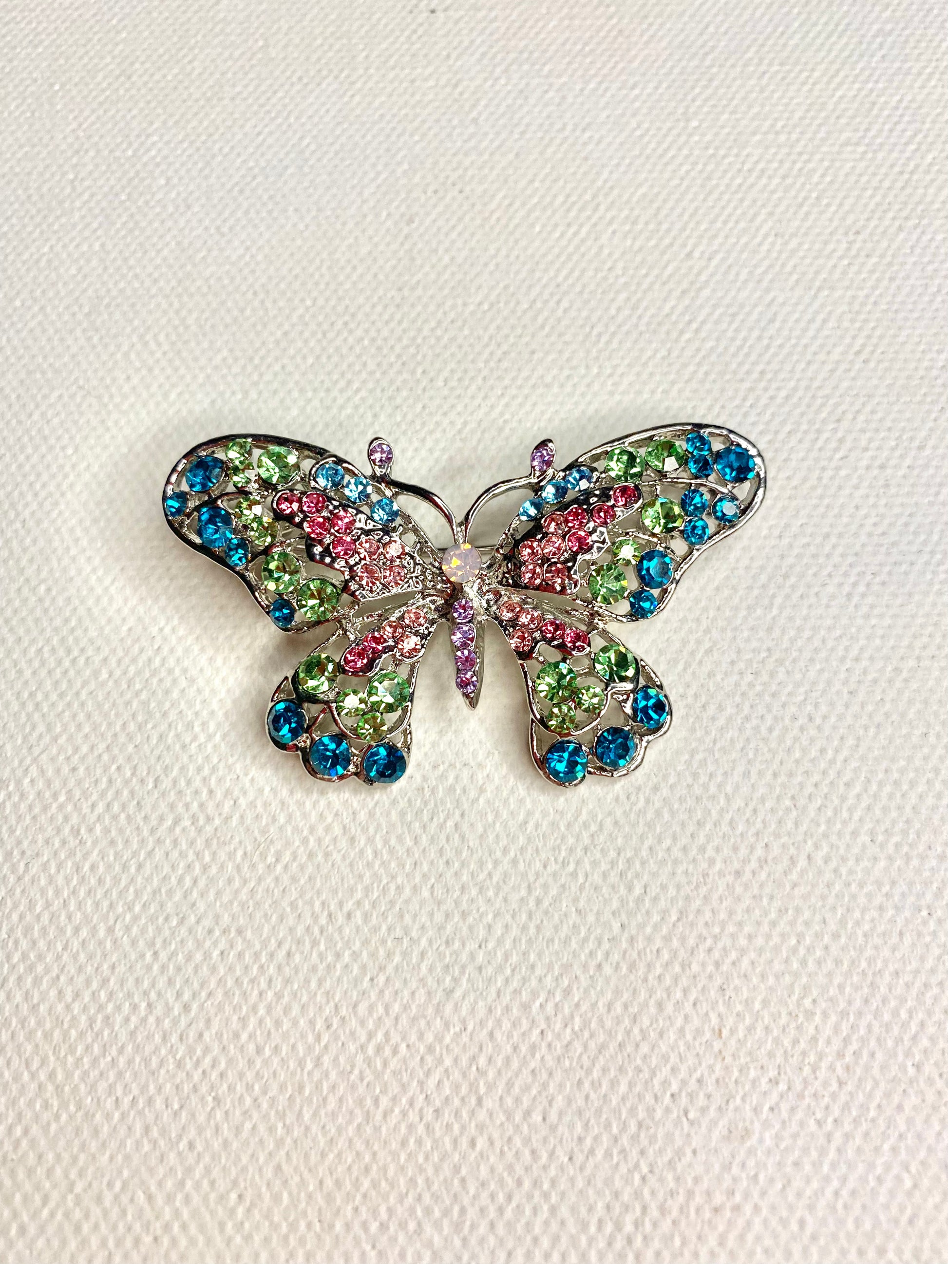 EN/ This multi colors butterfly brooch and pendant is stainless steel with glass stones blue green and pink. She is perfect for a y2k look.