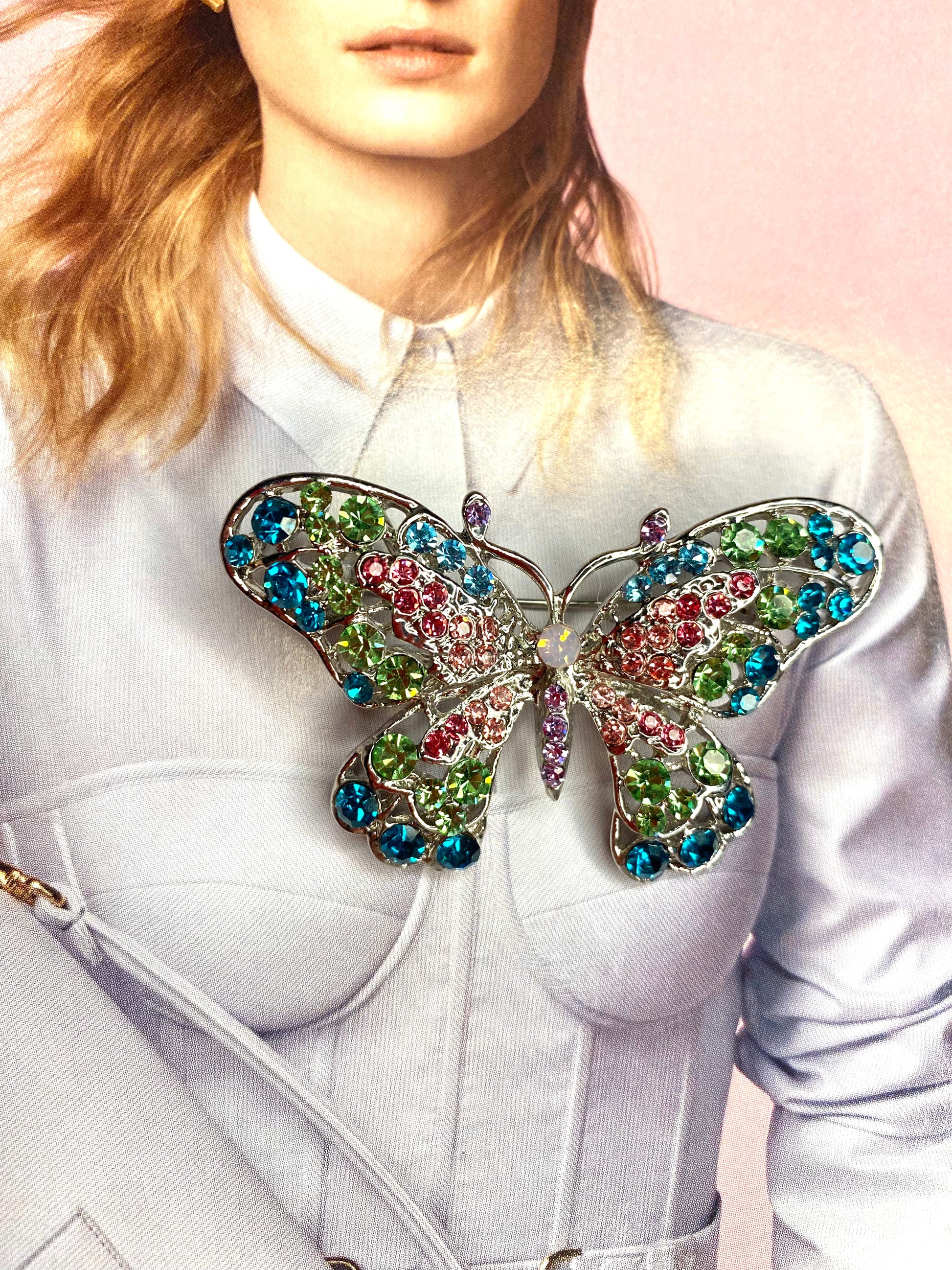 FR/ Cette broche et pendentif papillon est en acier inoxydable avec des pierres en verres bleues vertes et roses. Parfaite pour un look Y2K.