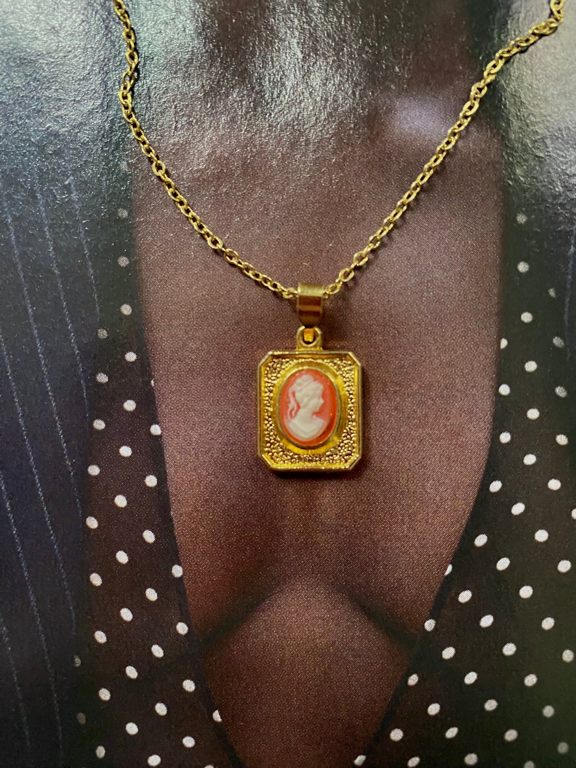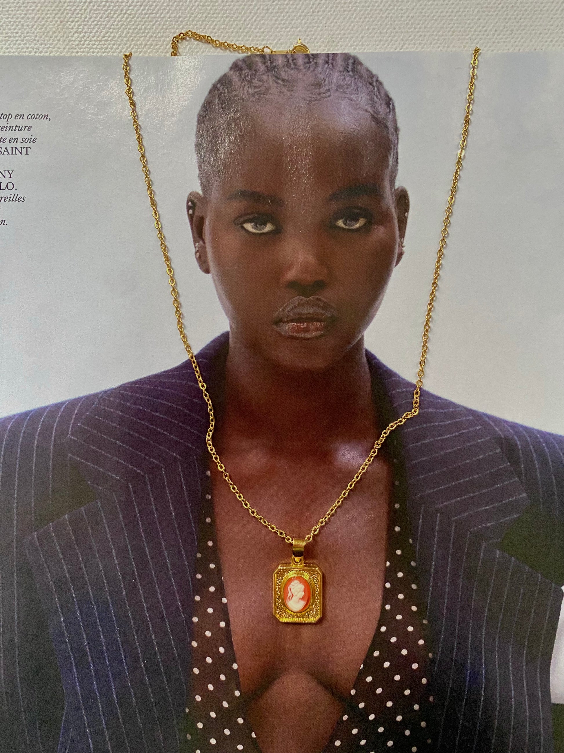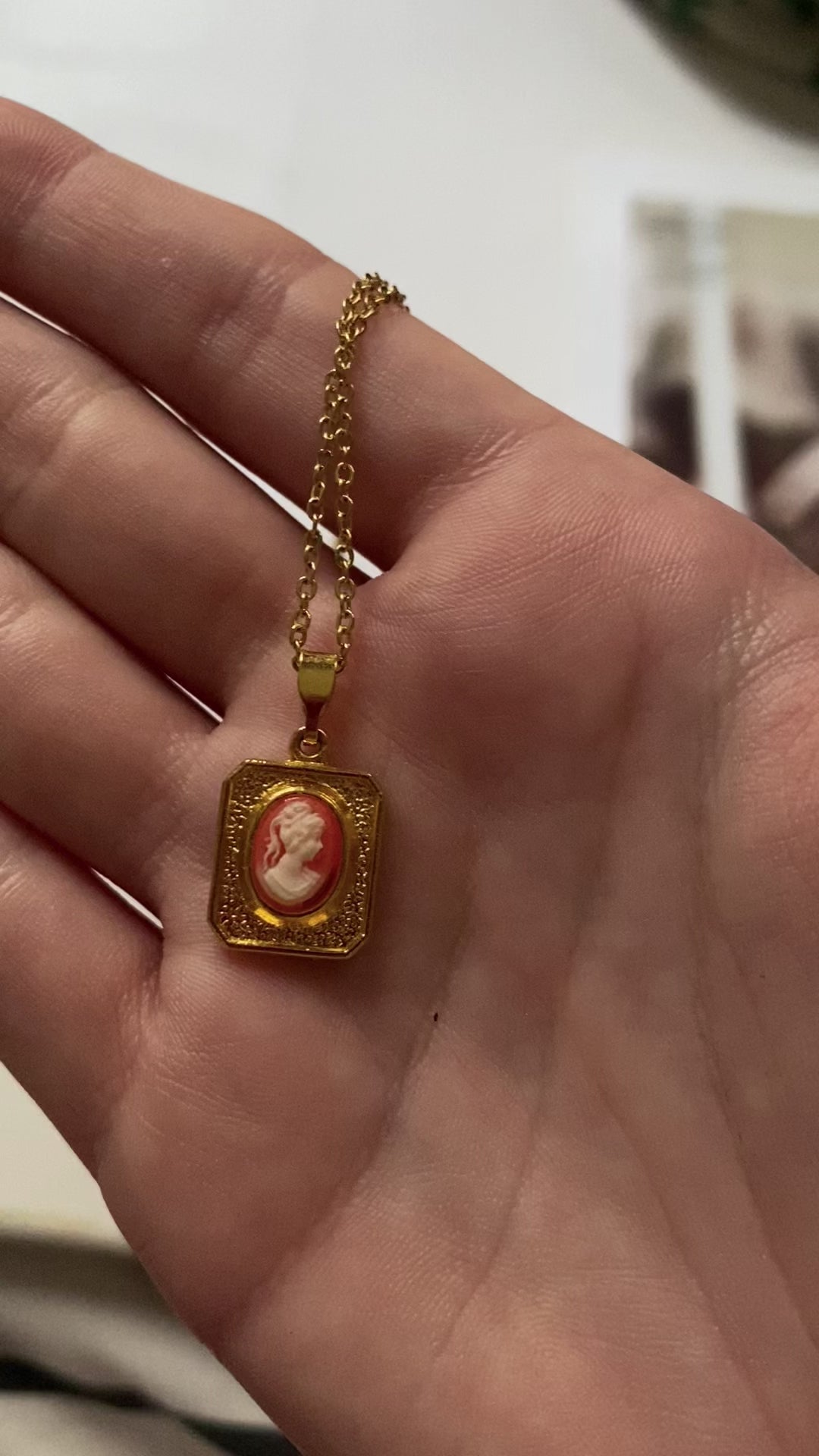 Collier en plaqué or avec un petit pendentif carré avec un camée délicat à l’intérieur.