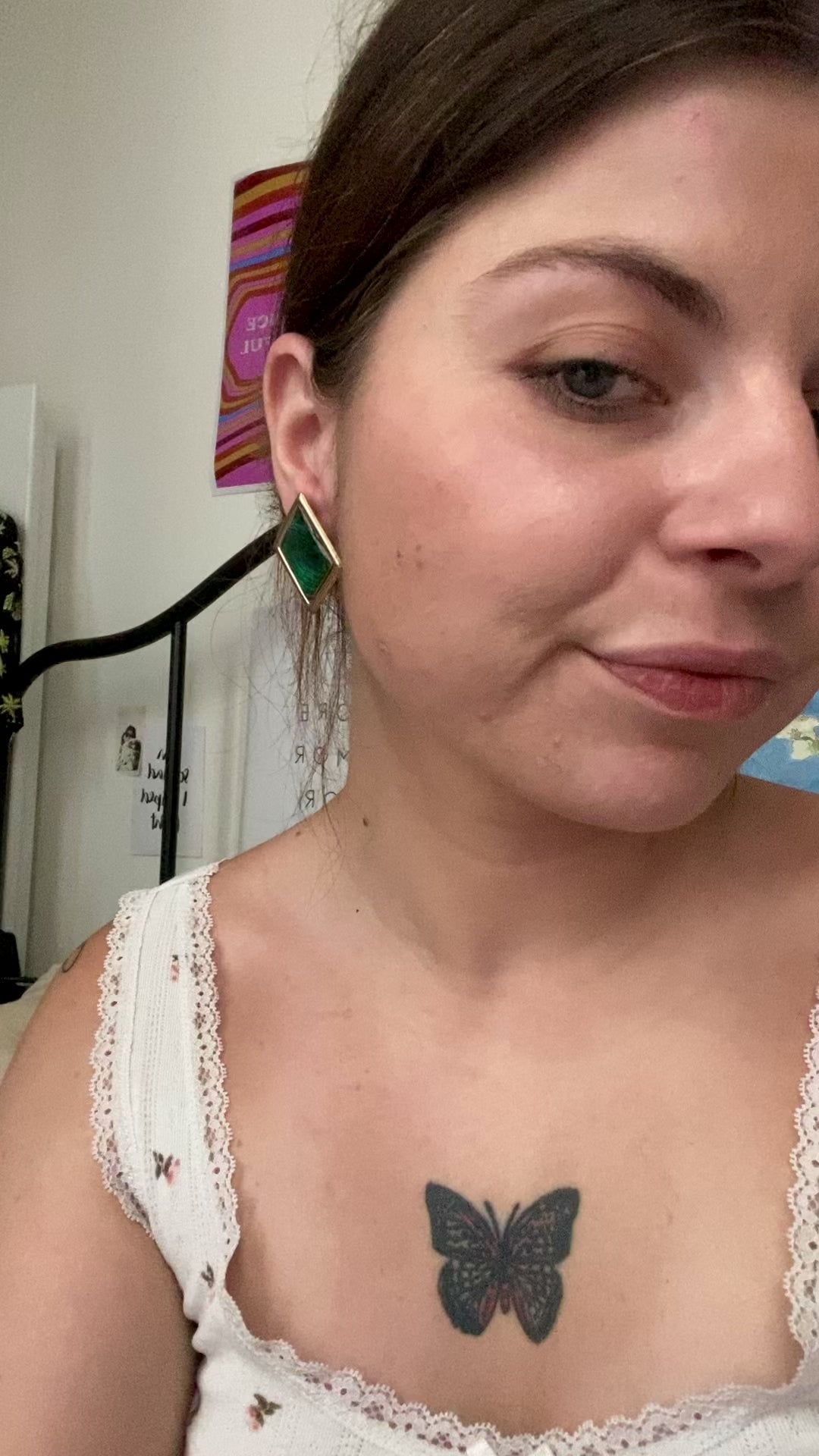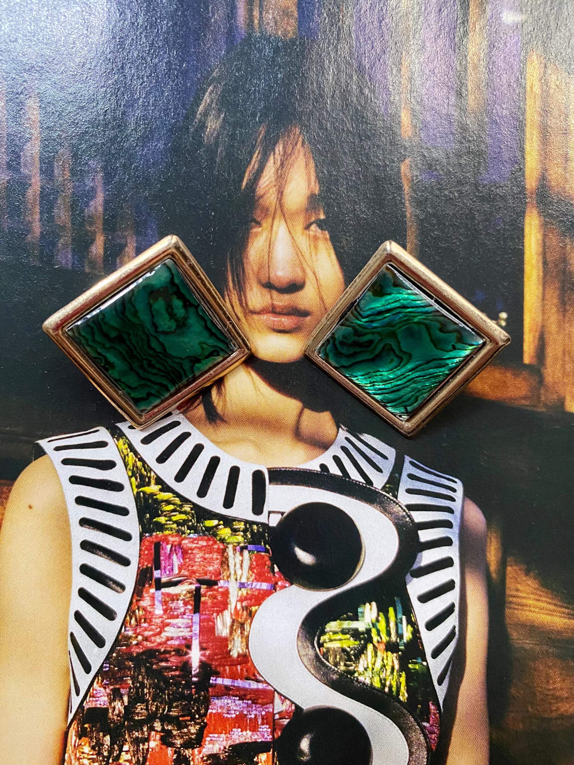 Boucles d’oreilles carrés en acier couleur or et de la nacre au centre. Très joli travail des années 60. Paire très légère.