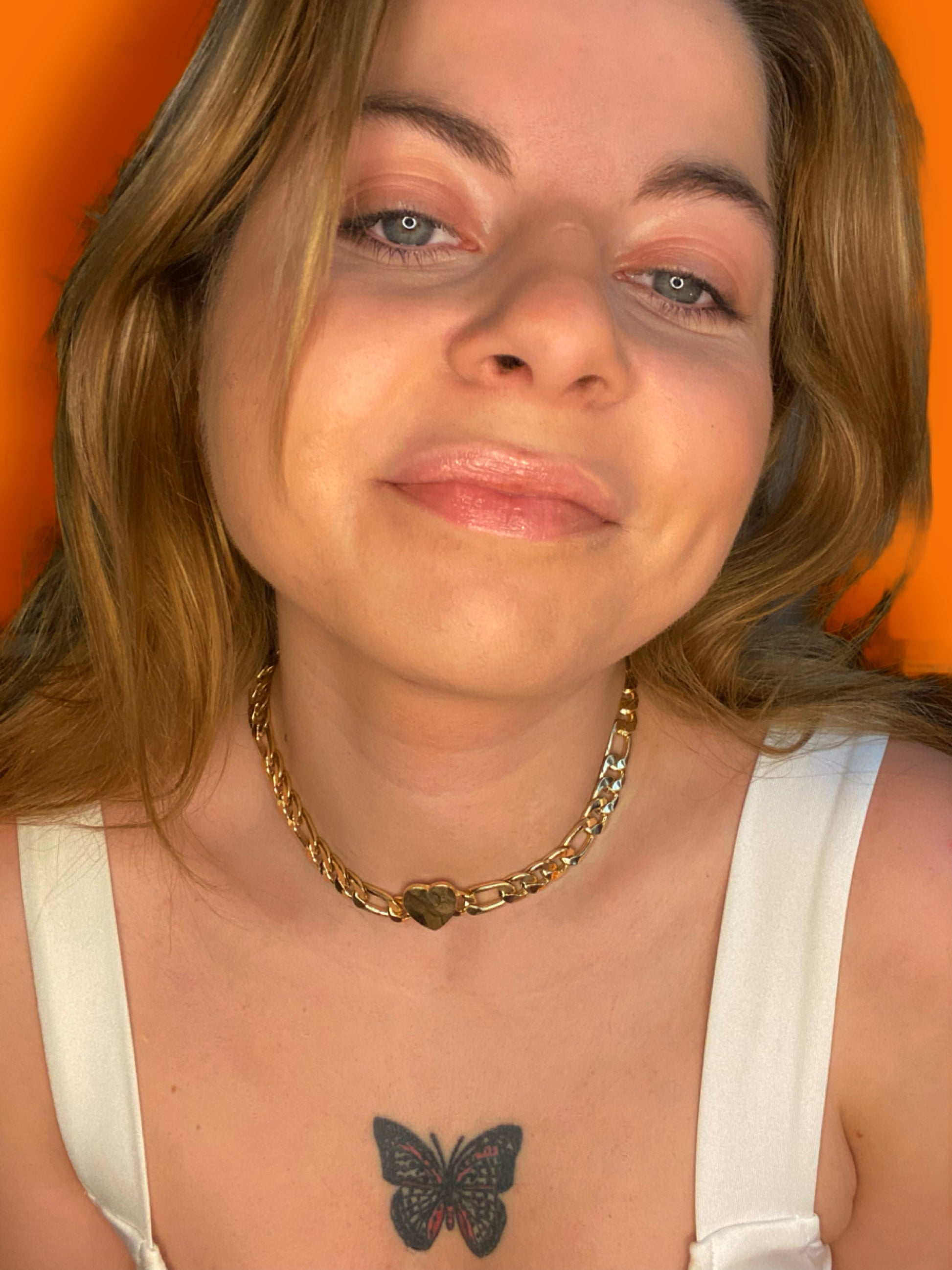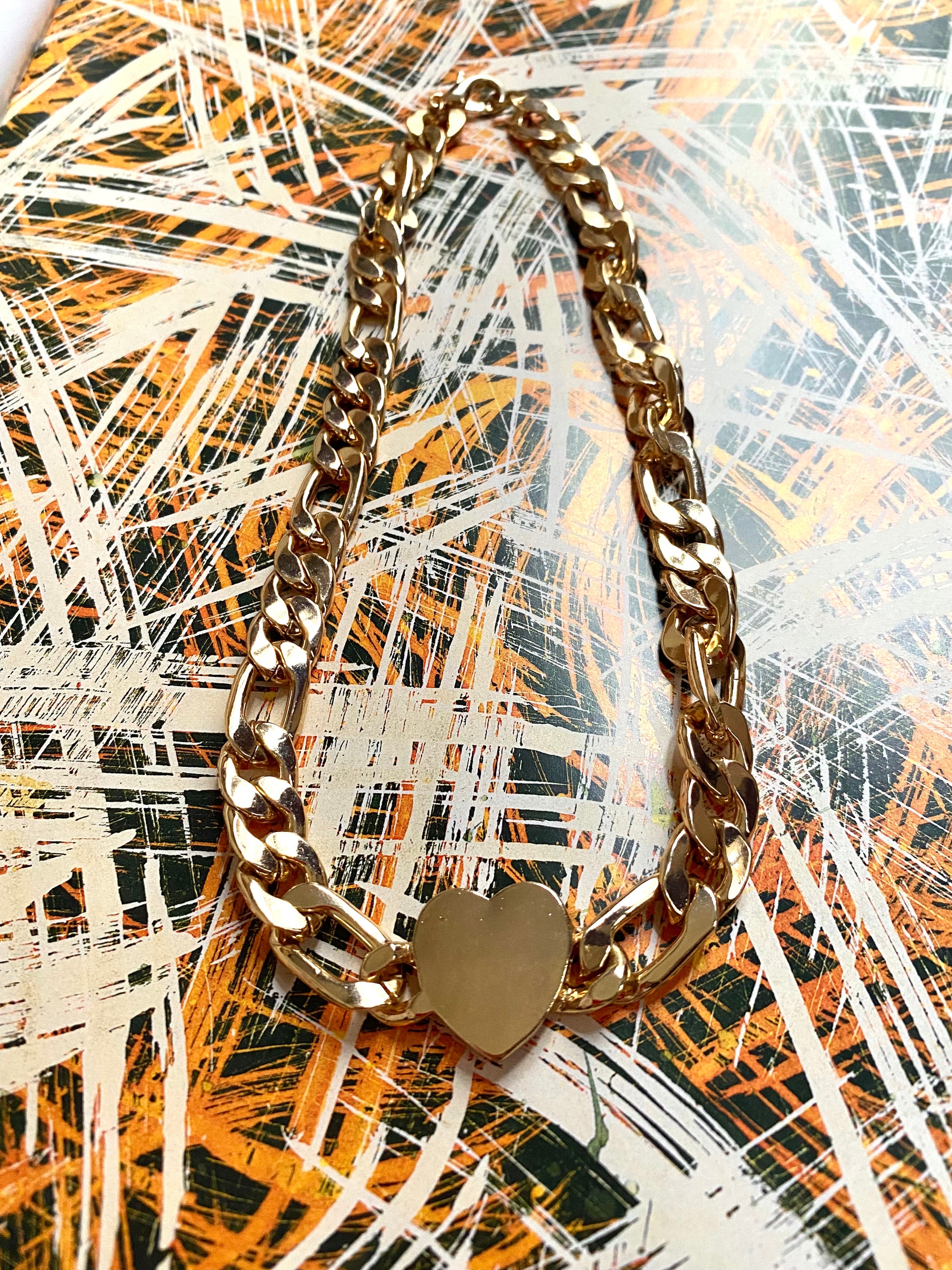 Collier plaqué or avec une grosse chaîne et un coeur au centre.
