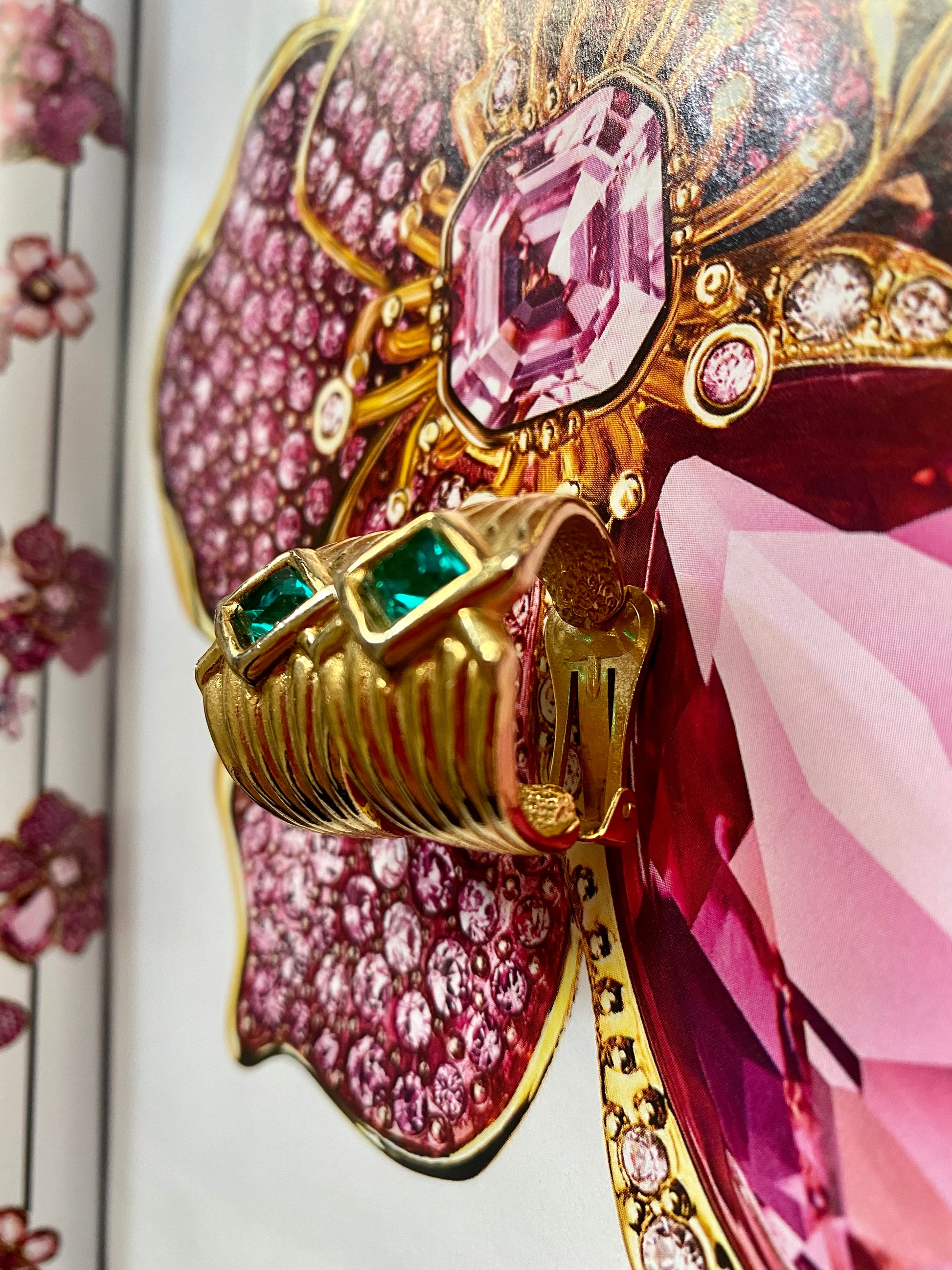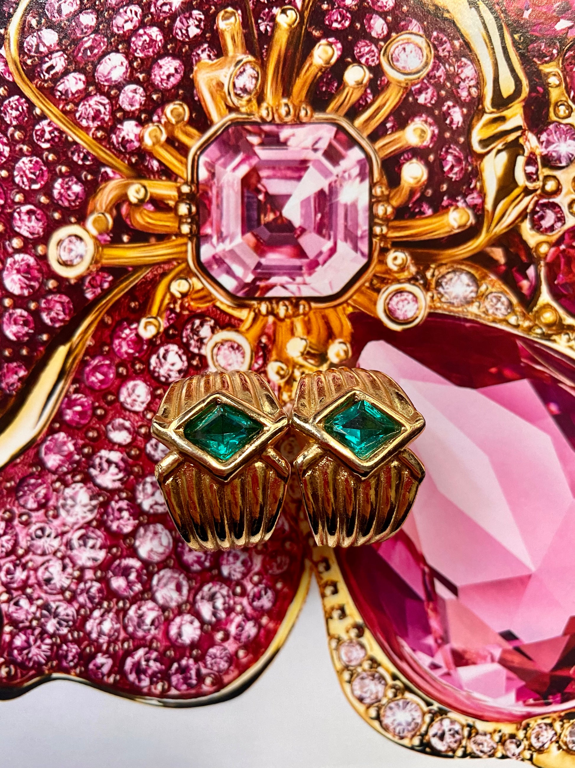 Ces clips créoles avec une pierre verte très belle sont signées David Grau. Plaqué or et vintage.