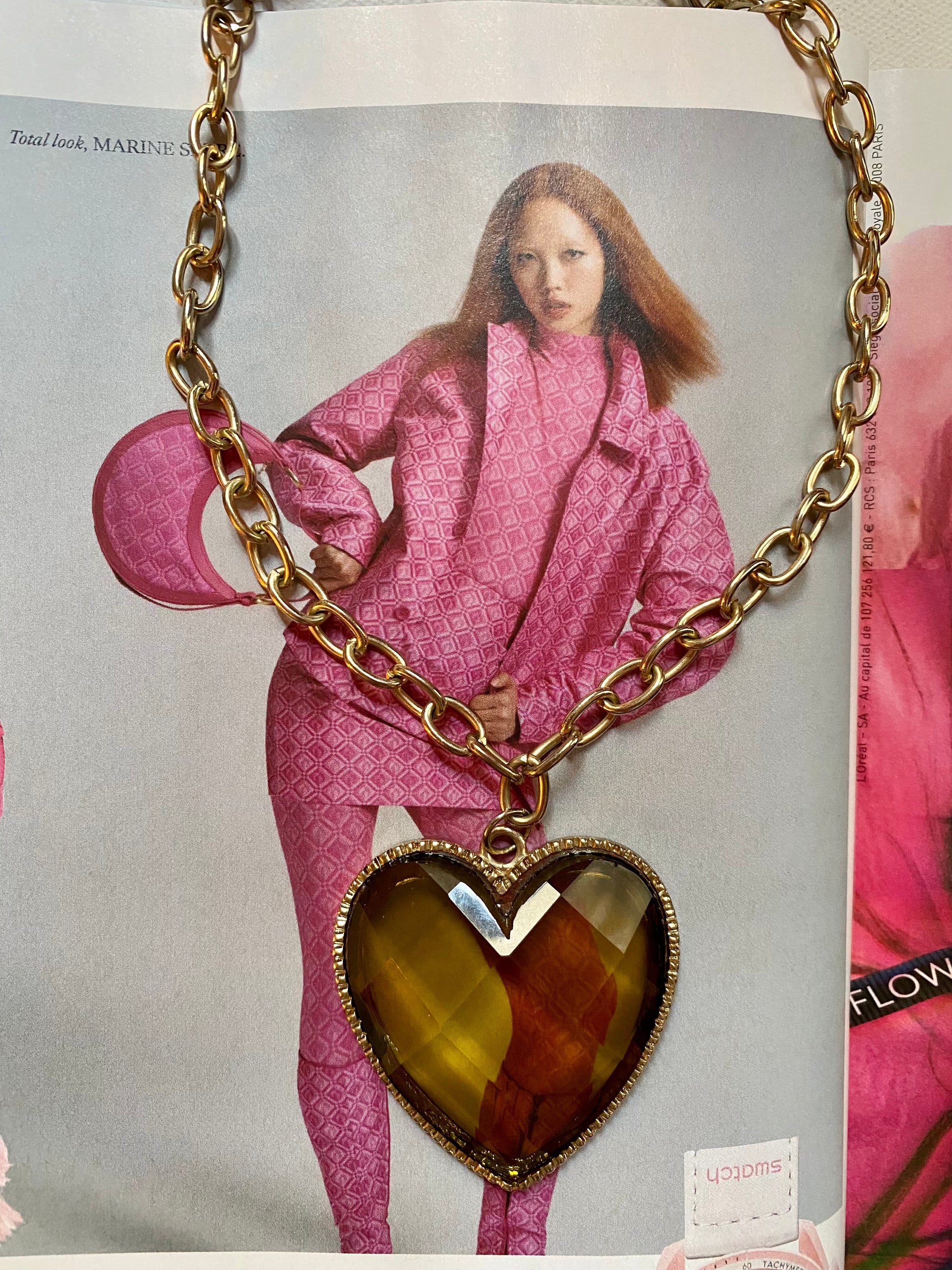 Collier en métal couleur or avec un gros pendentif coeur en pierre synthétique.