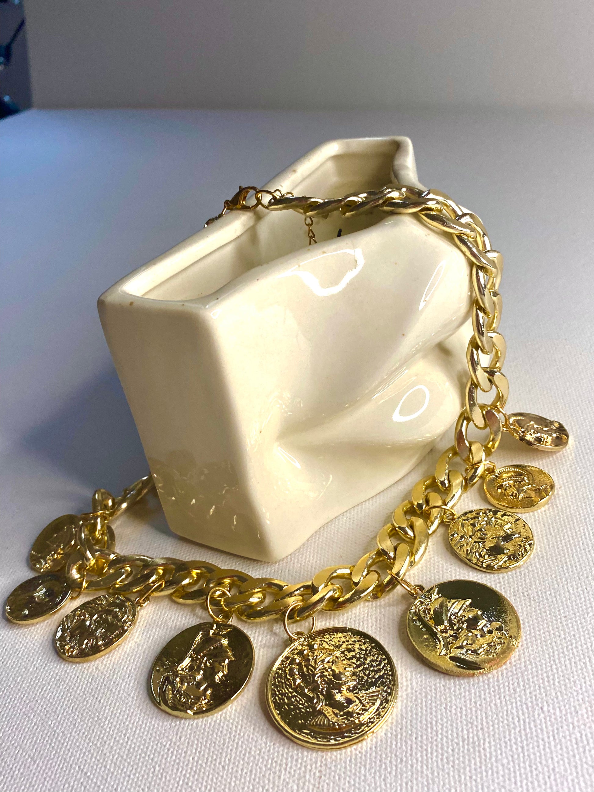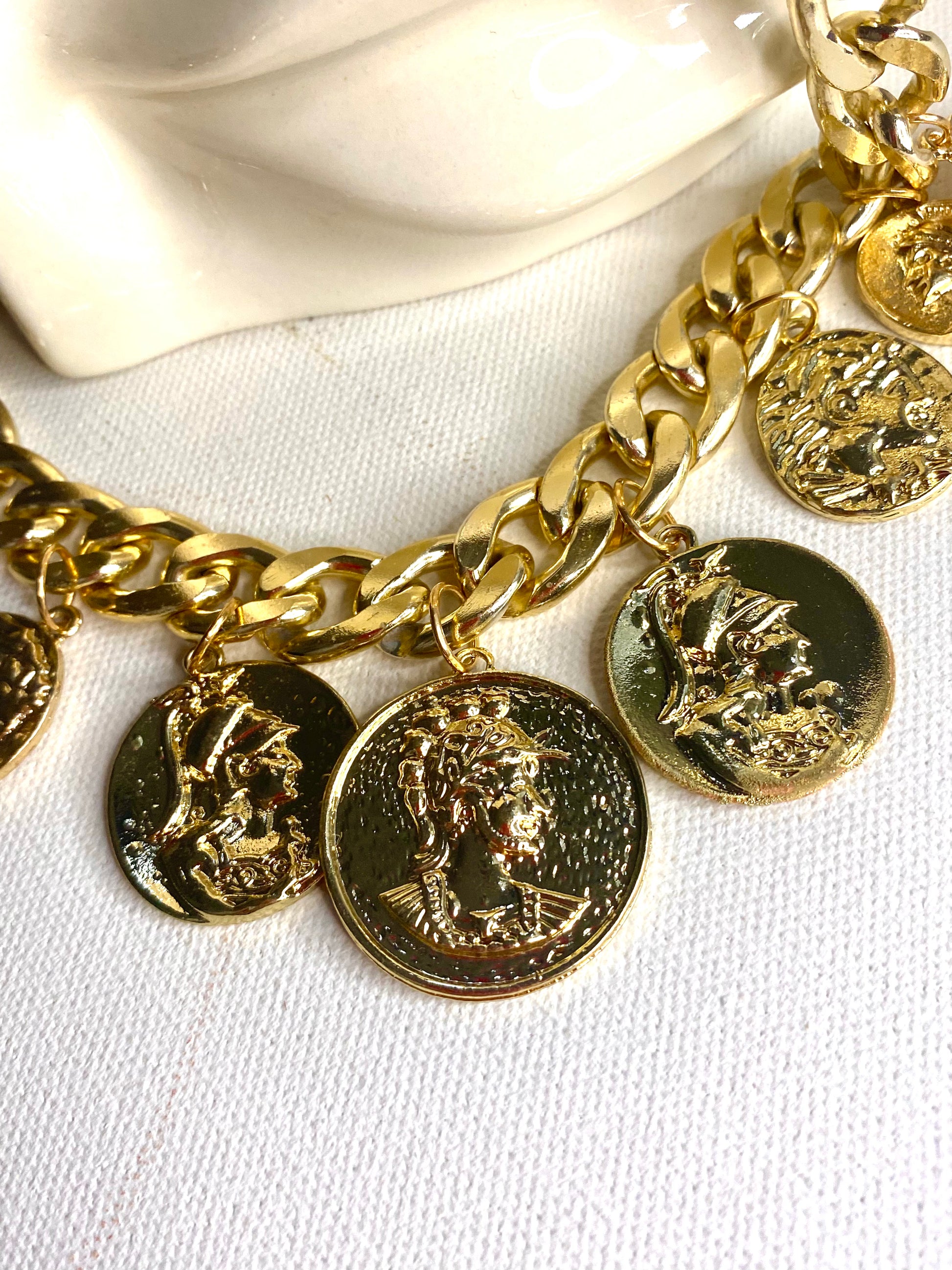 Collier vintage plaqué or à breloques gravures style romaines, c’est une pièce forte et stylé !