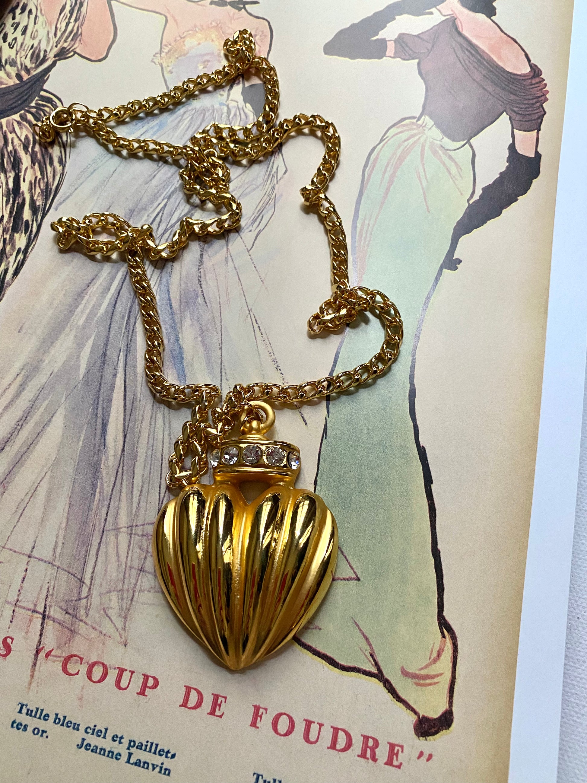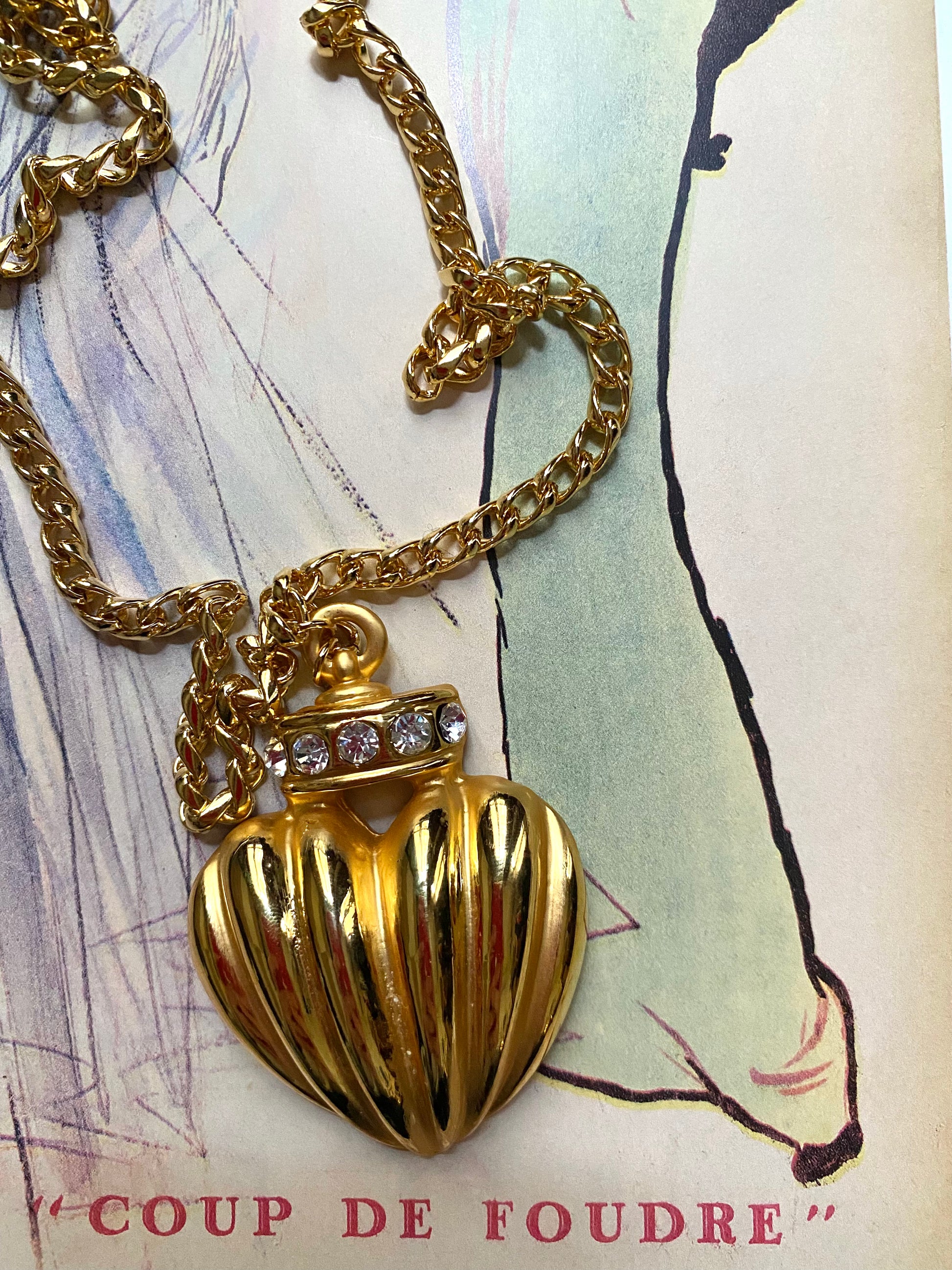 Collier très long qui est porté à double tour sur la dernière photo, il date des années 80 réalisé par un artisan bijoutier parisien. Il est sublime, avec des cristaux blancs, un plaqué or dans les règles de l’art de l’époque.