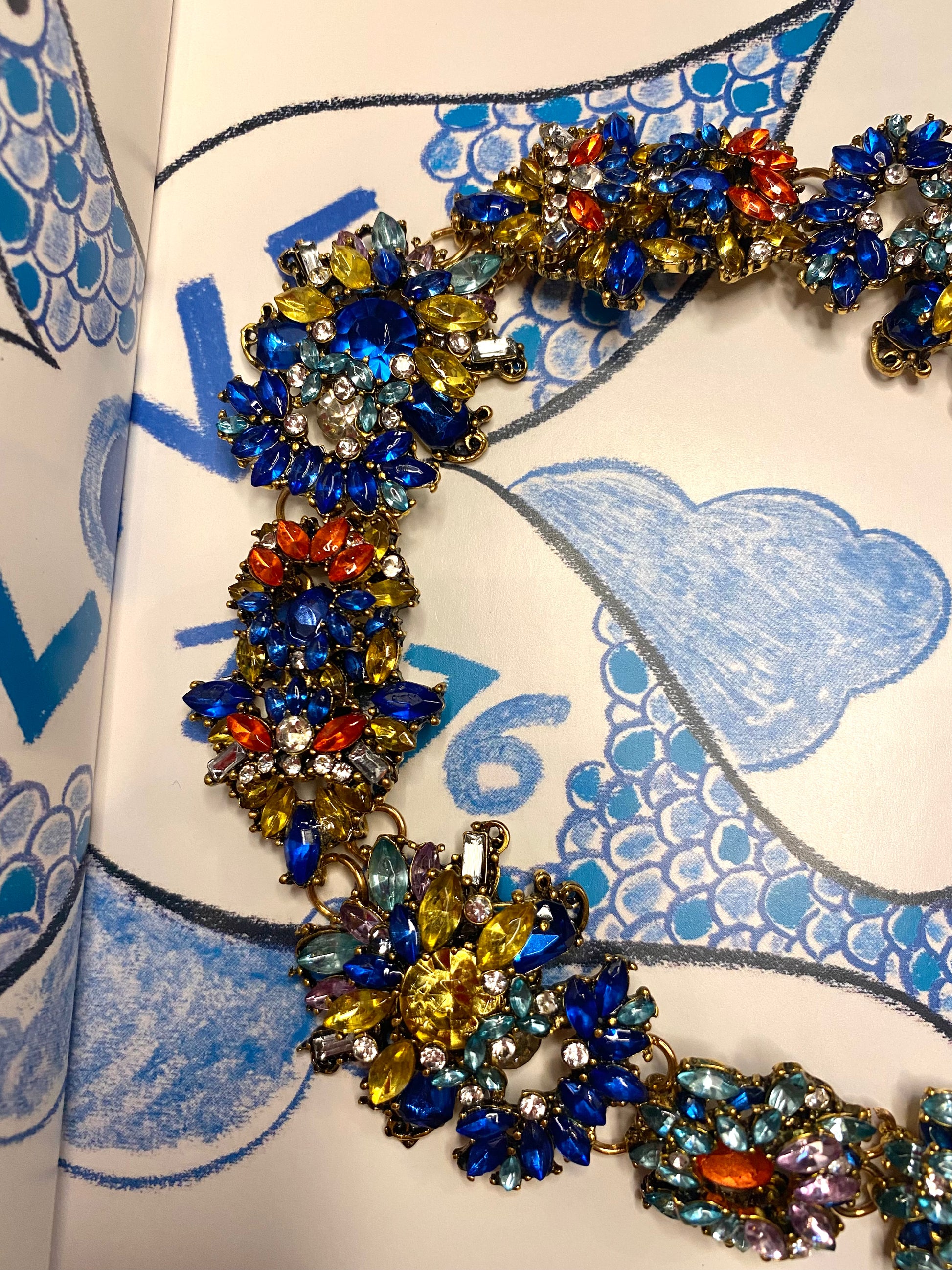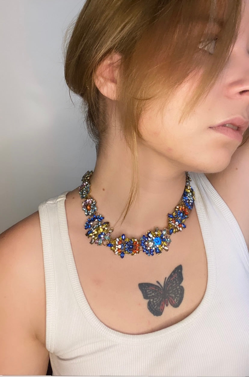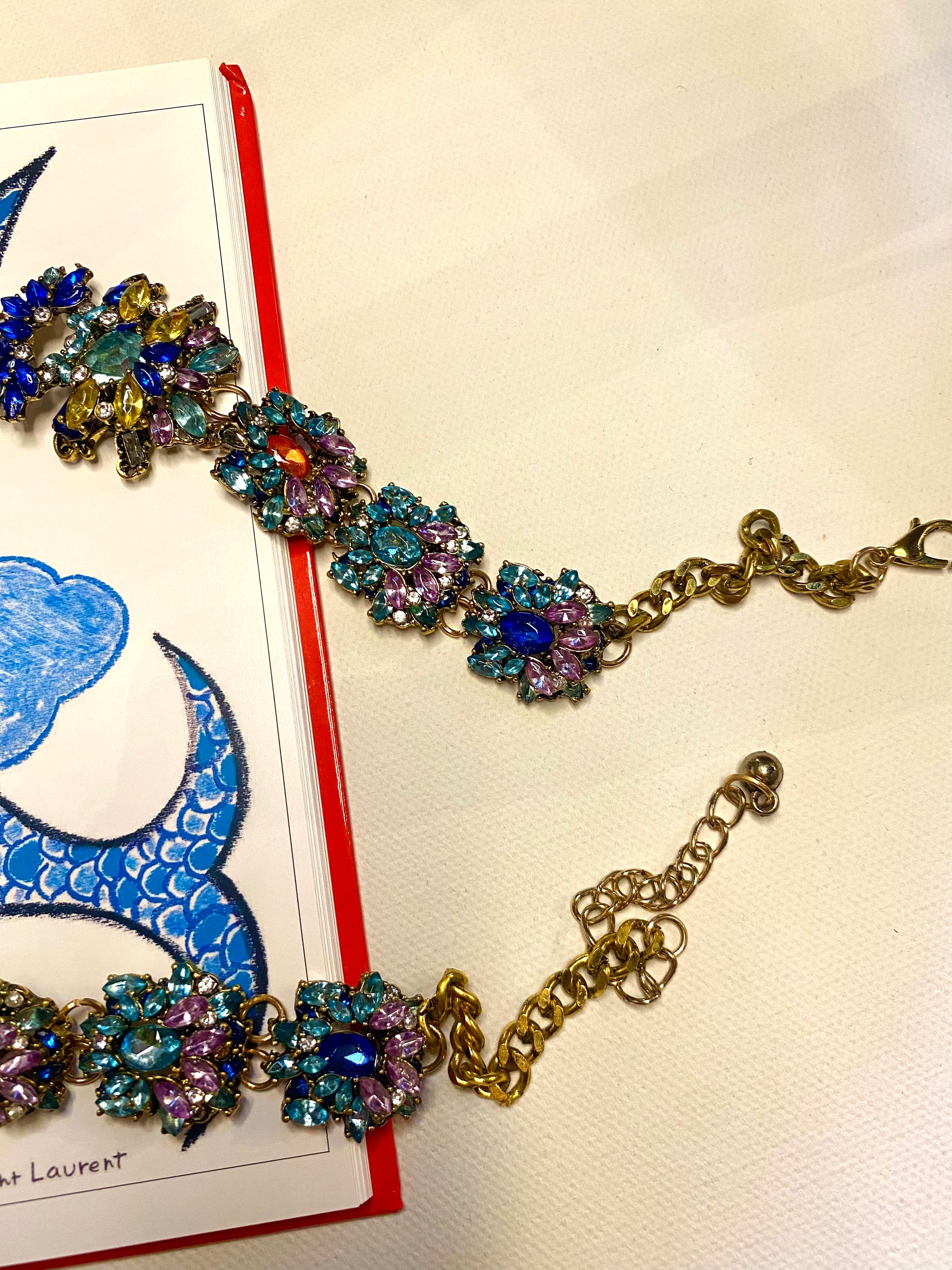 Ce collier vintage est constitué de gros cristaux colorés et il est en métal d’une couleur cuivrée. Un véritable collier raffiné et unique.