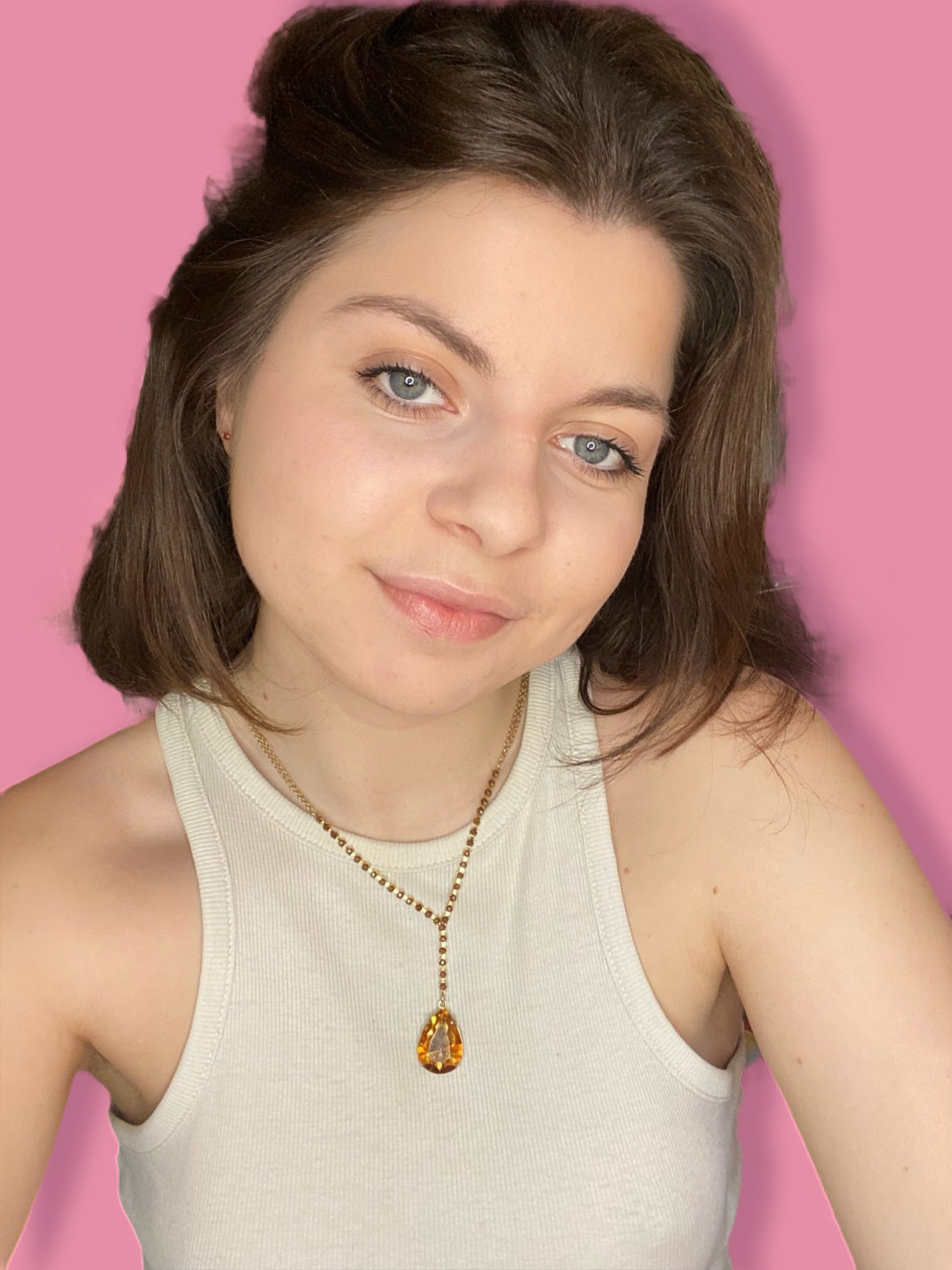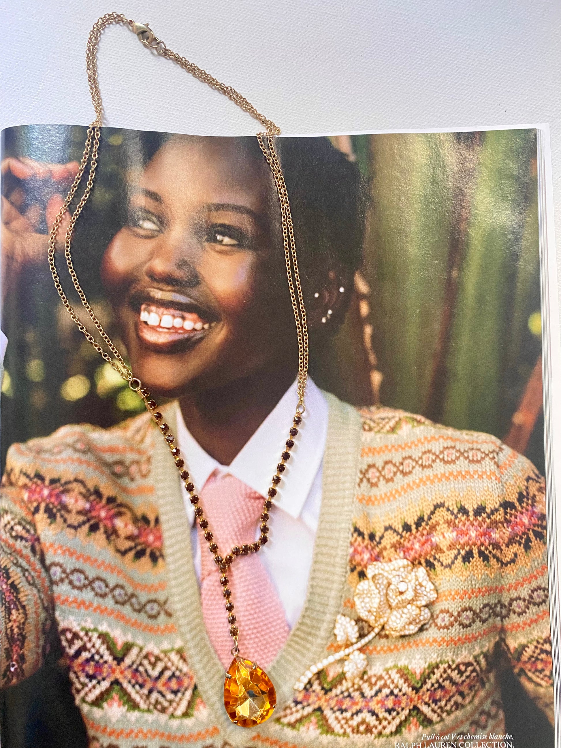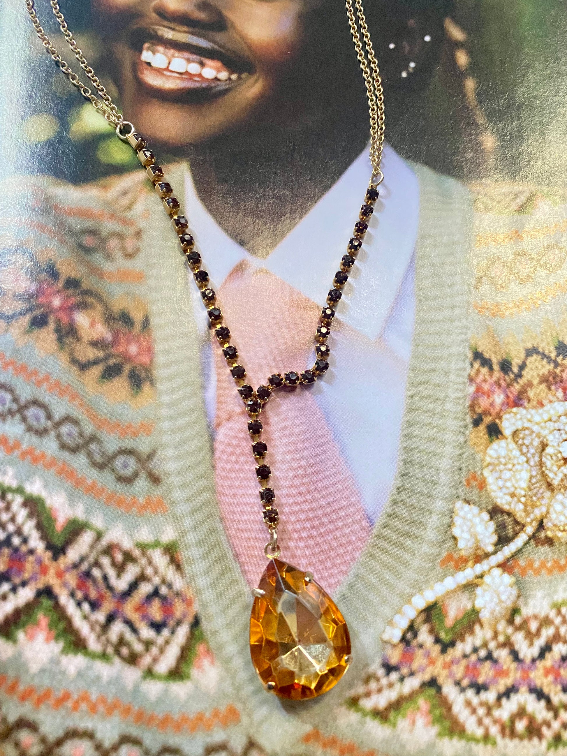 Collier vintage avec une double chaîne, de petits et un gros cristal orangés. Il est en métal couleur or.