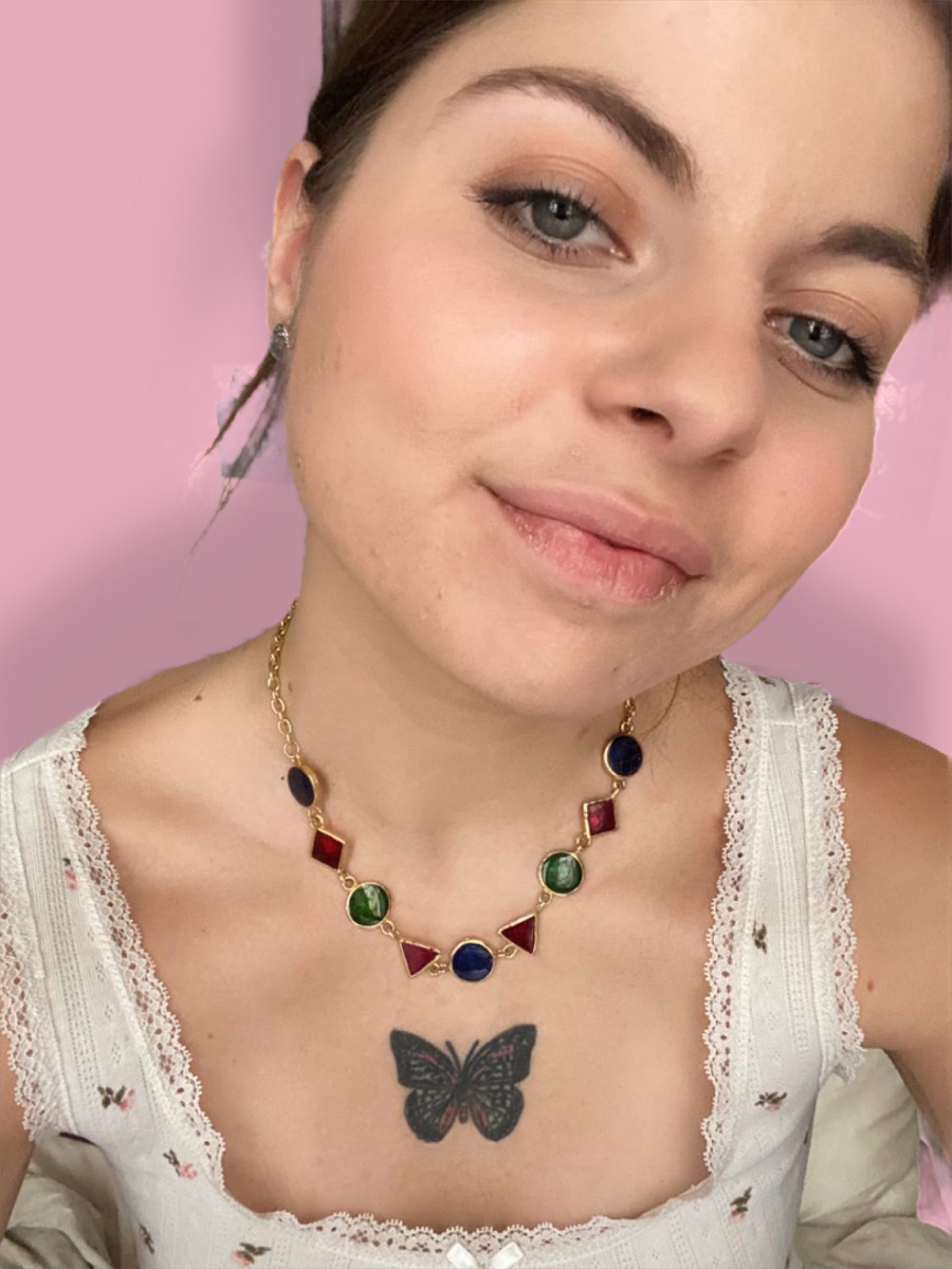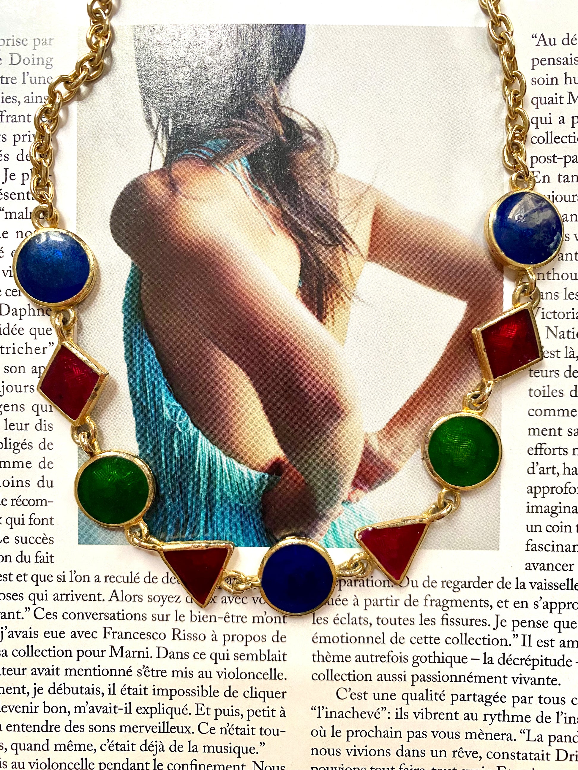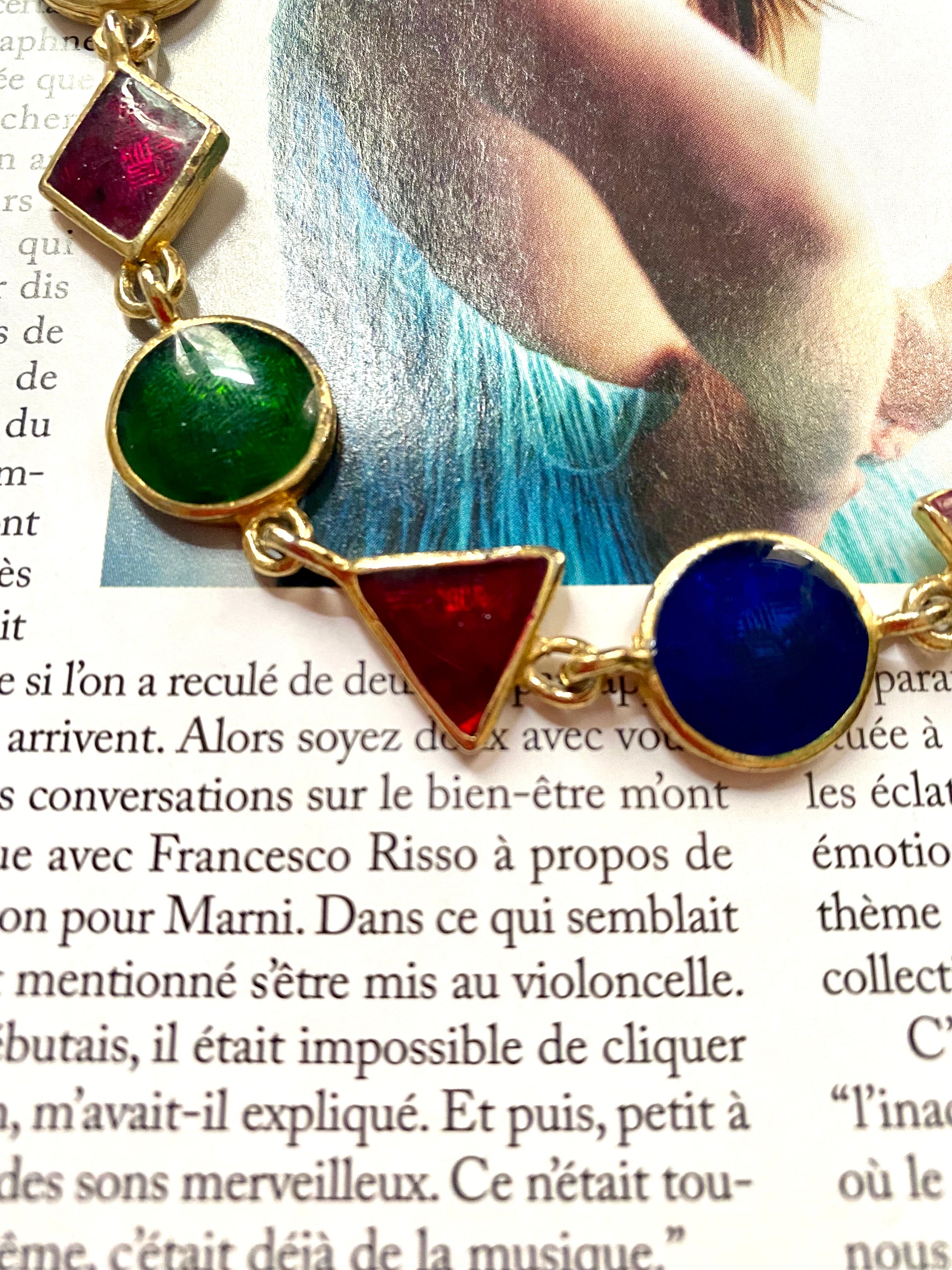 Très joli collier avec des formes géométriques bleues, rouges et vertes. Il est en métal couleur or.