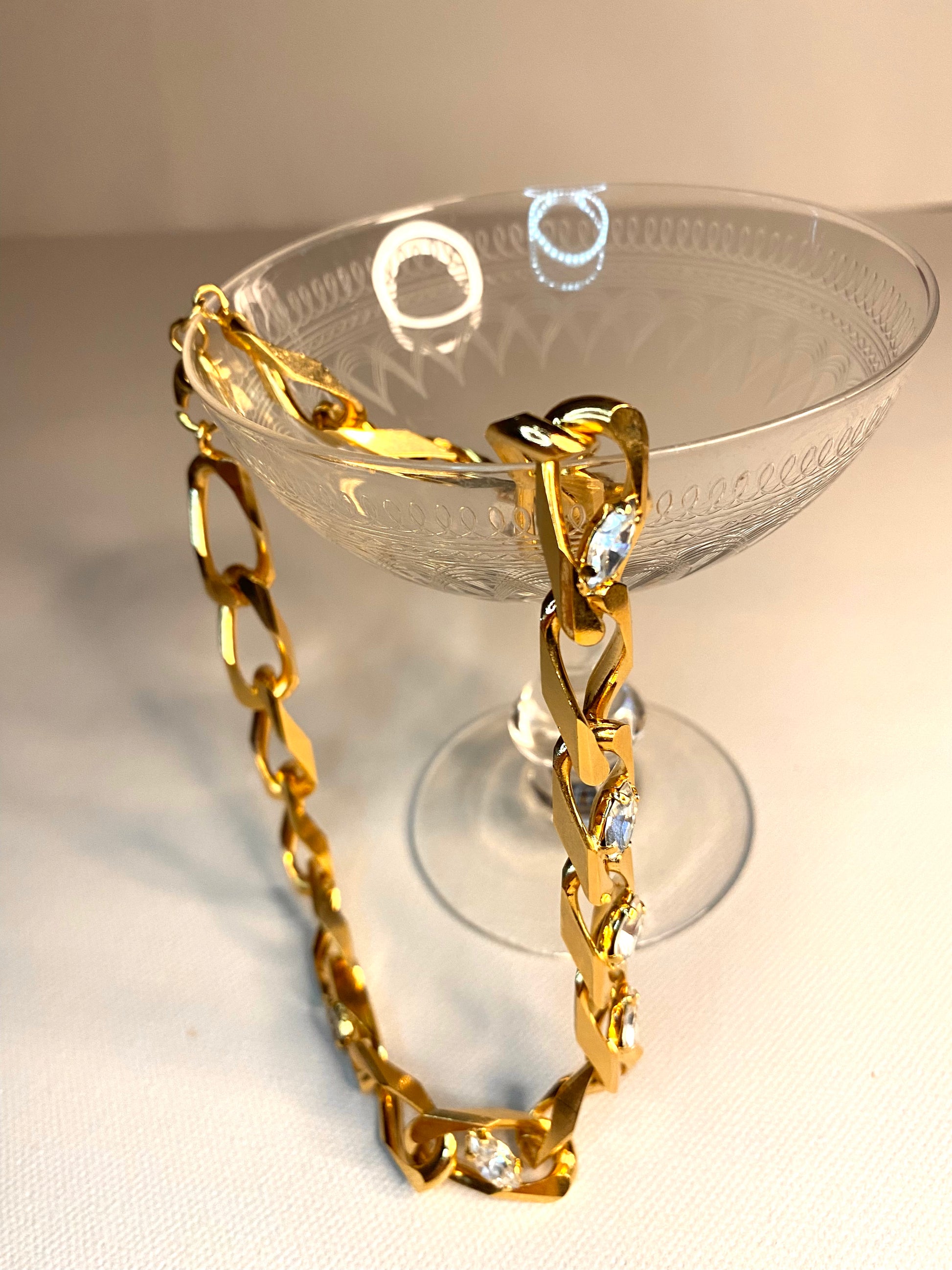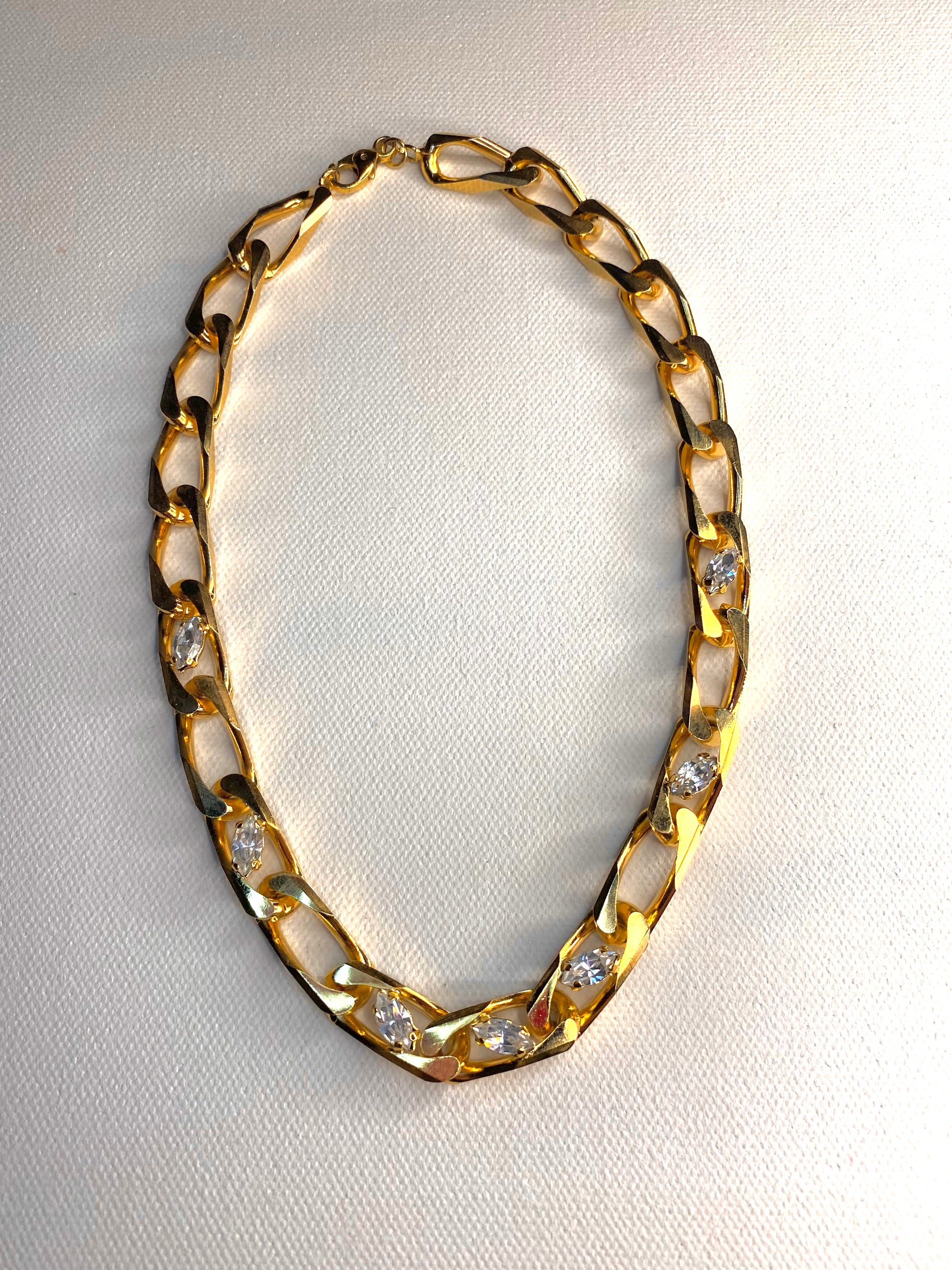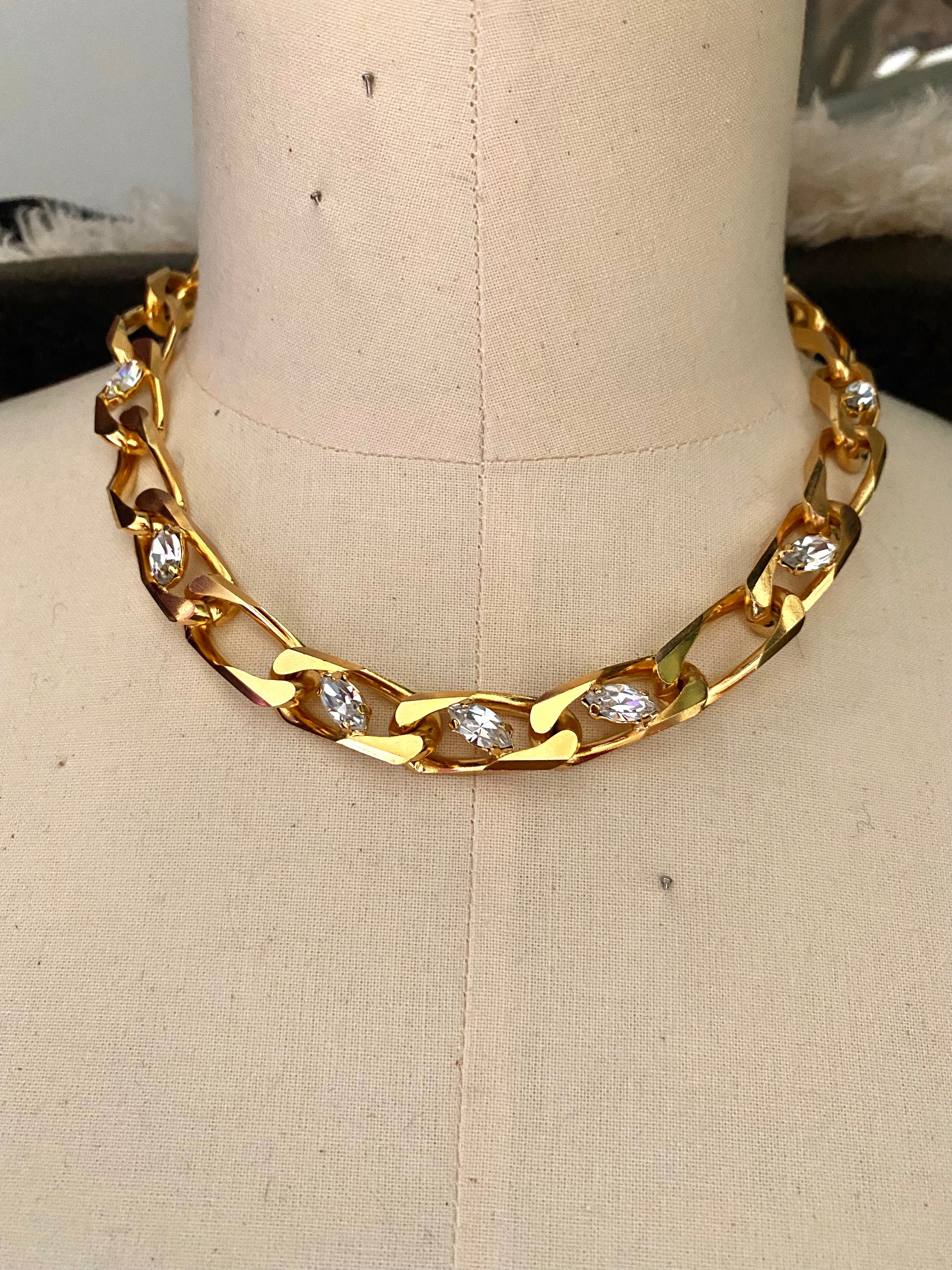 Ce collier plaqué or avec des pierres en verre a été déniché chez un antiquaire parisien et c’était le coup de foudre au premier regard. Une pièce forte pour compléter ou faire tout un look.