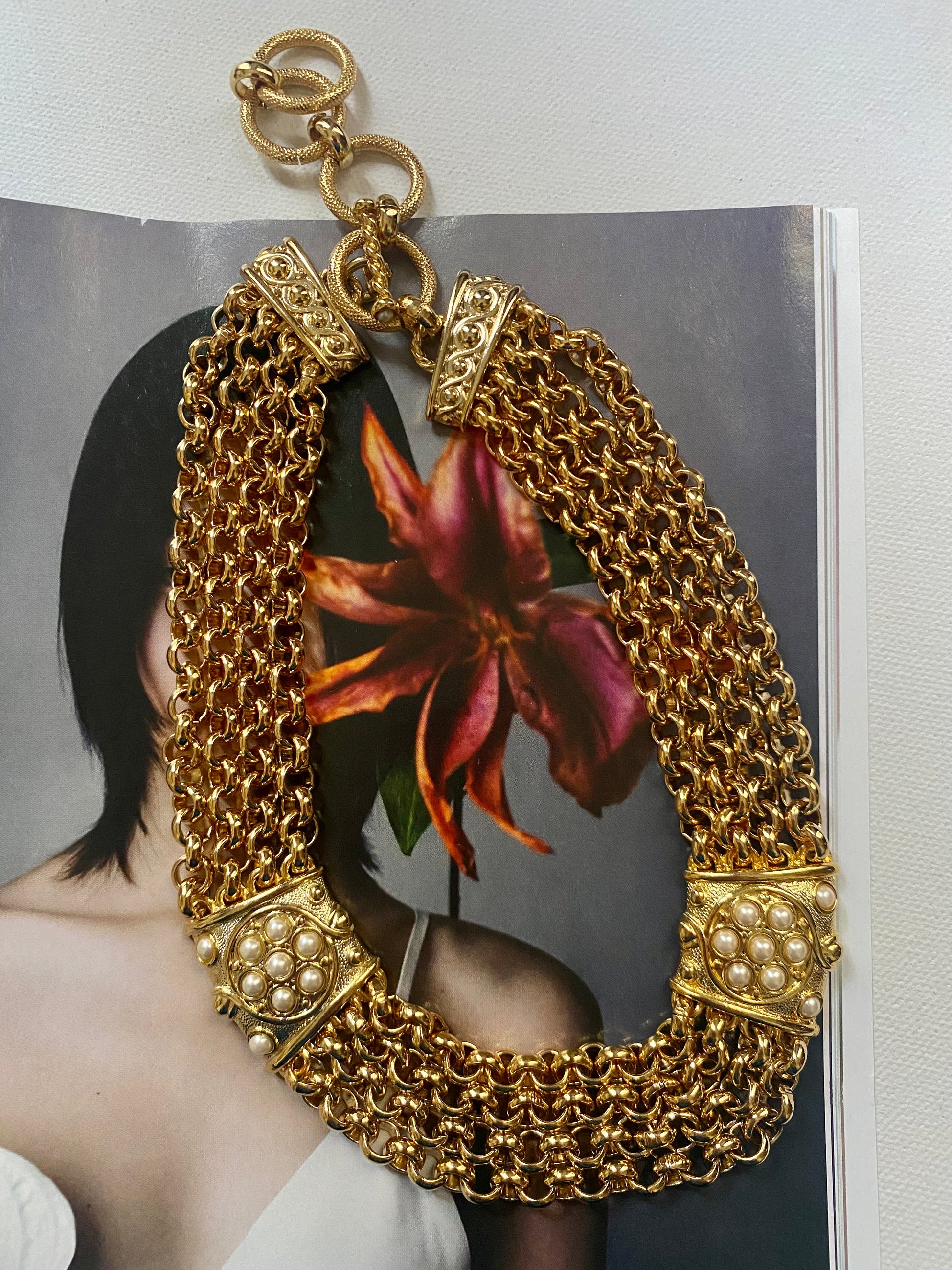 Collier vintage multiples chaînes en plaqué or avec des perles d’eau douce. Le tombé est sublime ! Le fermoir permet de le régler plus long ou plus court que sur la photo porté pour en faire un vrai ras de cou!