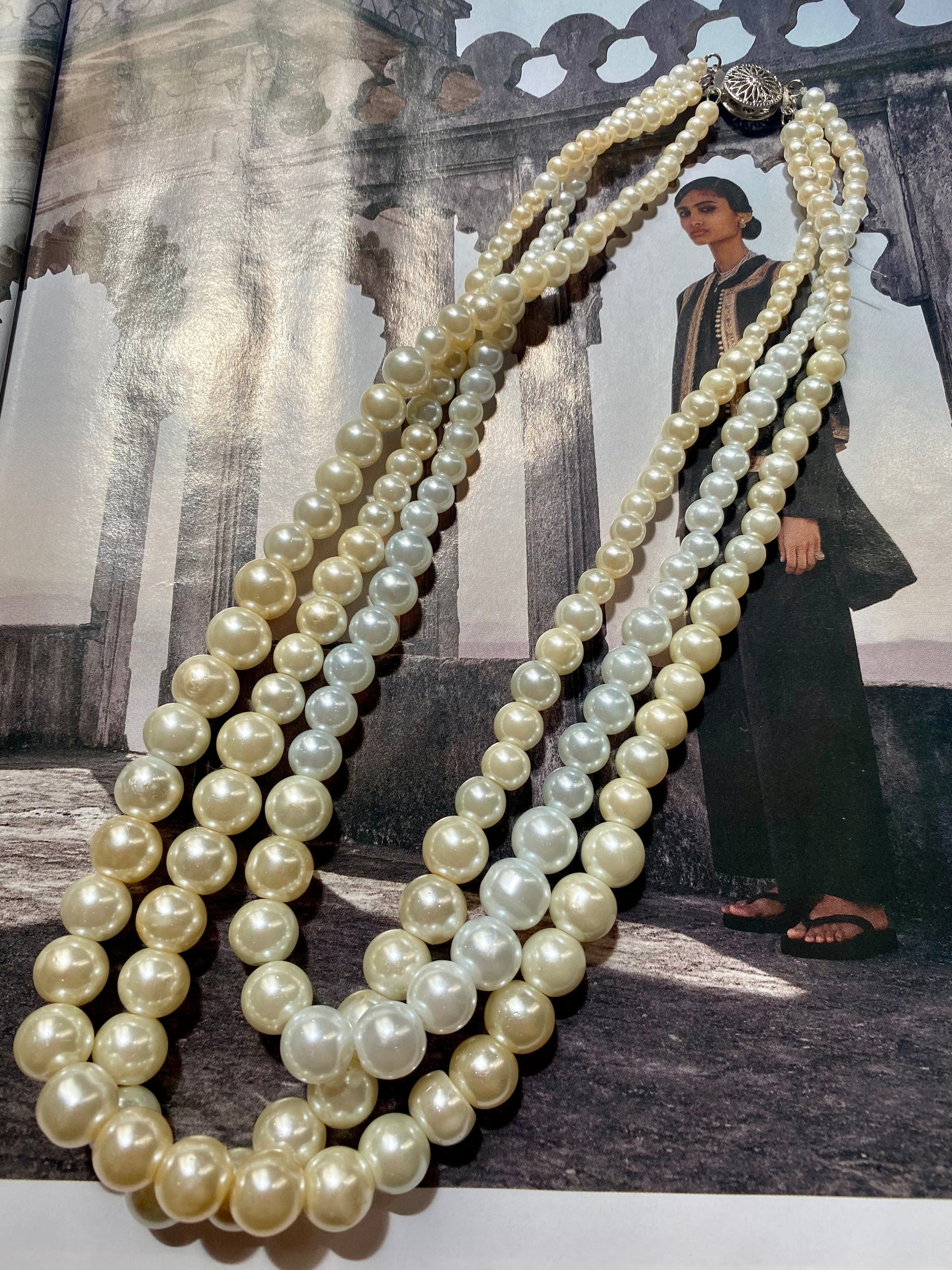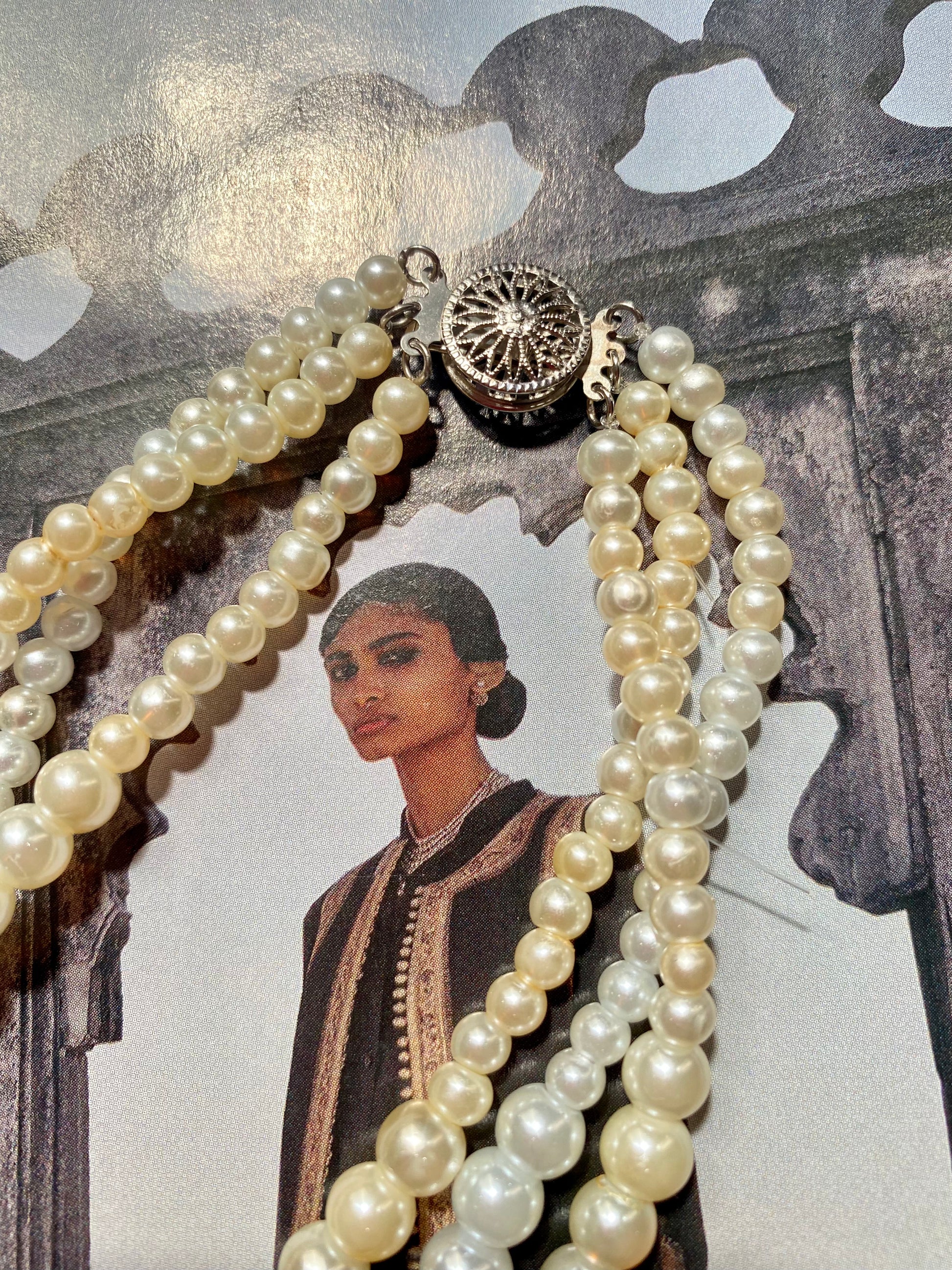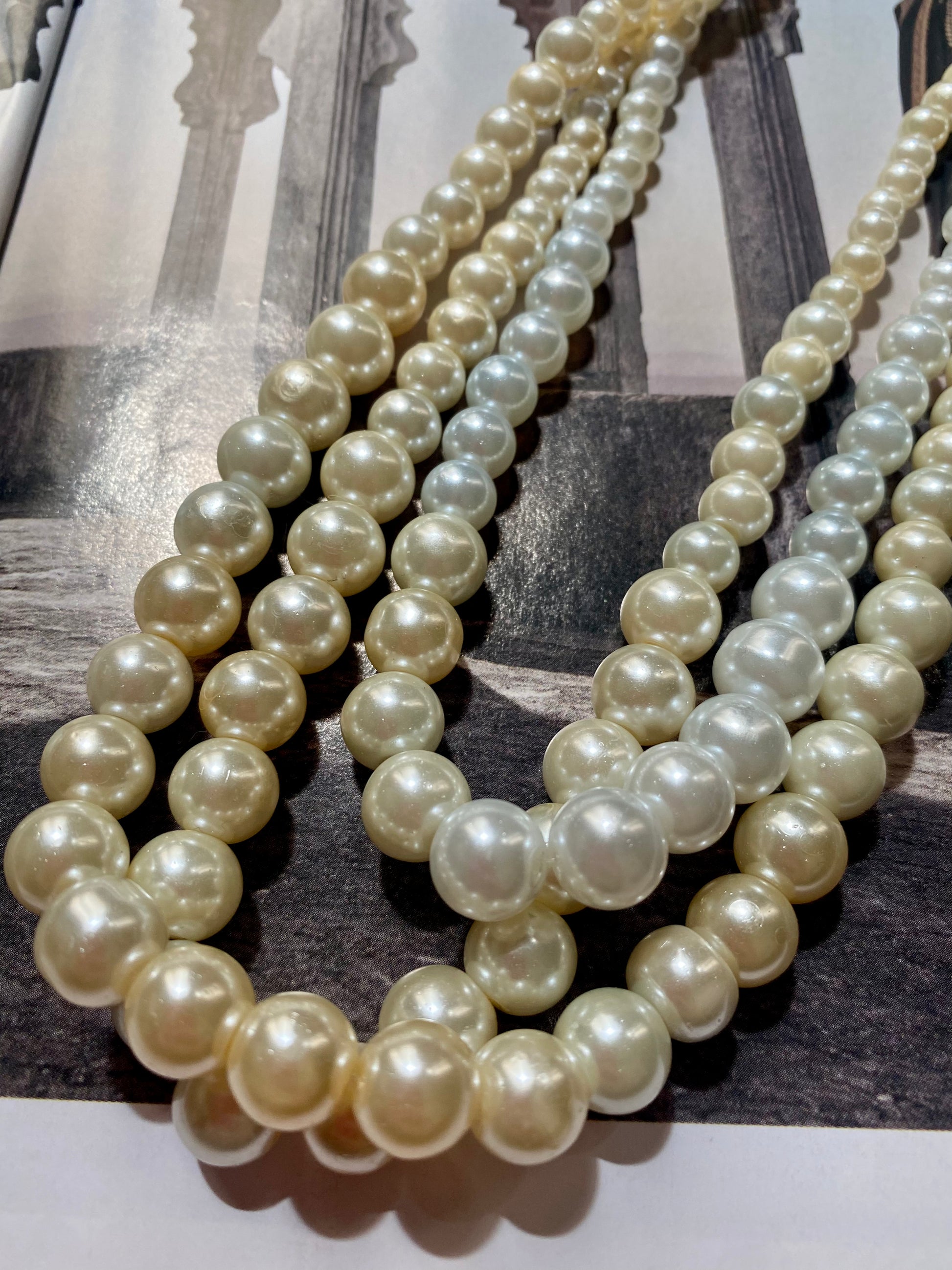 Ce collier de perles fantaisies possède 3 rangs et un joli fermoir vintage. Les perles sont mélangées entre le blanc et le blanc cassé, ce qui rajoute un côté unique et moderne au collier.