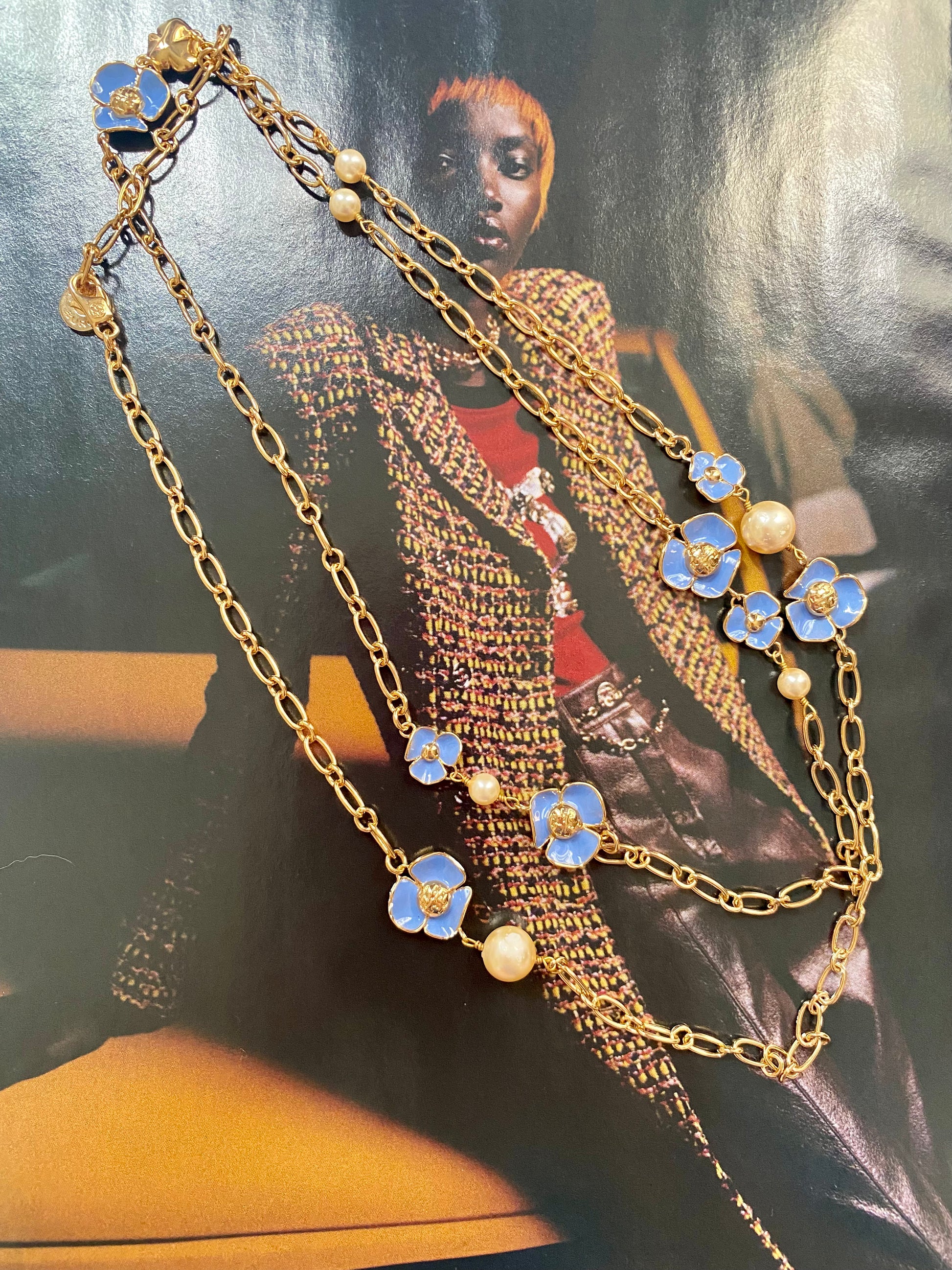 Sautoir vintage signé Tory Burch, à porter aussi en double ou triple tour. Plaqué or, perles de culture et nacre.
