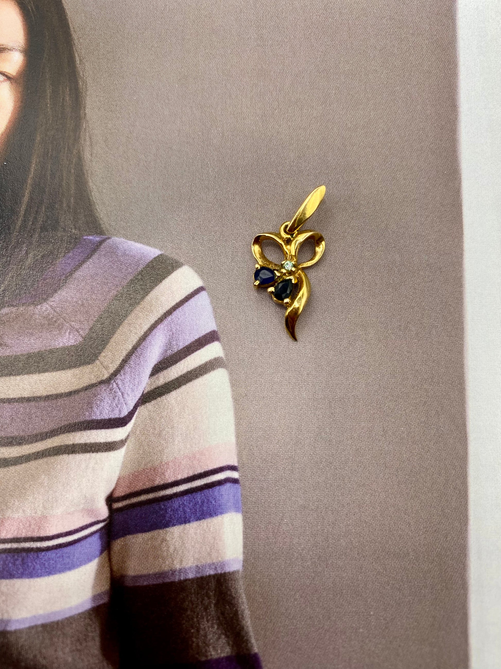 EN/ Small gold-plated 9K pendant of a very nice quality, with two dark blue and one white zirconiums.