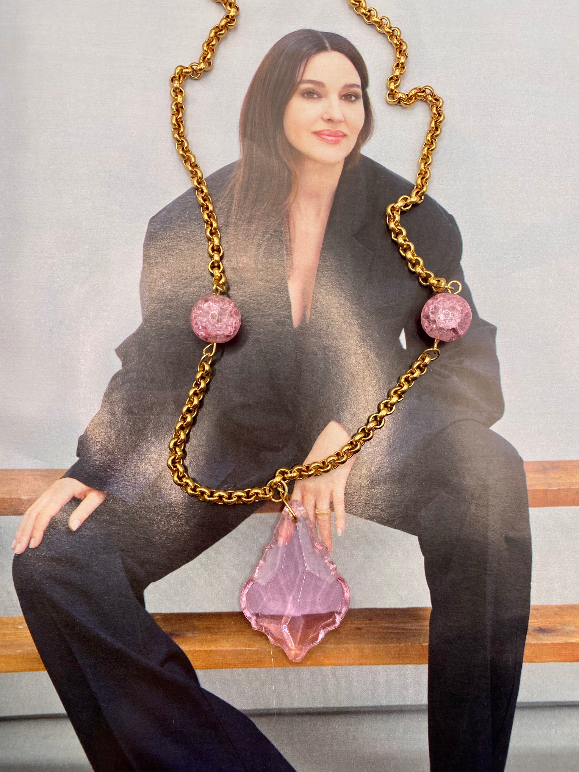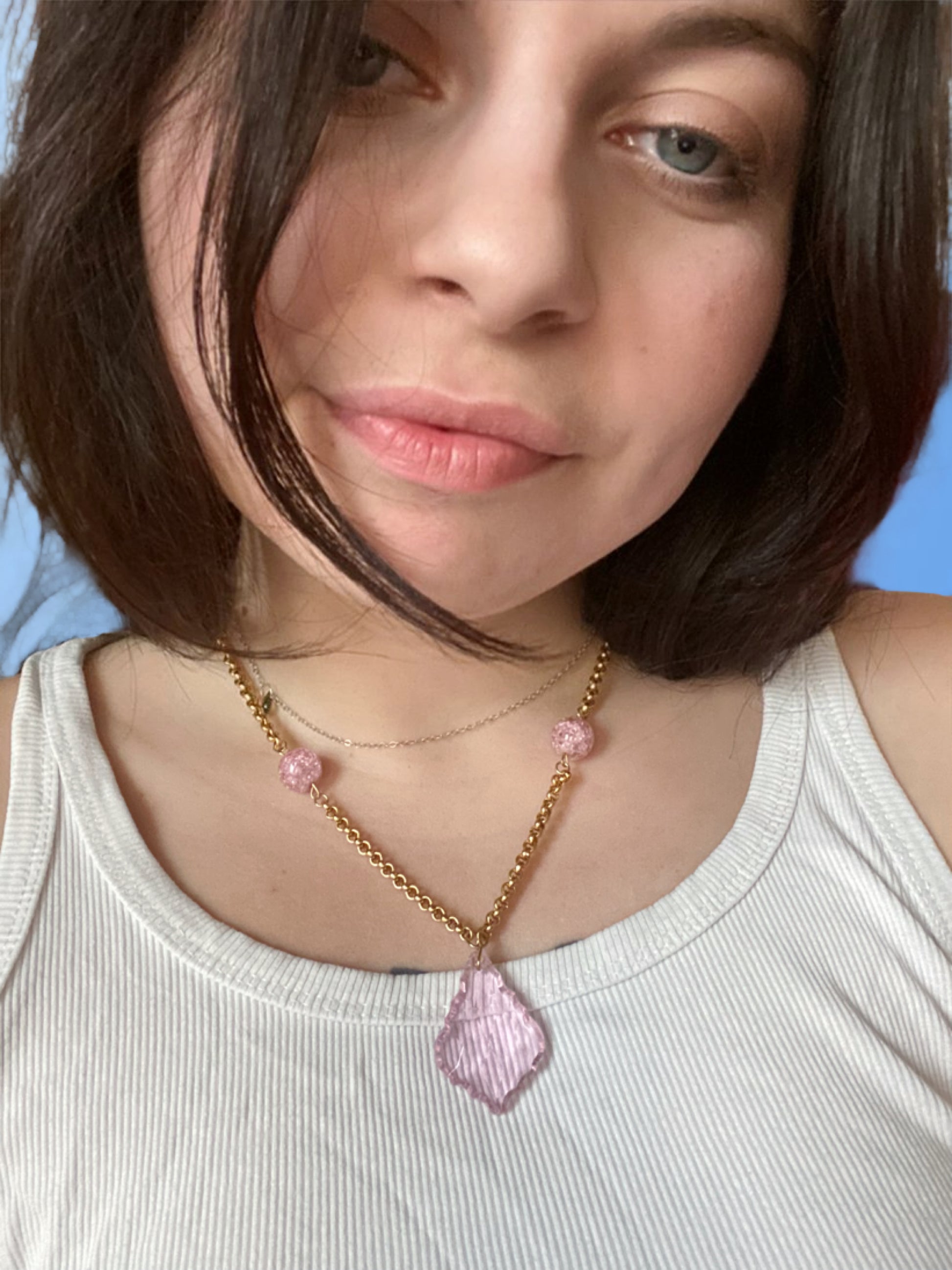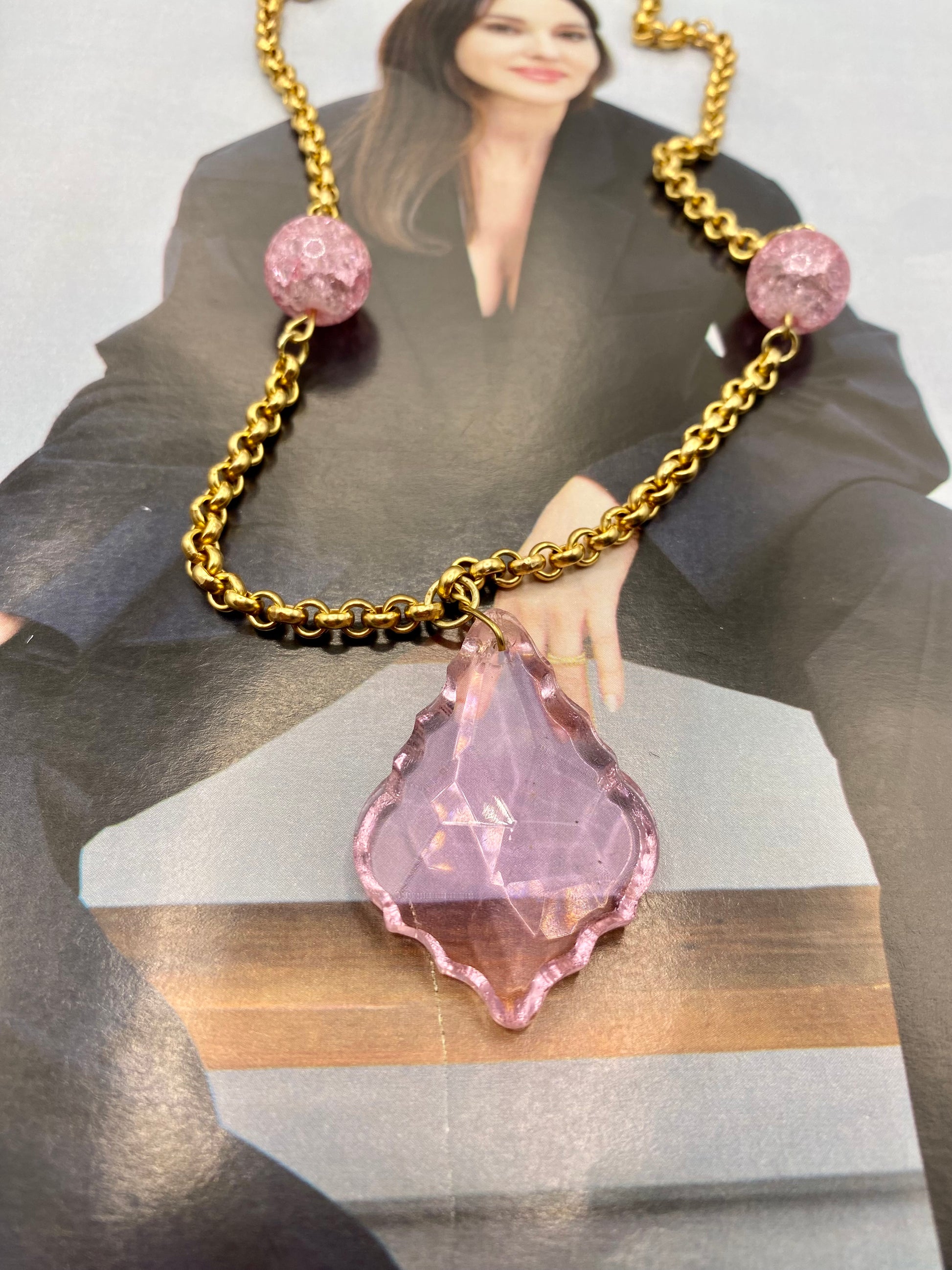 EN/ This fantasy necklace is adorable with its golden chain and pretty pink resin. It is a perfect mix of chic and fun. It can go with absolutely all looks!