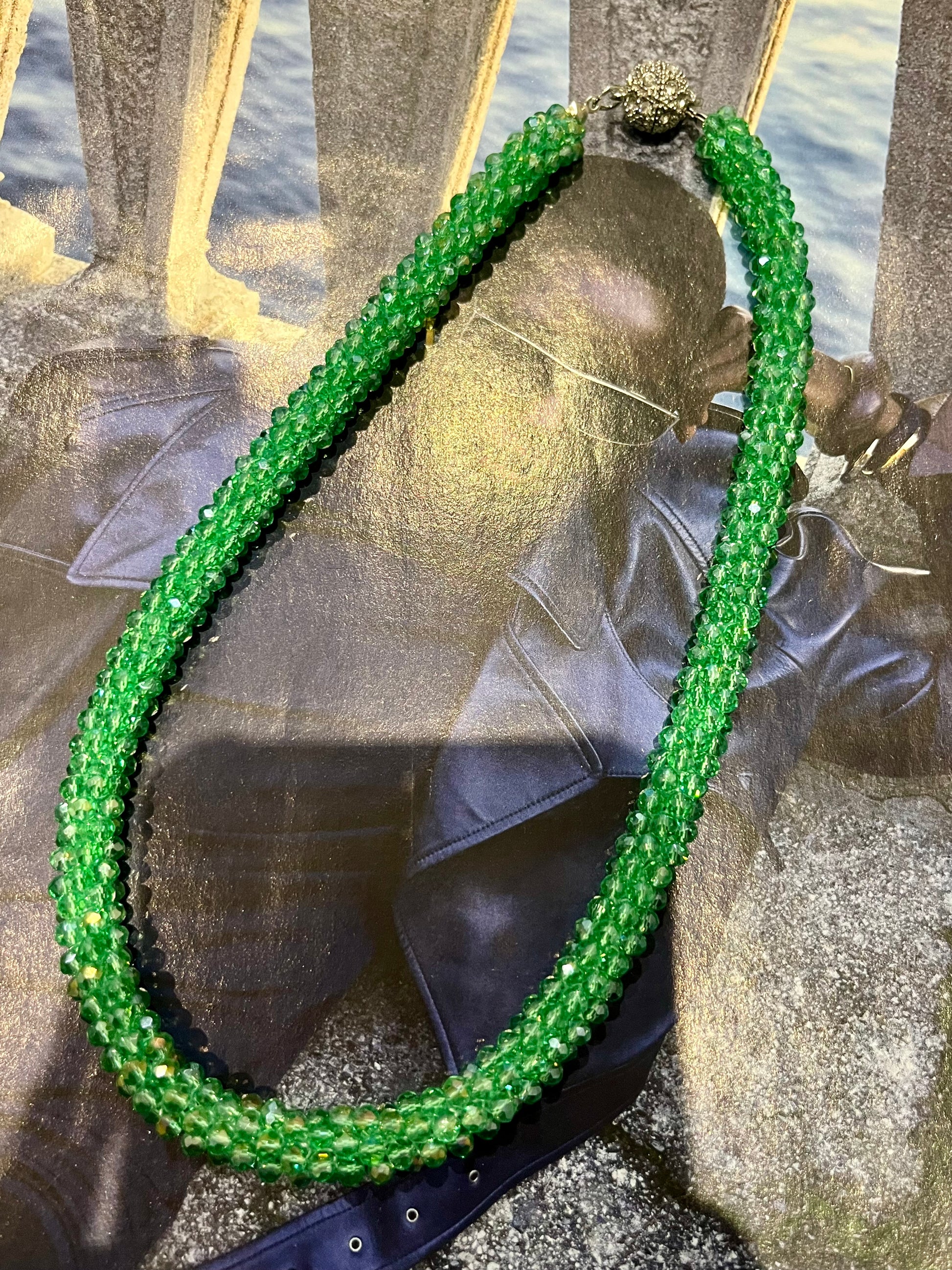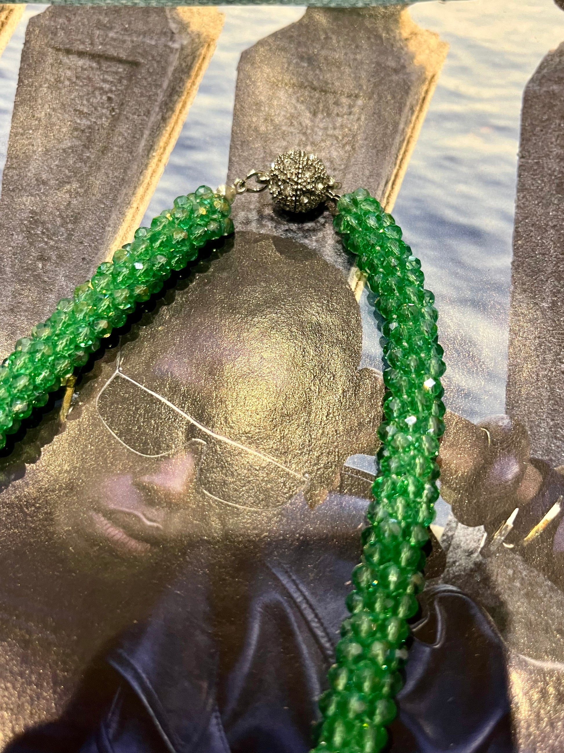 FR/ Collier fantaisie de perles vertes très lumineuses qui brillent de par le mouvement du bijou et avec un fermoir très original avec des strass qui est aimanté. Véritable pièce typique des années 1980.