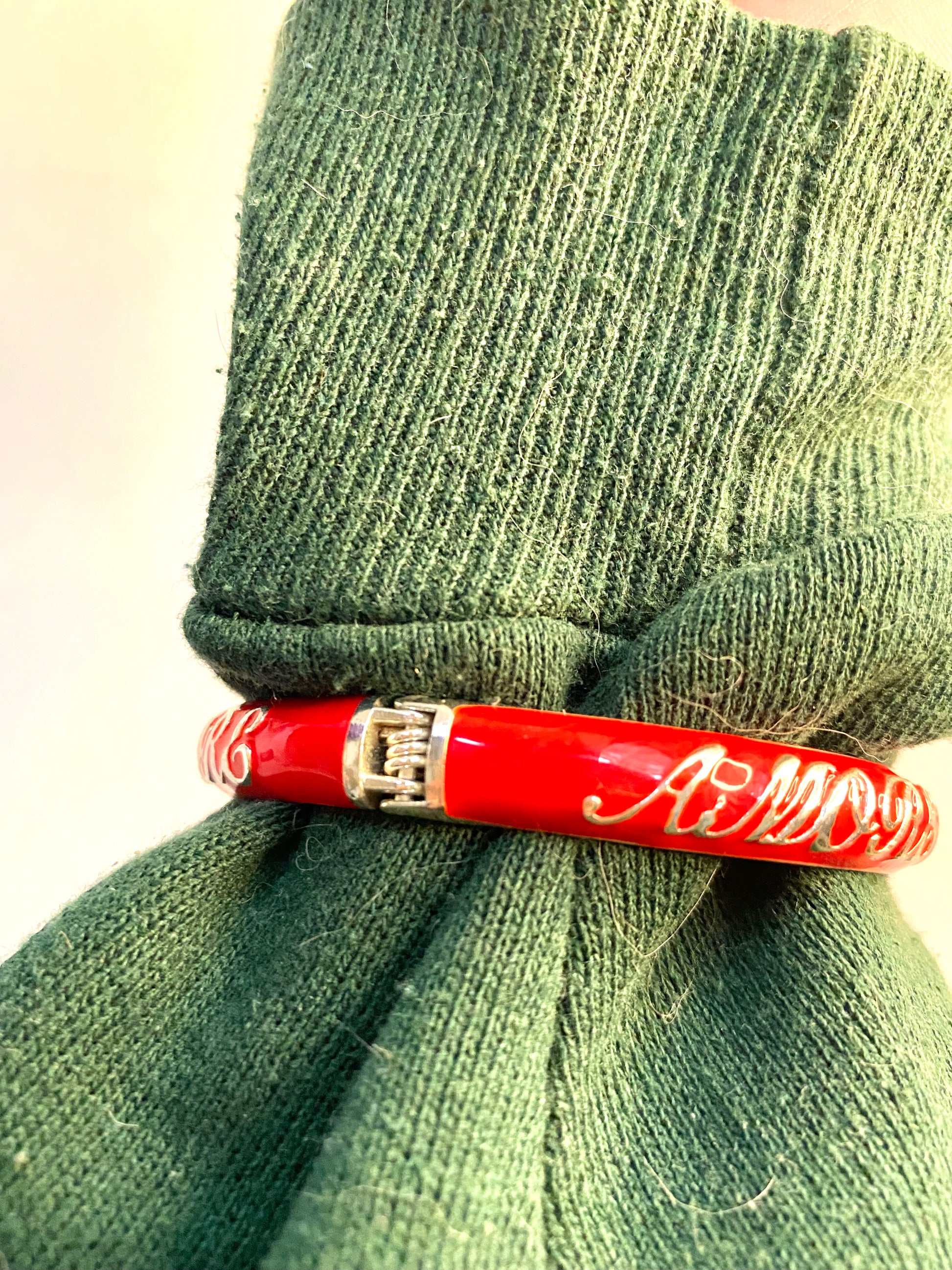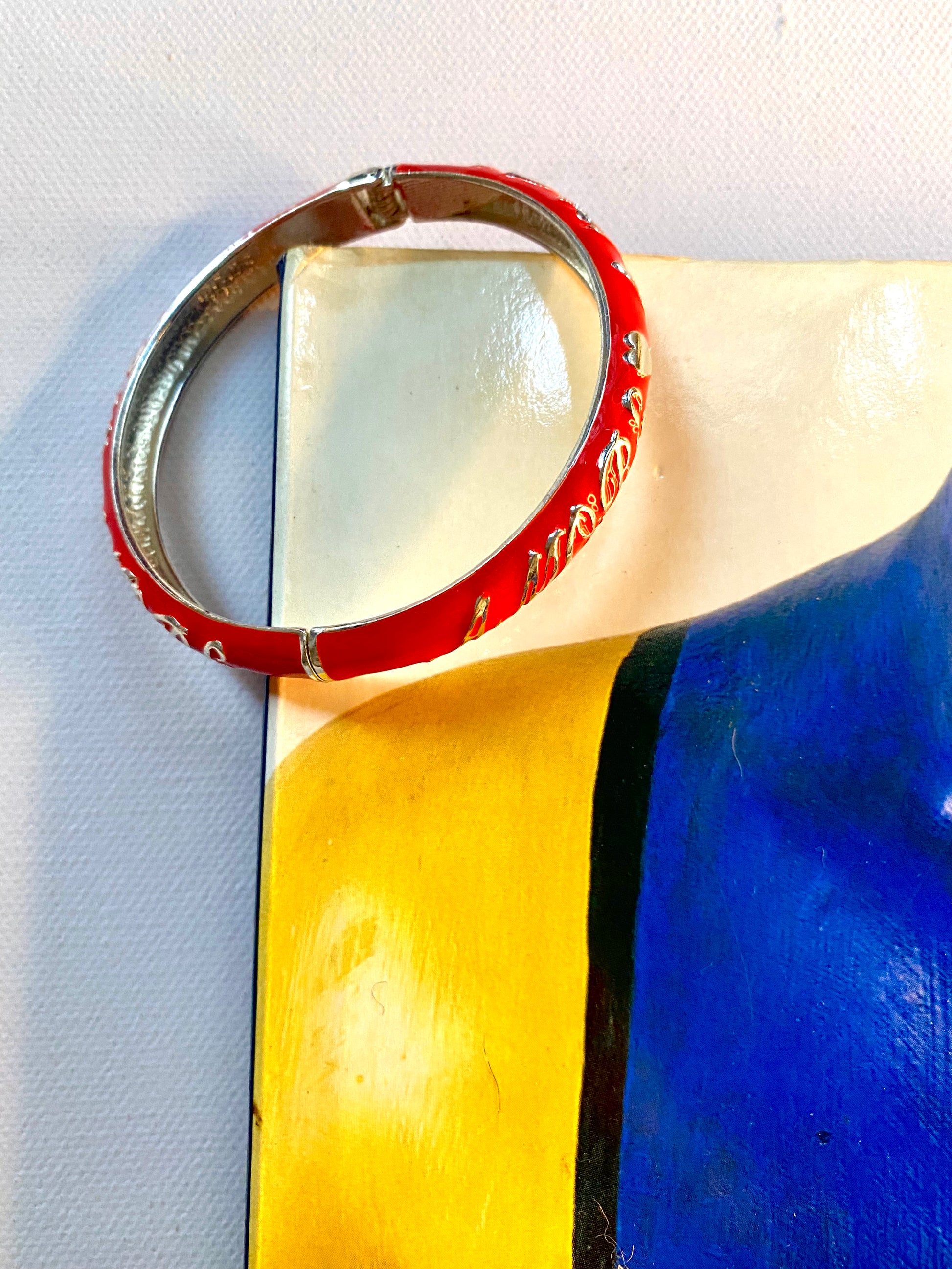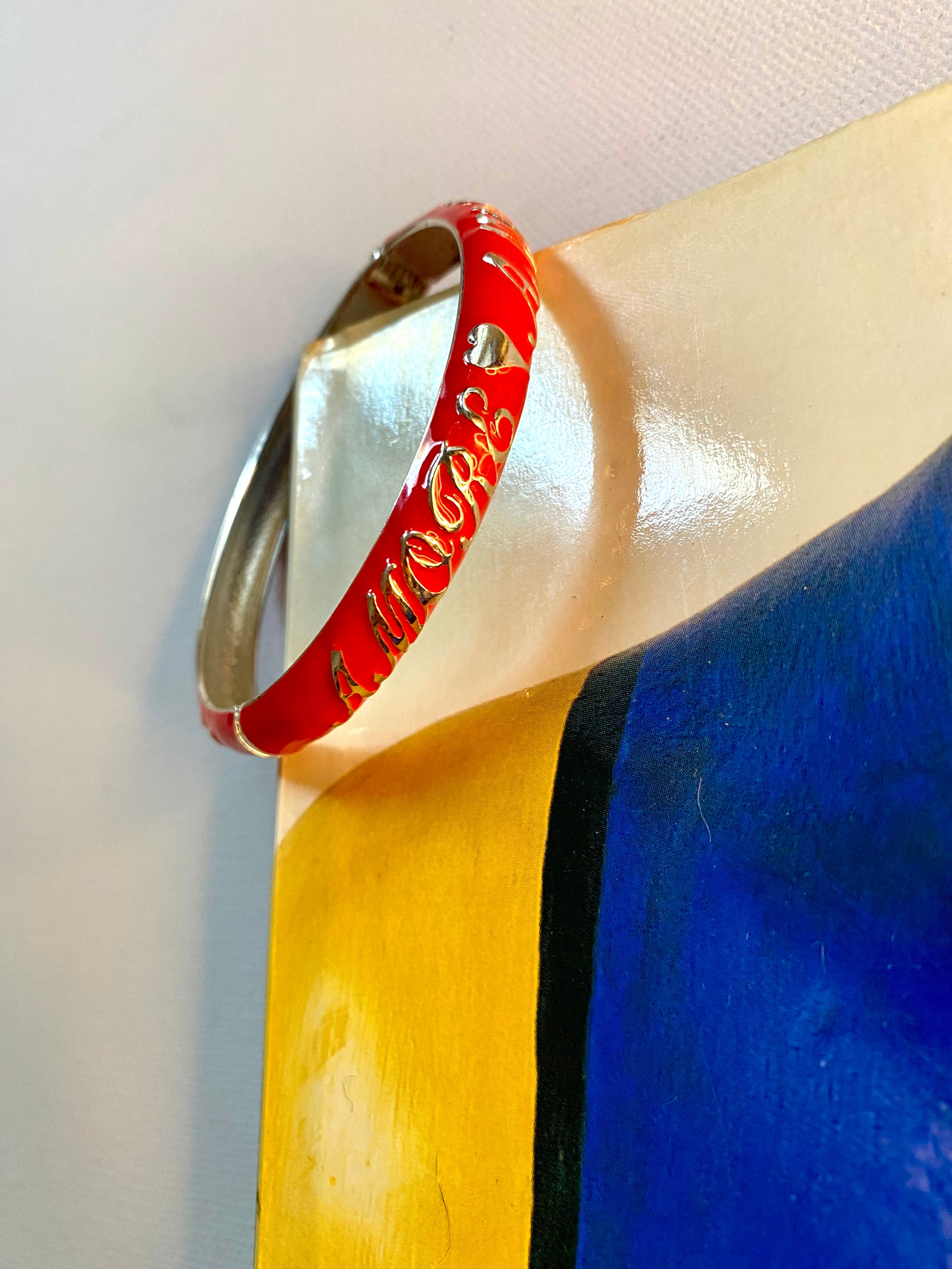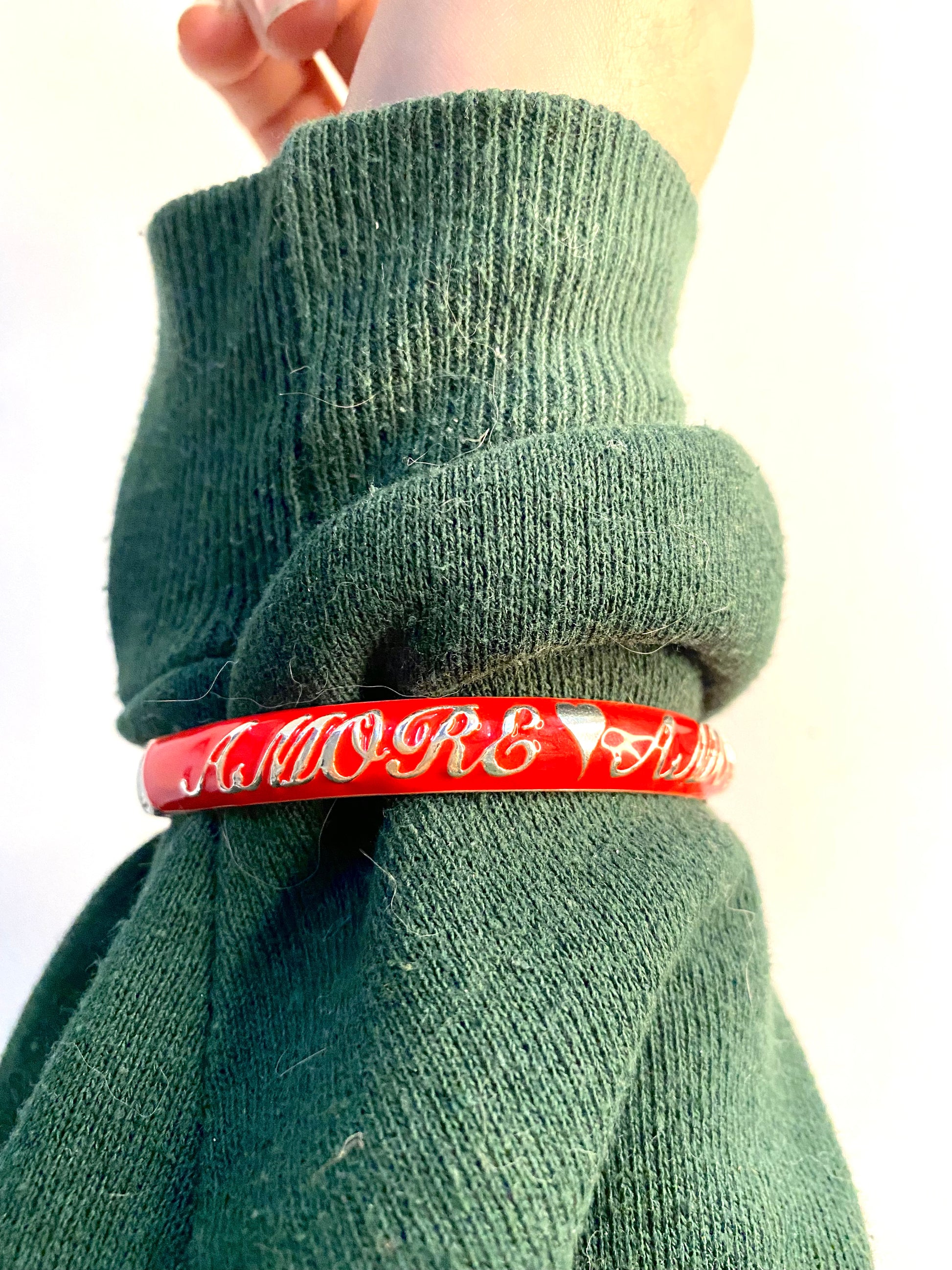 FR/ Bracelet jonc en acier inoxydable argenté et rouge, avec le mot « amore » dessiné ainsi qu’un cœur.