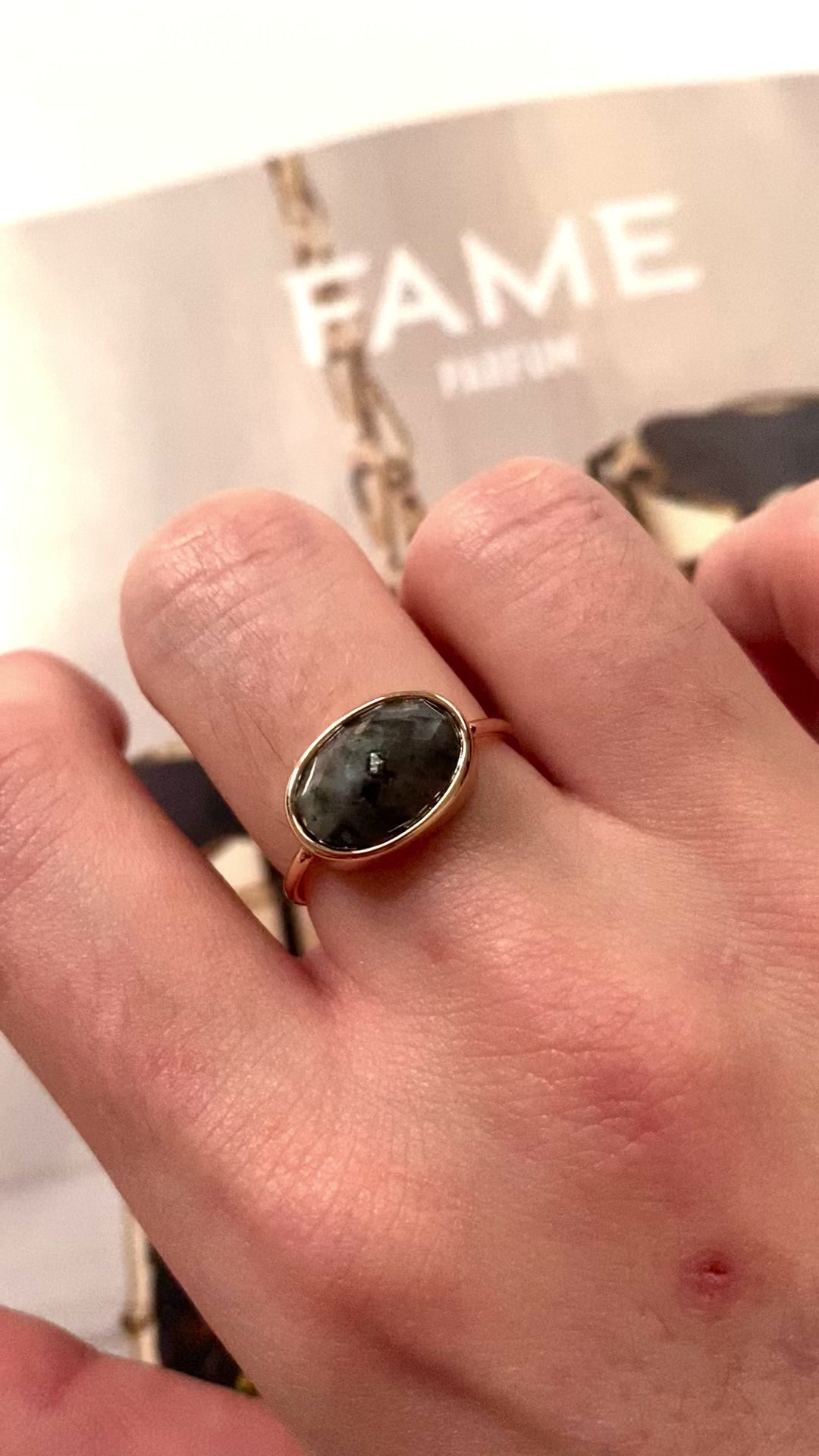 Bague dorée à l’or fin rosé avec une labradorite. Taille 54fr.