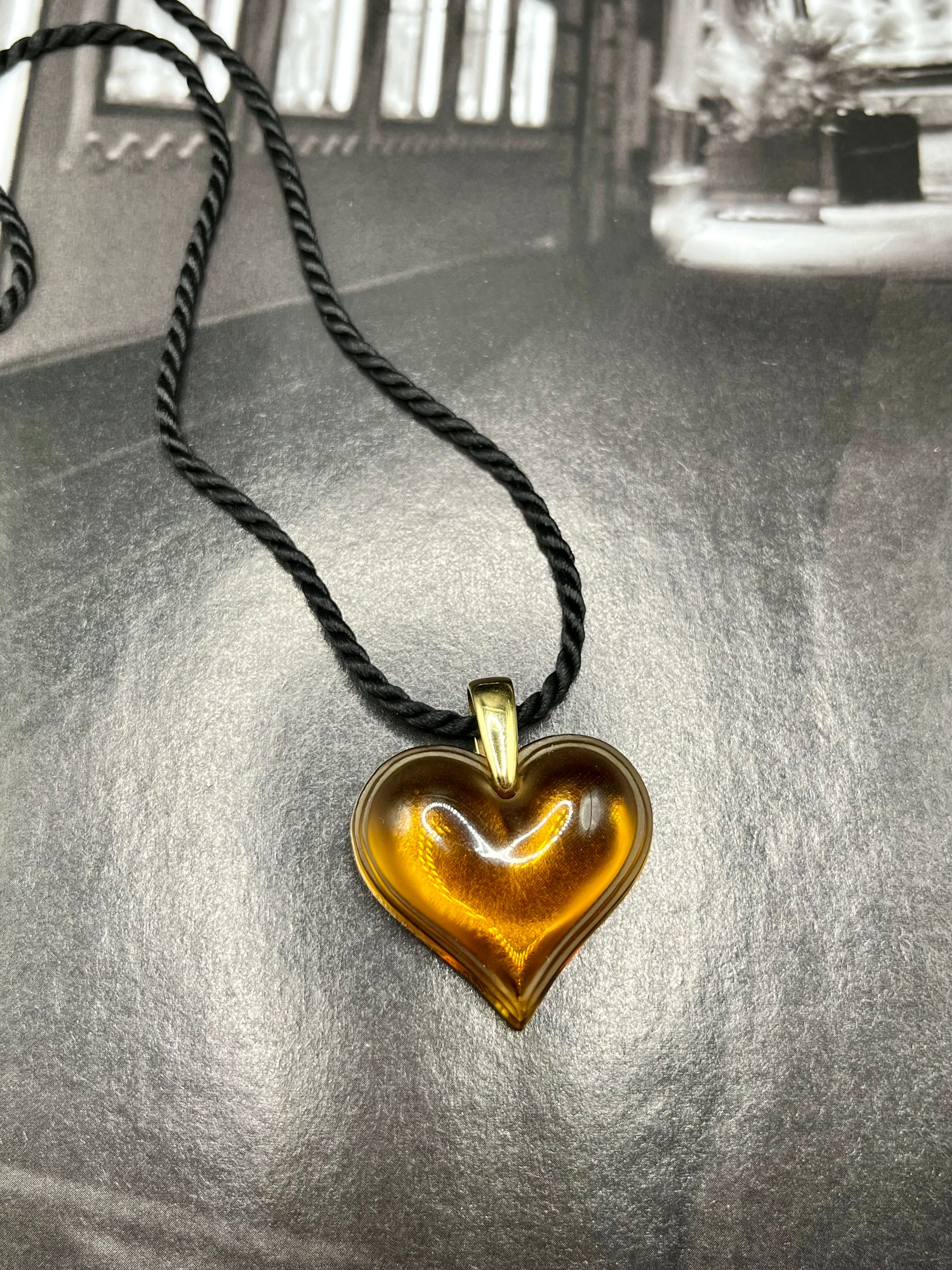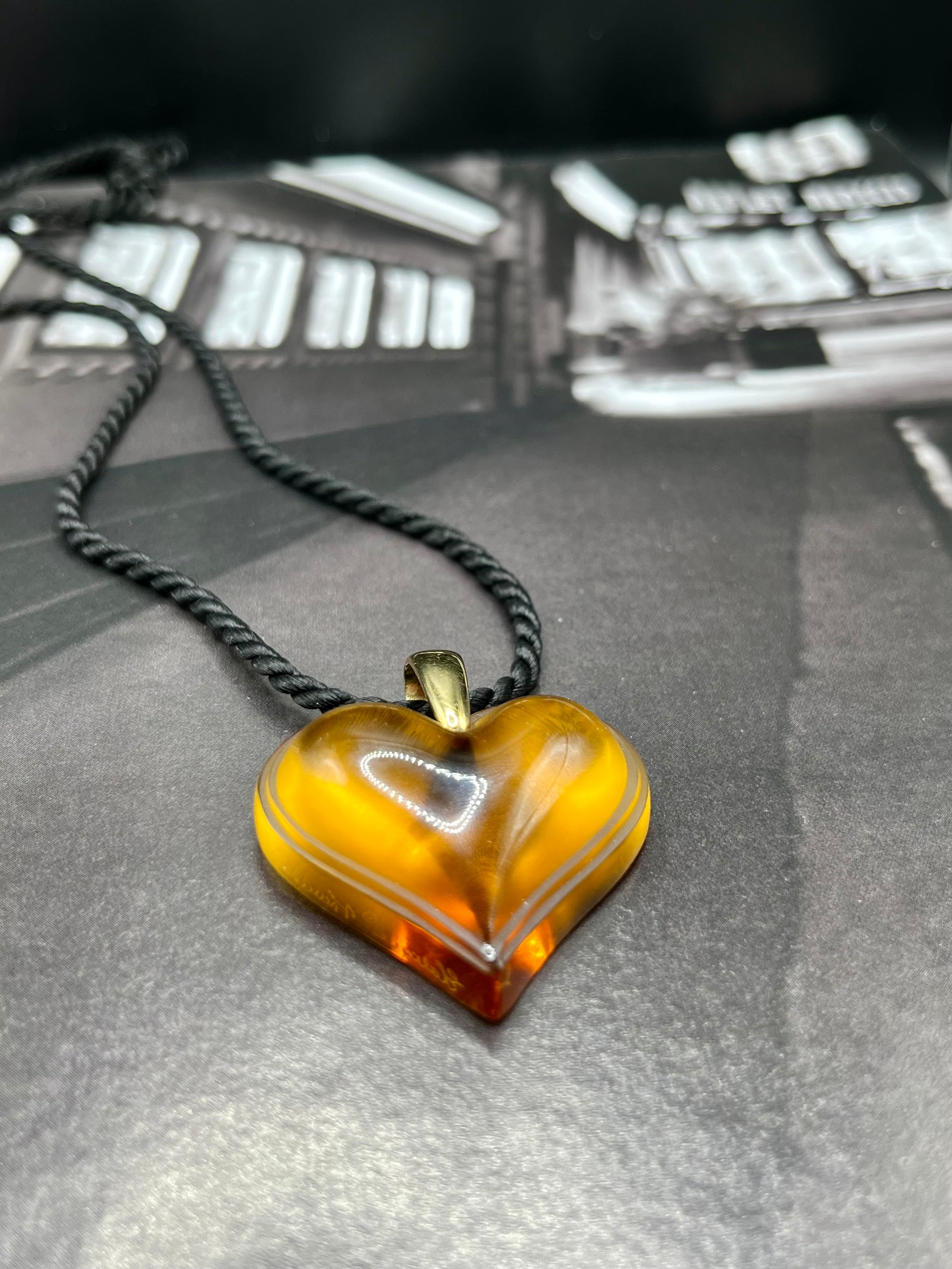 EN/ Exceptional piece signed Lalique in amber crystal from their famous "Amoureuse beaucoup" collection. The heart is signed by engraving as well as the belière which is gold-plated. The cord is original.