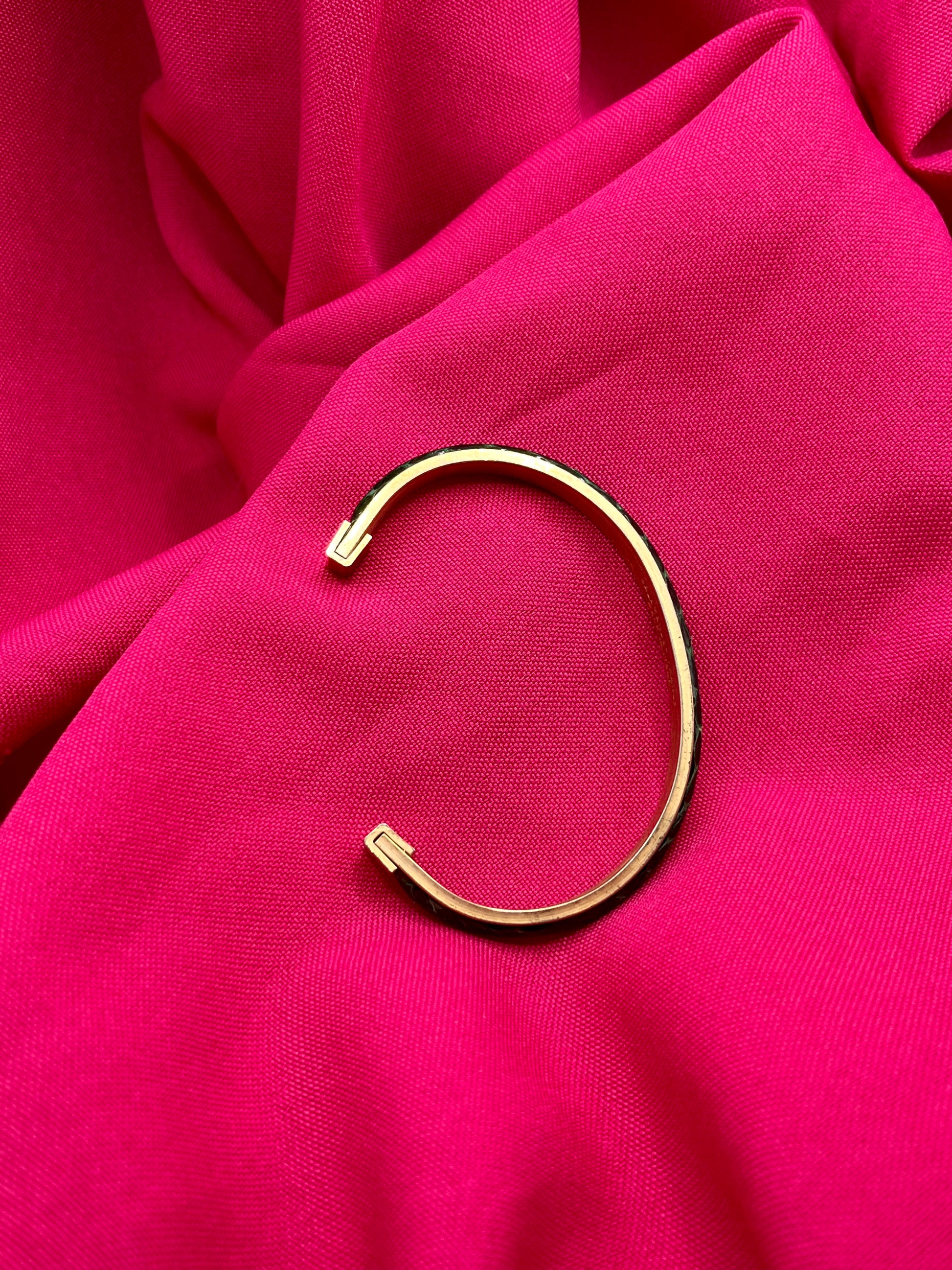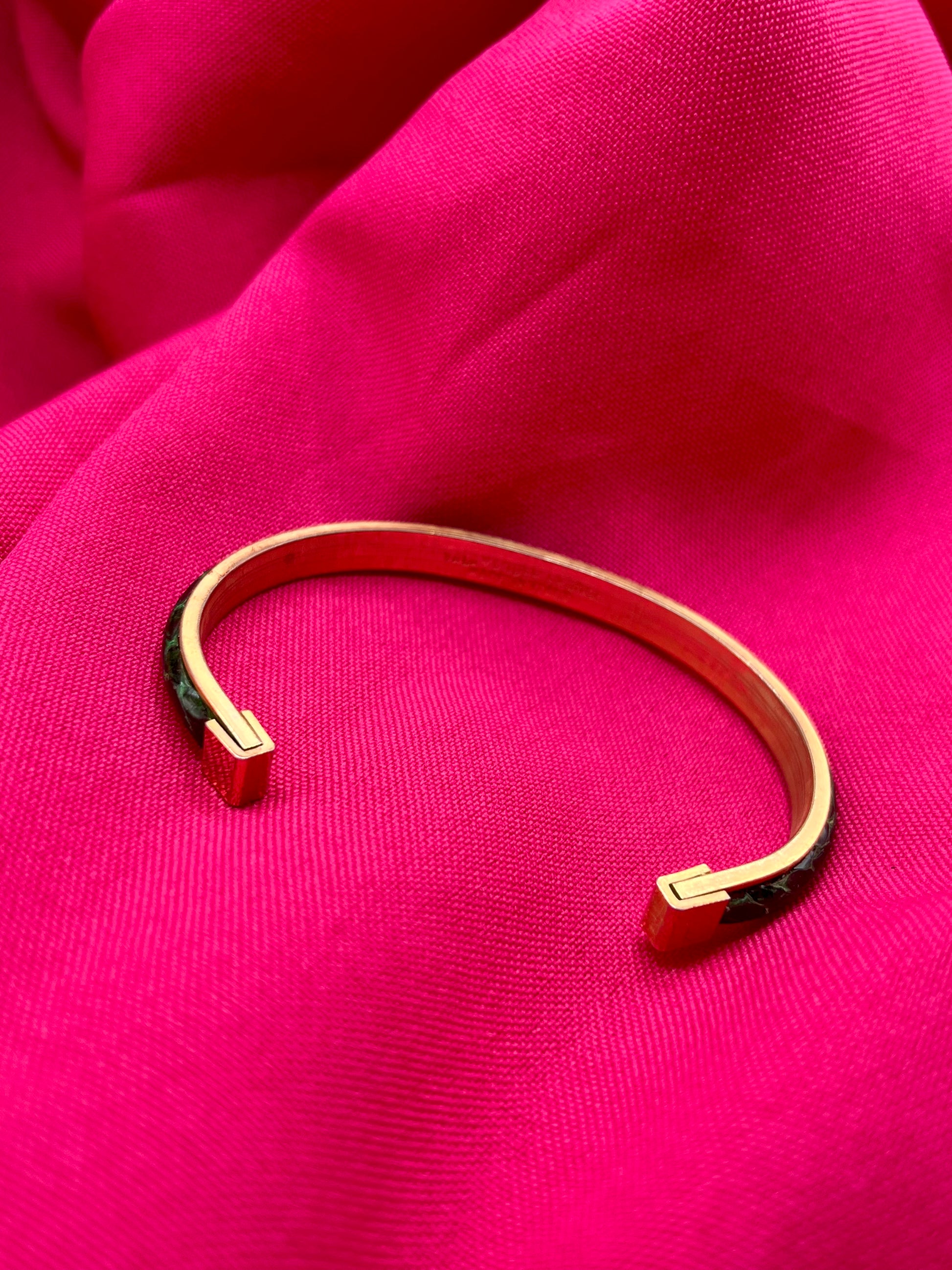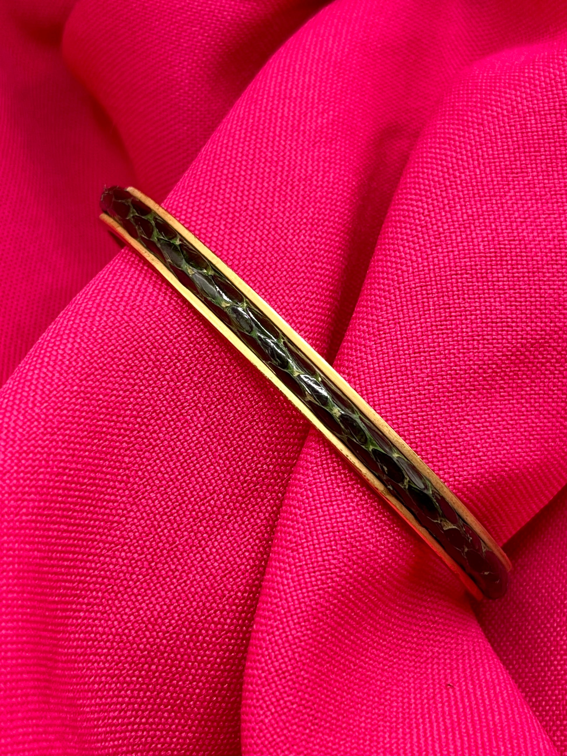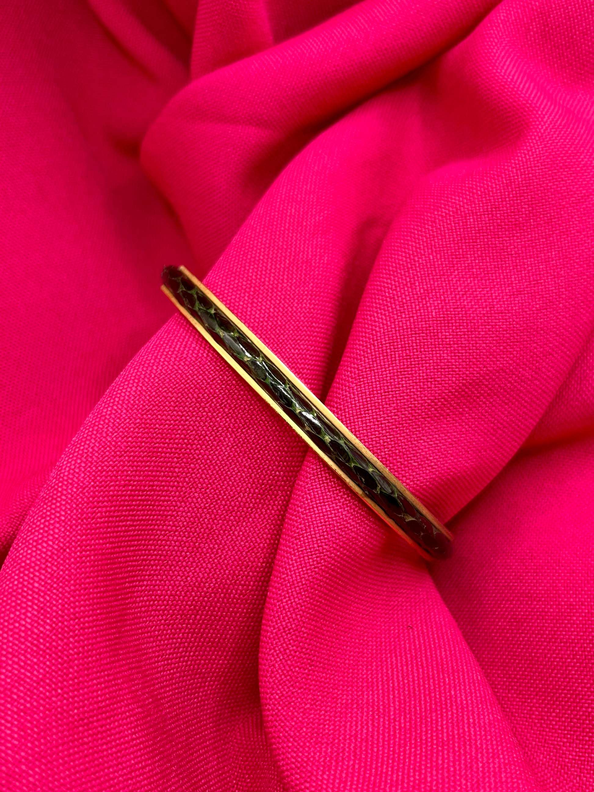 EN/ This rigid bracelet is a superb family jewel from the 80s, of incredible finesse. The dark green python effect leather makes it as iconic as it is timeless. It is signed by the Salamander brand and made in Italy.