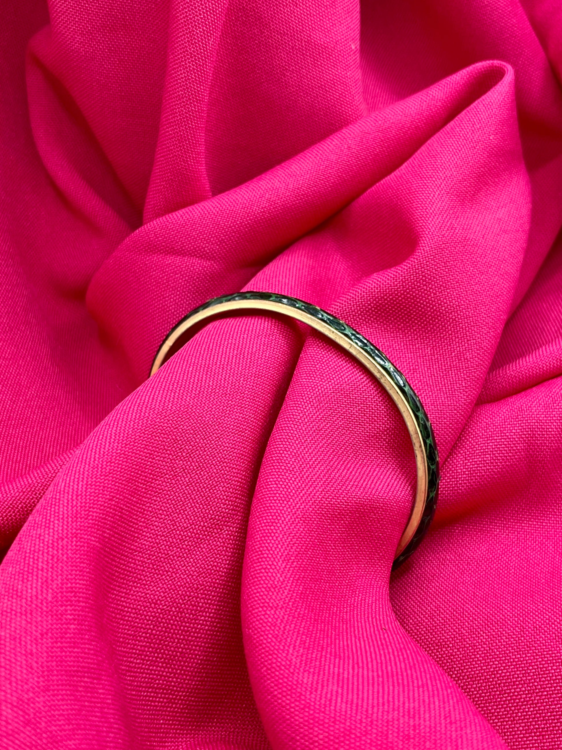 FR/ Ce jonc est un superbe bijou de famille des années 80, d’une finesse incroyable. Le cuir effet python vert foncé en fait une pièce aussi iconique qu’intemporelle. Il est signé de la marque Salamander et fabriqué en Italie.