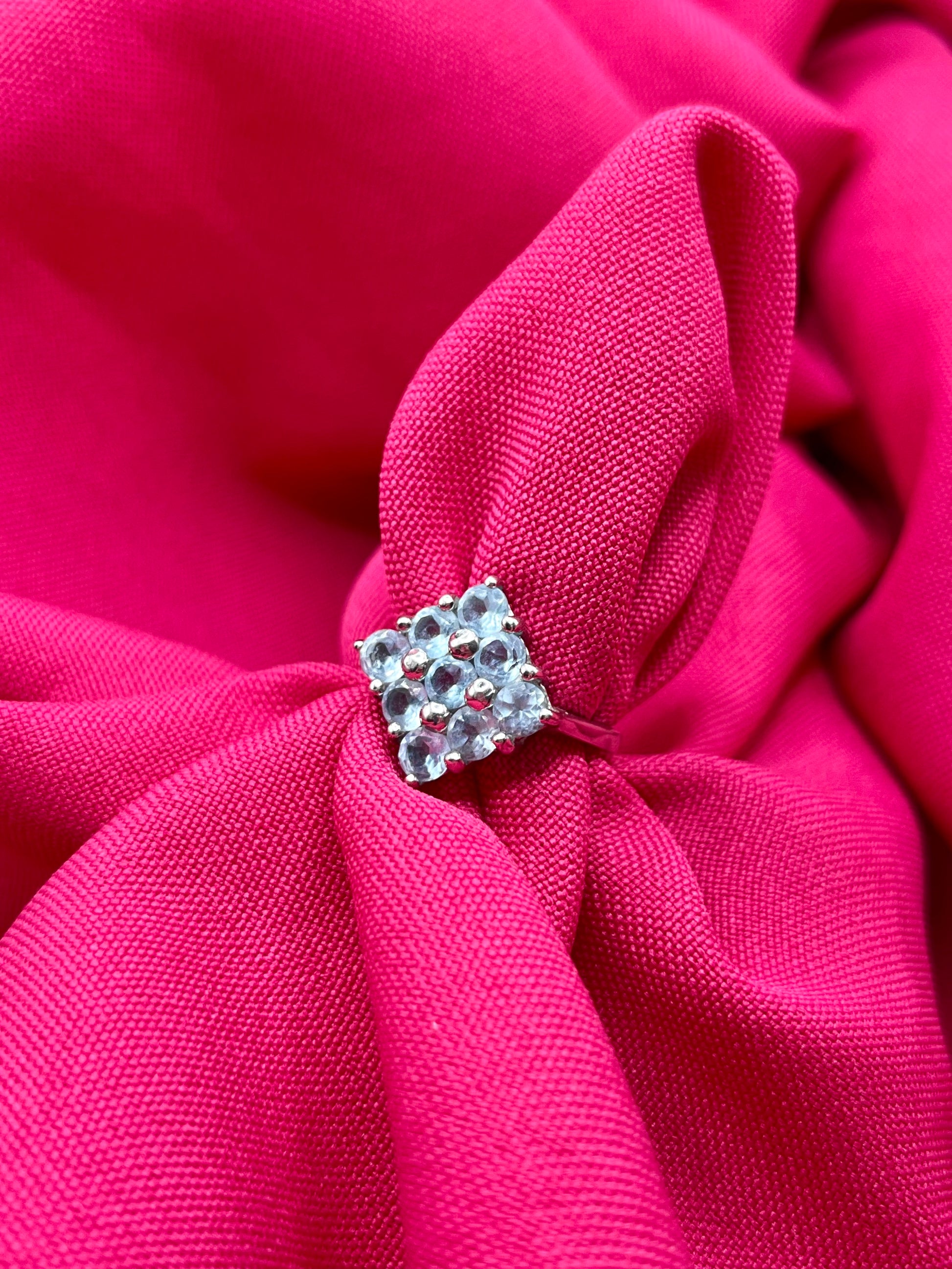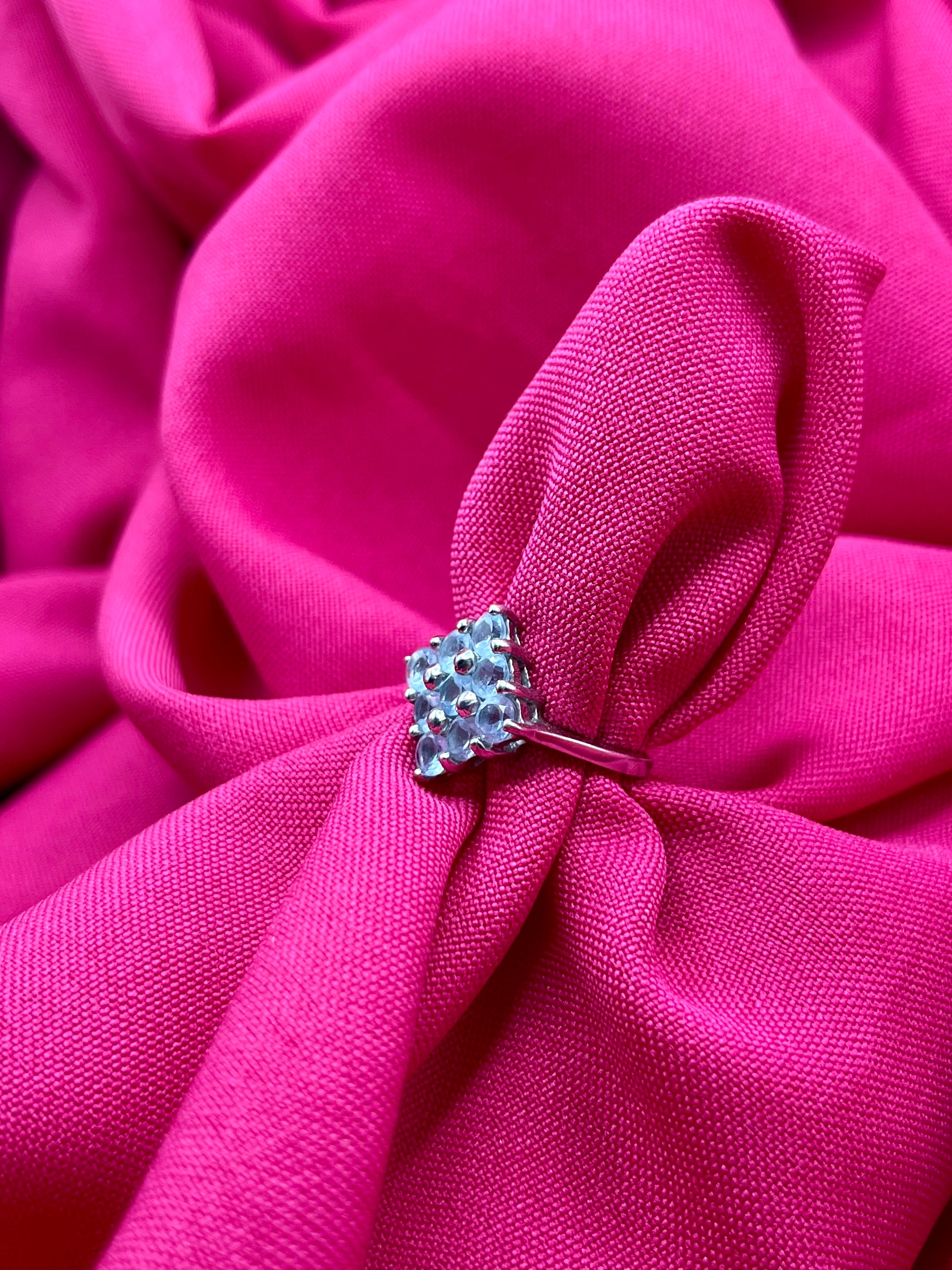 Très belle pièce en argent 925 avec une monture carré/losange sertie de cristaux bleus, monture qu’on ne retrouve pas souvent et qui offre un mélange de modernité et de classique. C’est une bague d’une très belle luminosité.