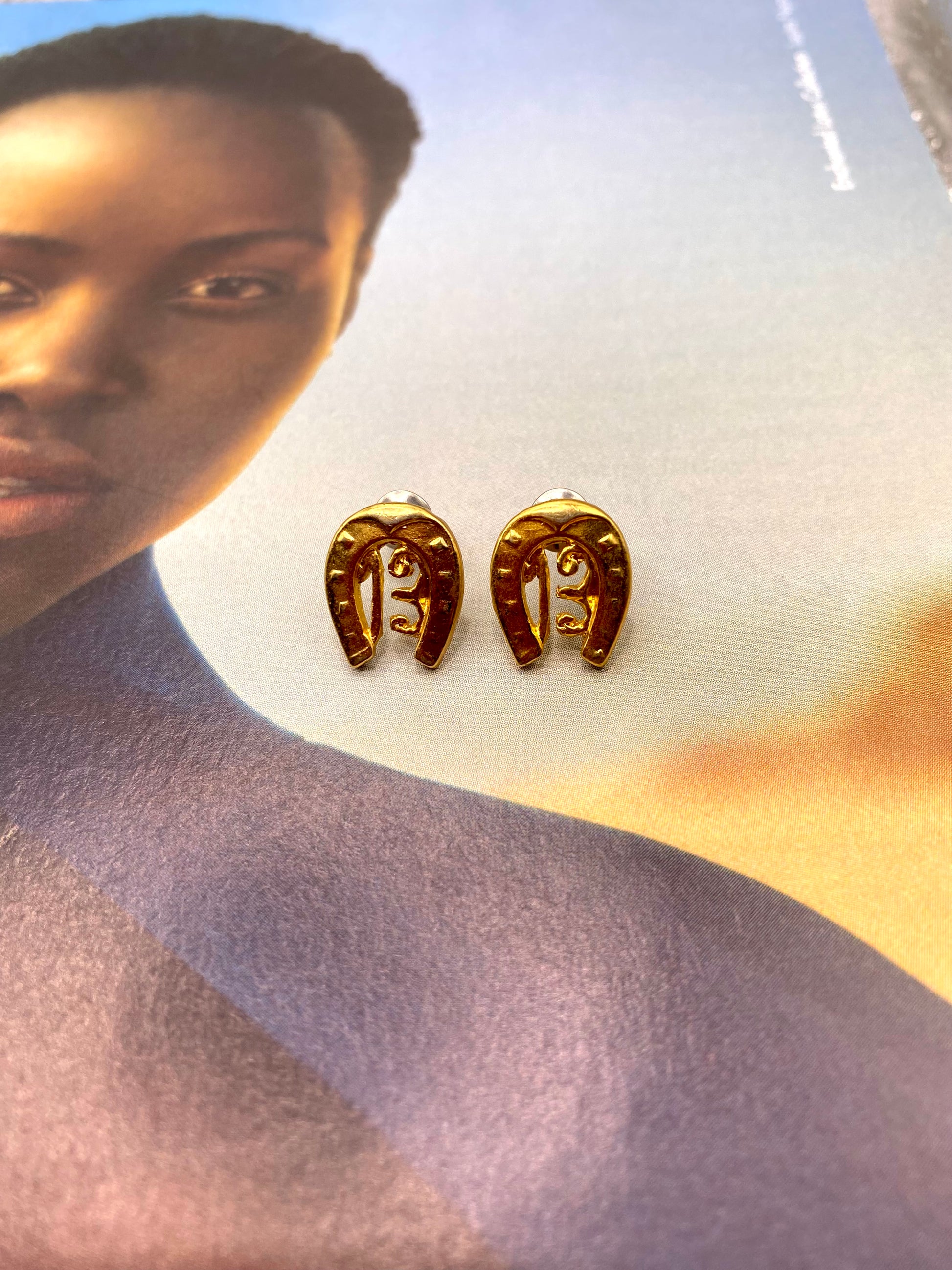 Ces petites boucles d’oreilles porte bonheur sont de petites merveilles des années 80 en acier couleur or. Il y’a un très joli travail de la matière et sont dans un superbe état.