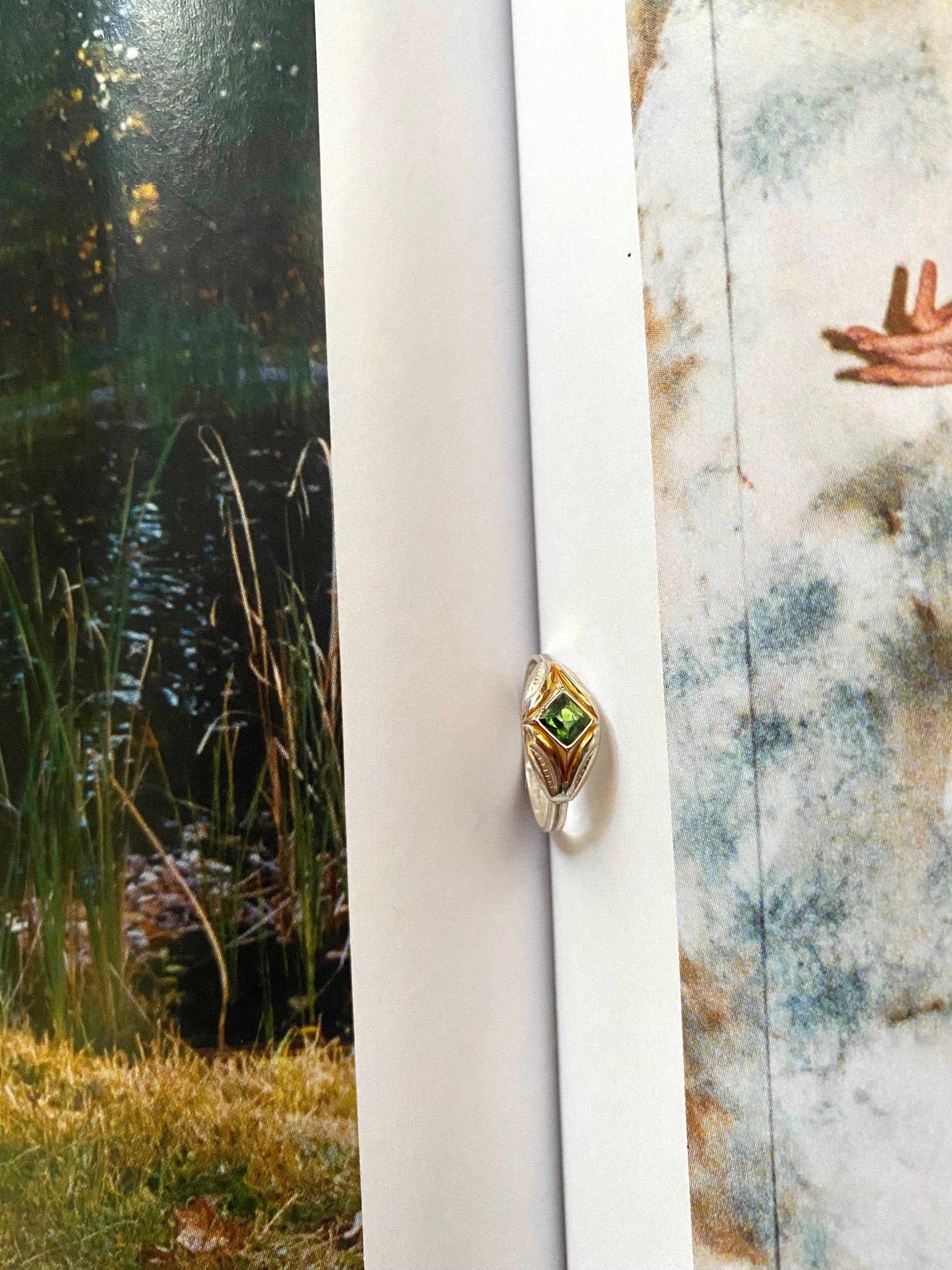 FR/ Mini bague en argent 925 avec une touche de plaqué or et du verre vert. Très discrète, chic et adorable. Cette bague est parfaite pour un bijou de tous les jours en portant tout de même une pièce unique et originale.               Parfaite condition vintage.