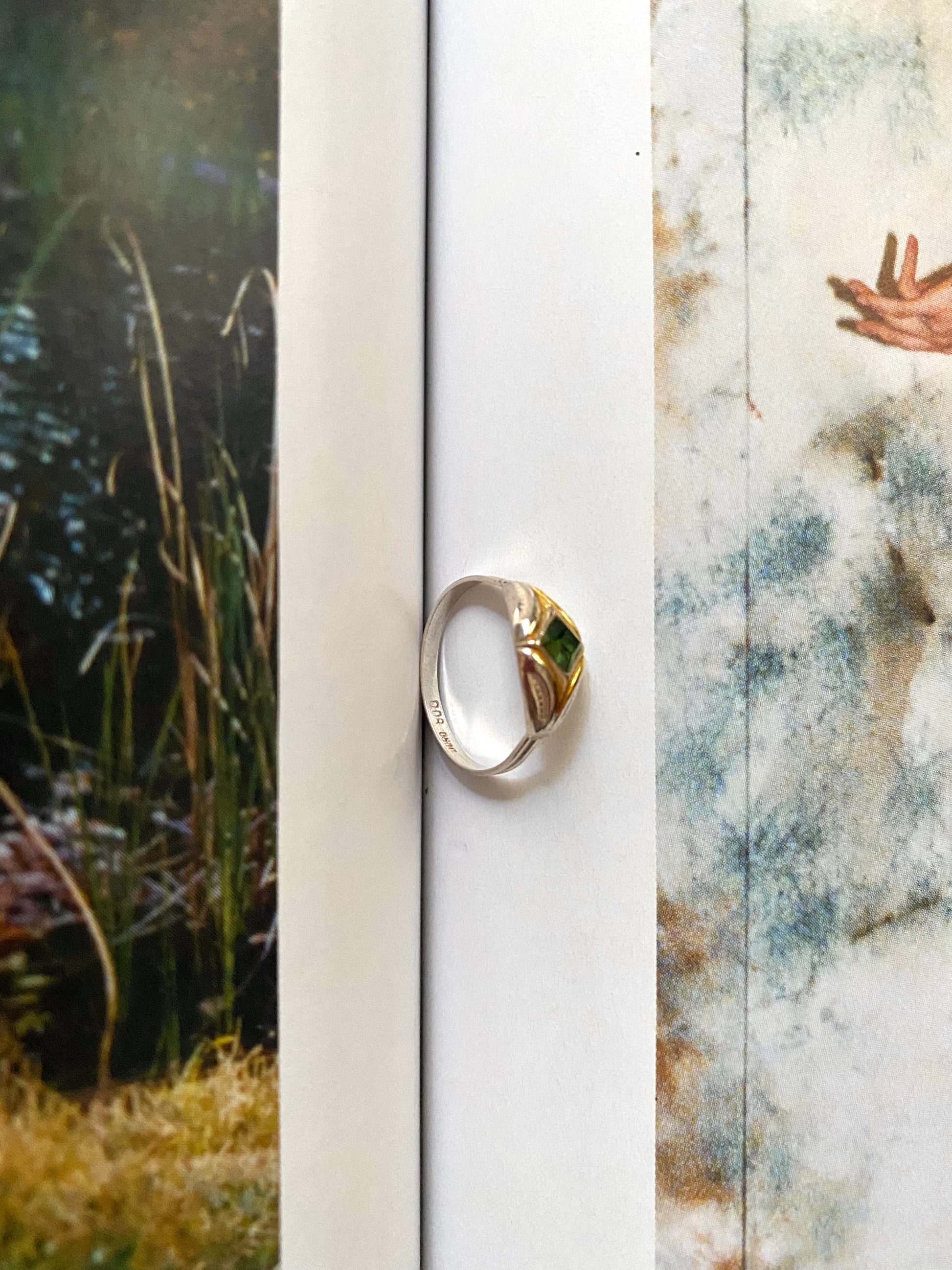 EN/ Mini silver 925 ring with a touch of gold plated and a green glass stone. So chic and cute. Best choice if you want to wear a jewel everyday but still wear something original.