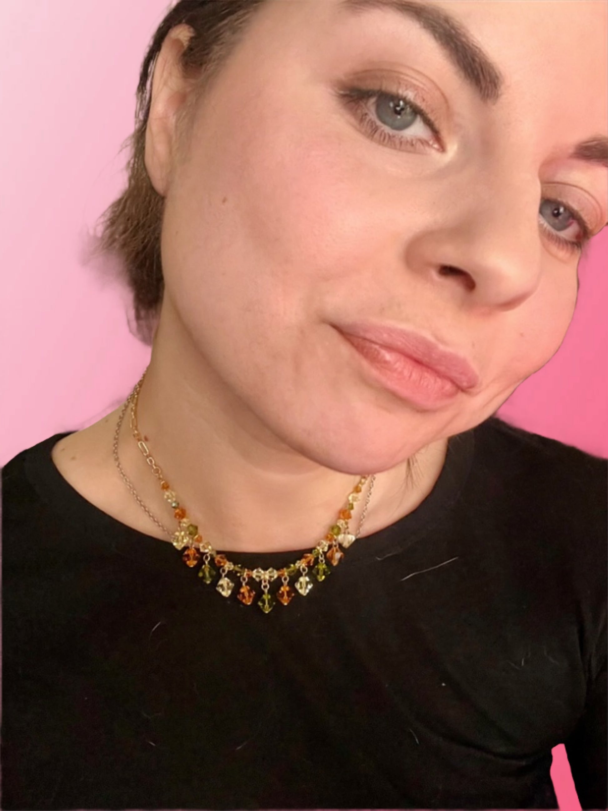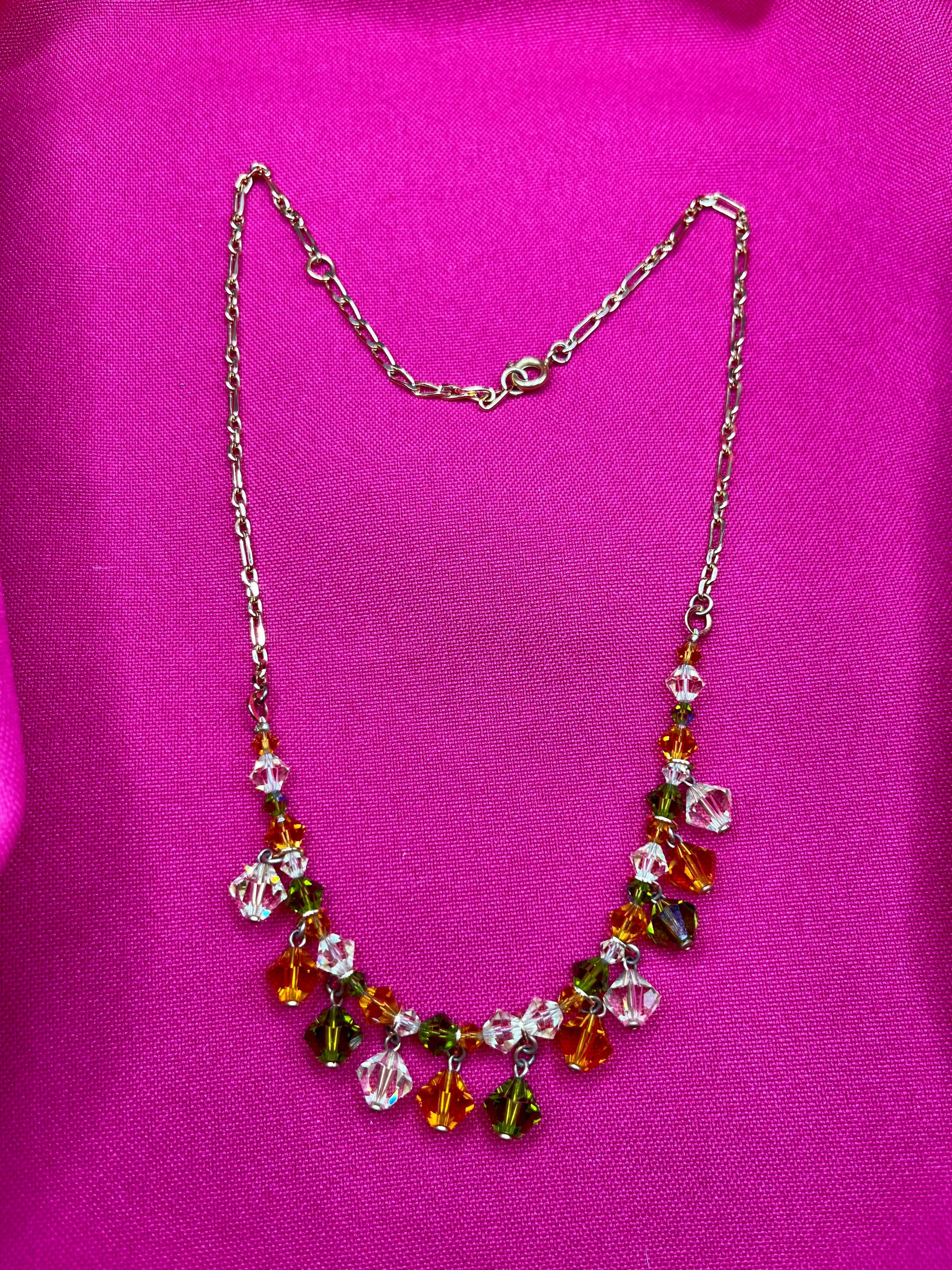FR/ Ce collier court serti de perles de verre de trois tons brille de milles feux à la lumière. Une pièce lumineuse et élégante.