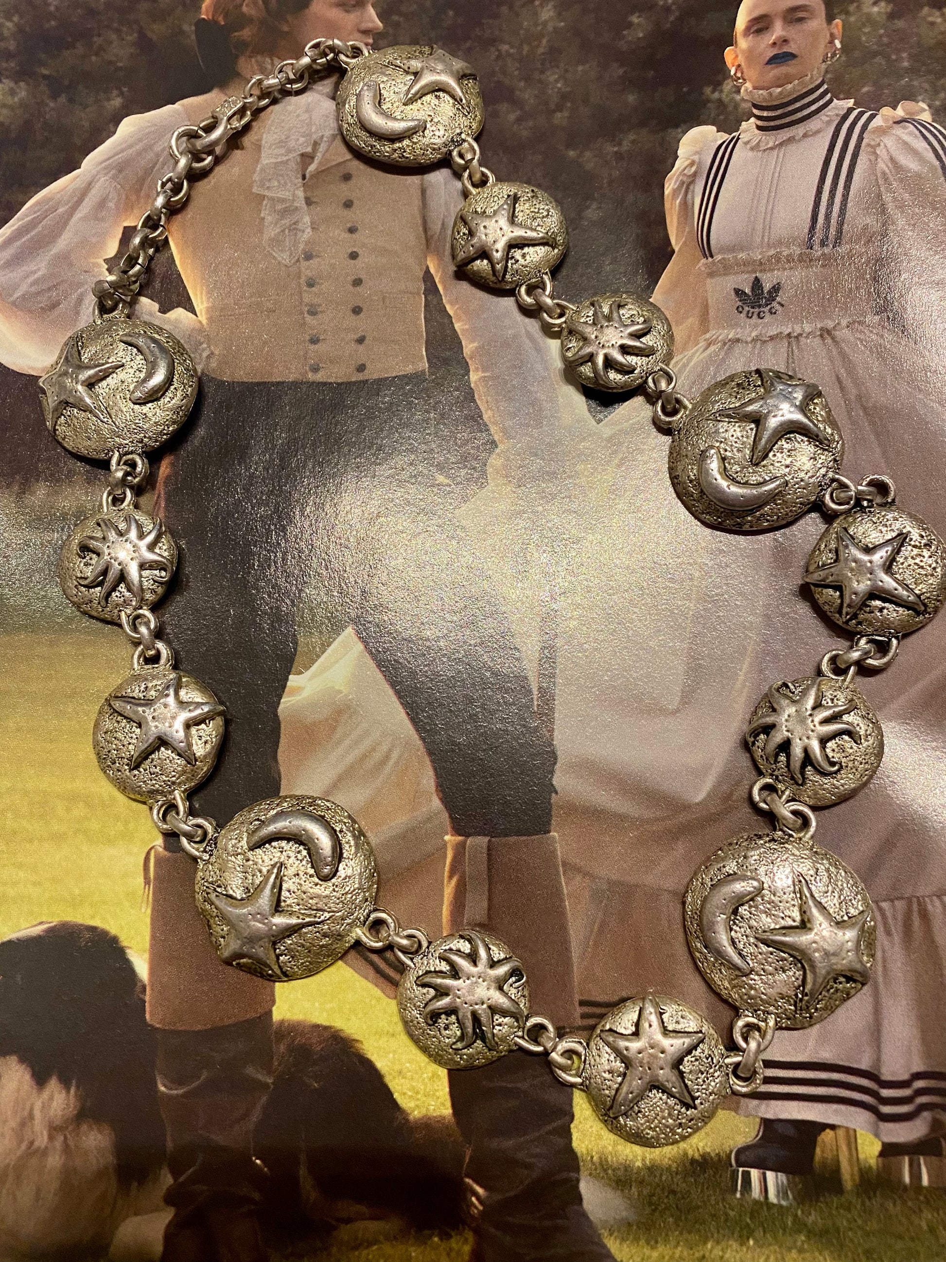 Collier en argent signé, avec des lunes, des étoiles et des soleils. Sublime pièce vintage.