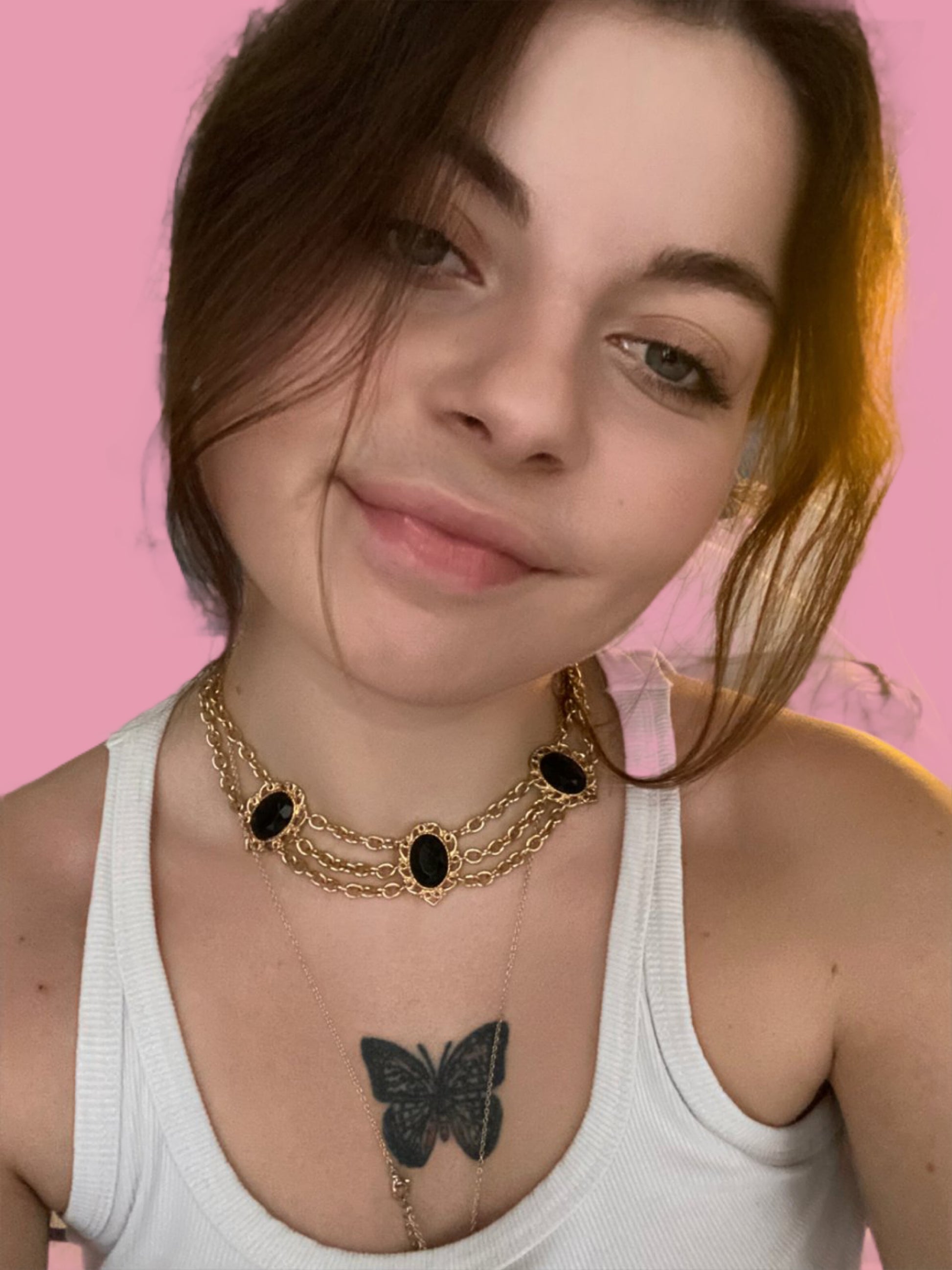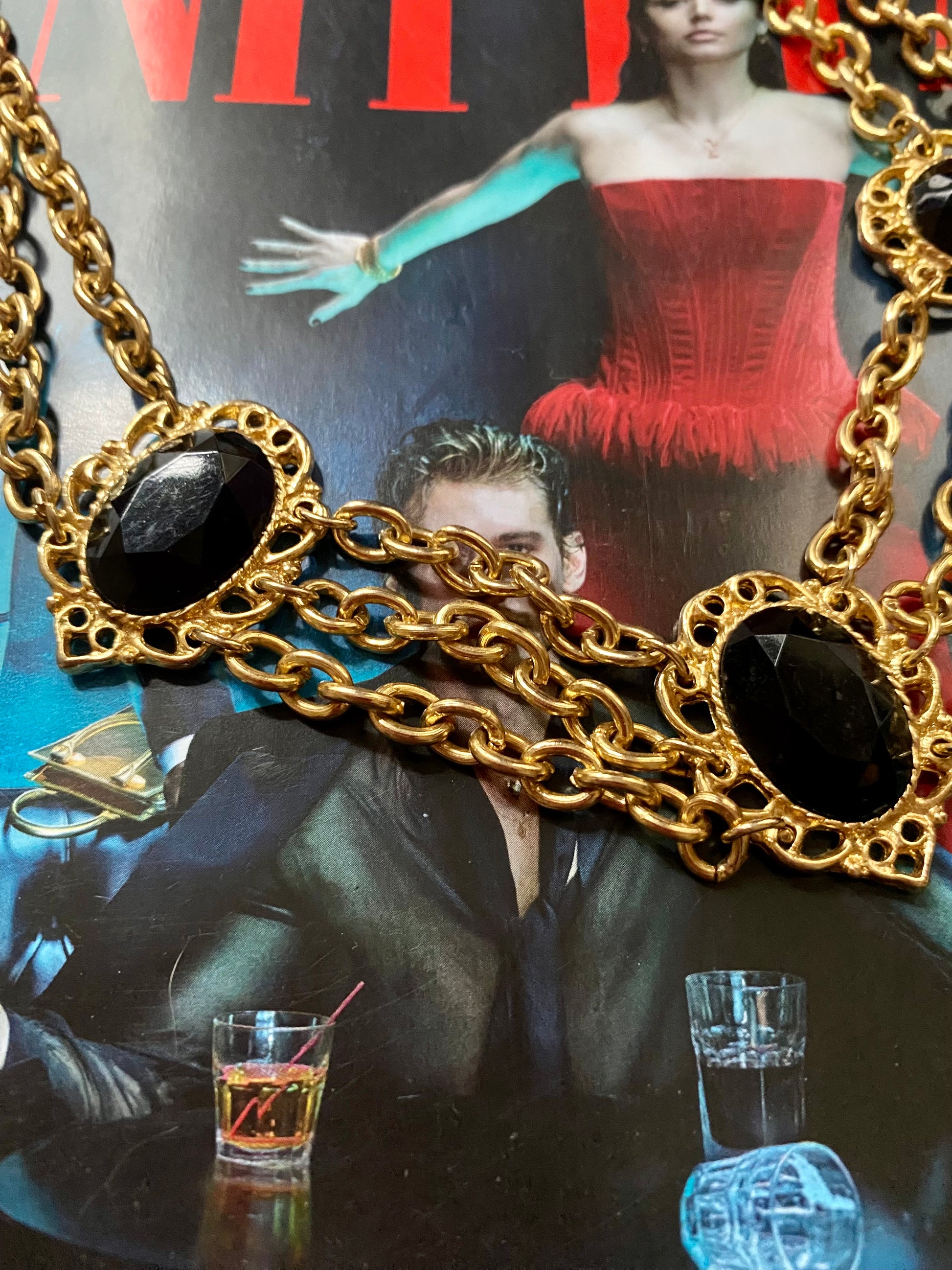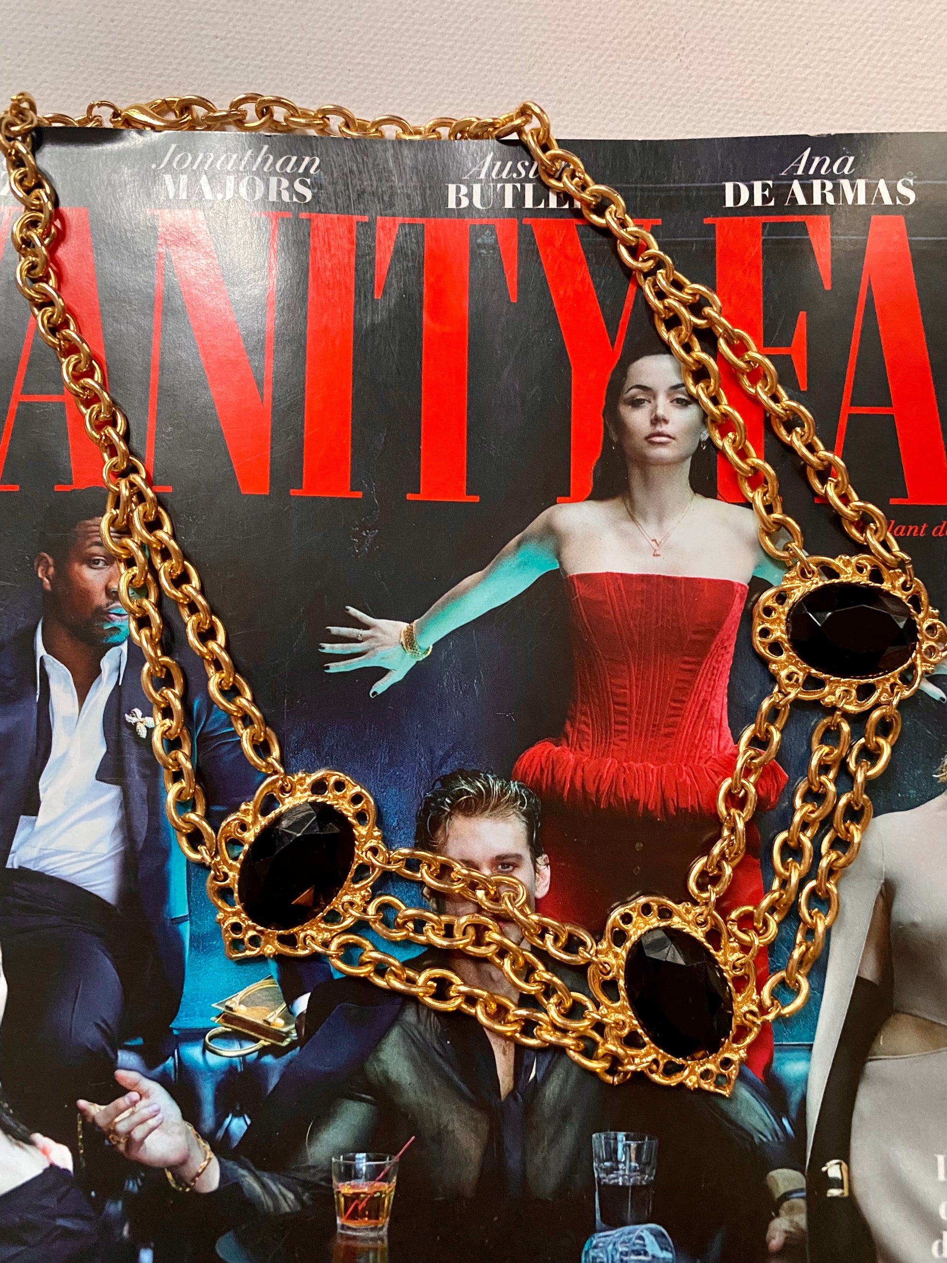 Collier à plusieurs chaînes en acier couleur or et résine noire.