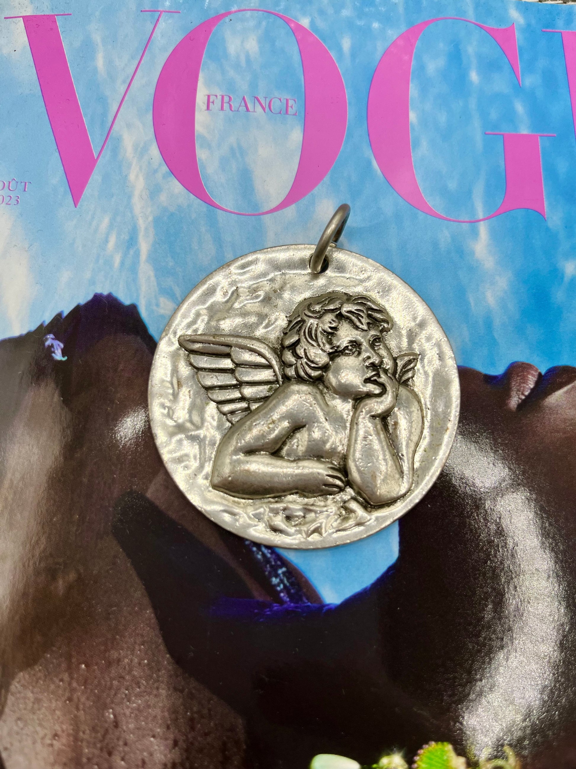 FR/ Pendentif en métal couleur argent oversize, gravé d’un très bel ange penseur. Une pièce statement à porter sur une chaîne ou même en chocker.