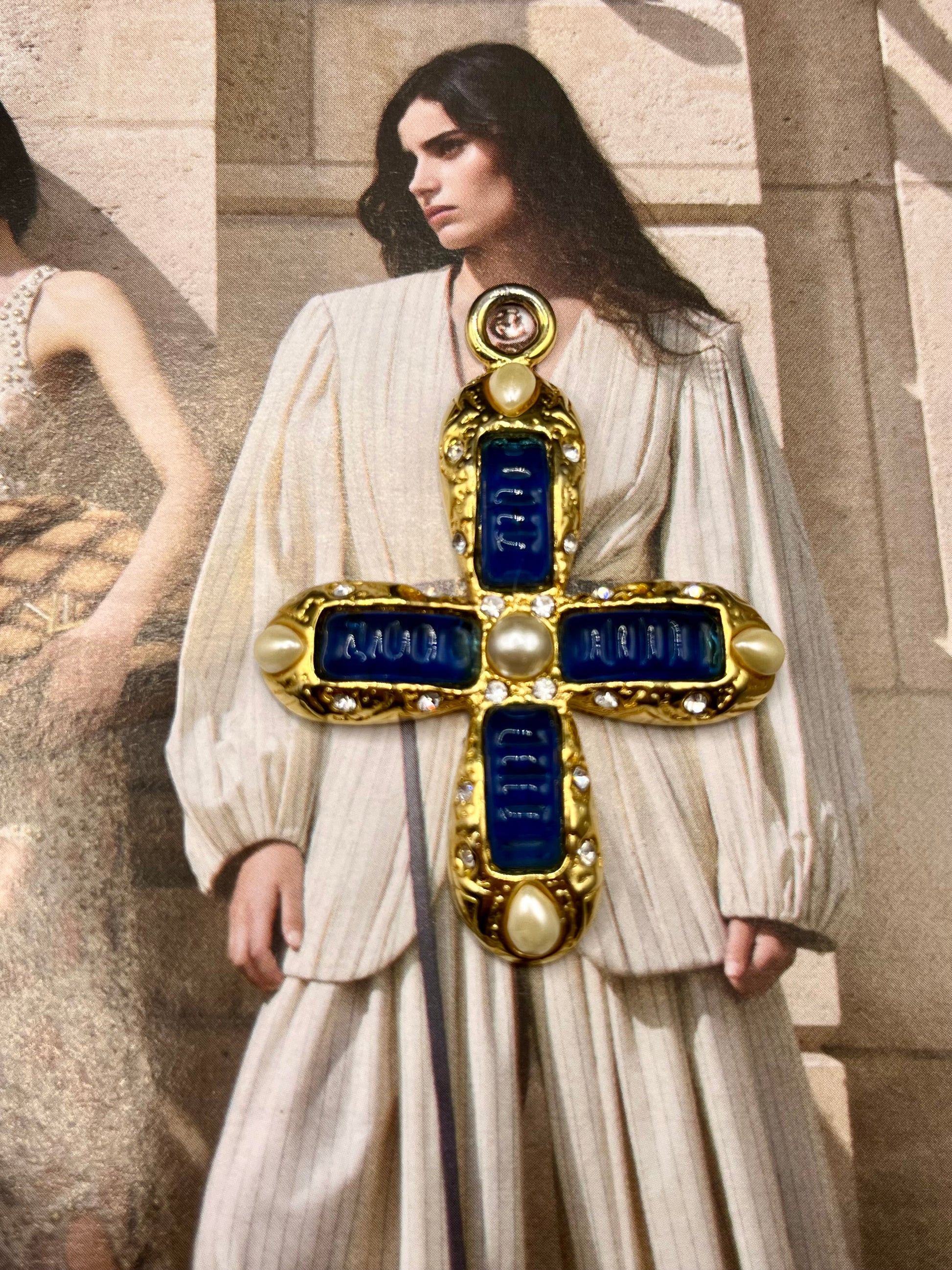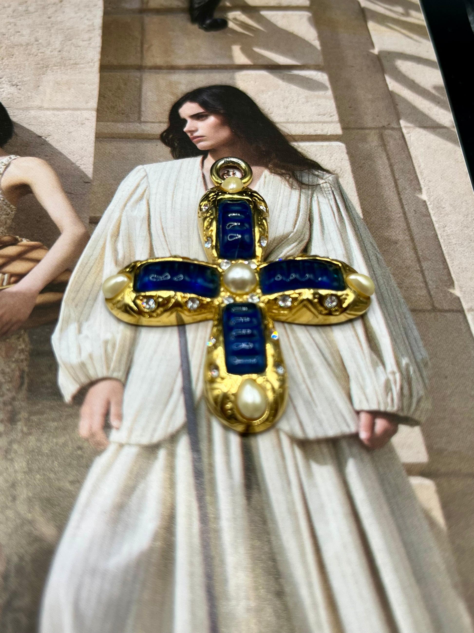 Sublime pendentif croix en métal couleur or avec une pâte de verre bleu nuit et des perles synthétiques. Une pièce unique. Le poids parfait entre qualité et porté agréable.