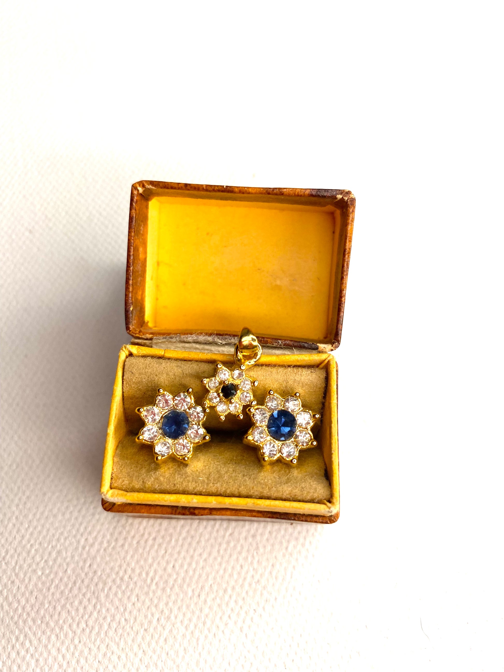 EN/ Jewelry set of daisy earrings and pendant from the 80’s. For pierced ears. The set is gold plated with delicate zirconiums and dark blue stones. So precious set.