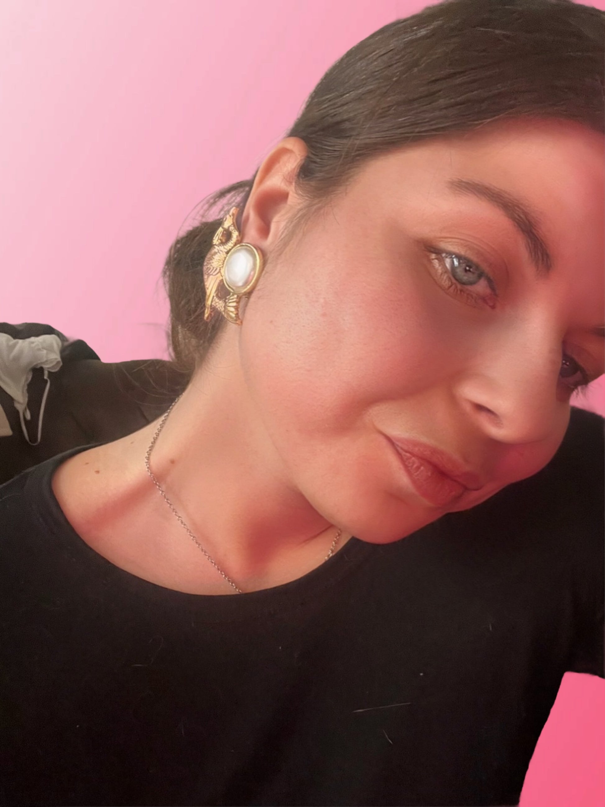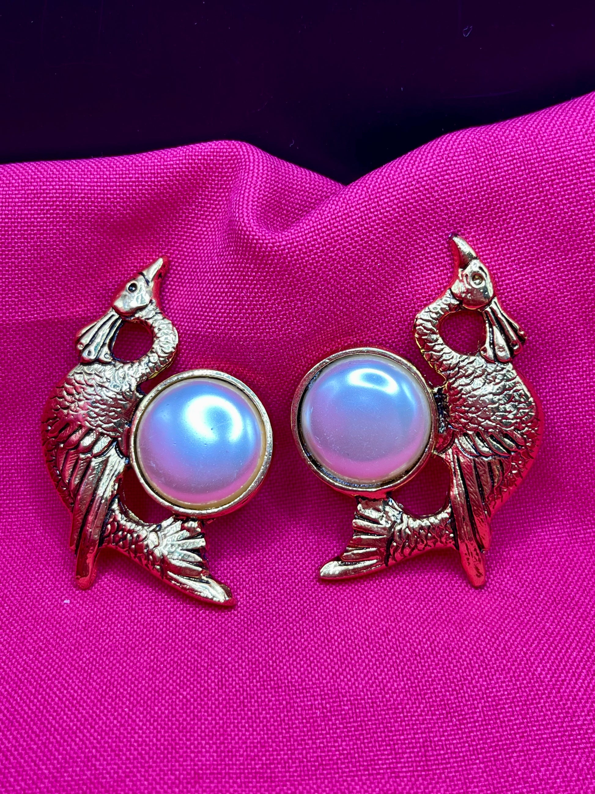 FR/ Incroyable clips couleur or en forme de paon avec une grosse perle. Une pièce statement aussi chic qu’adorable. Paire légère et agréable à porter.