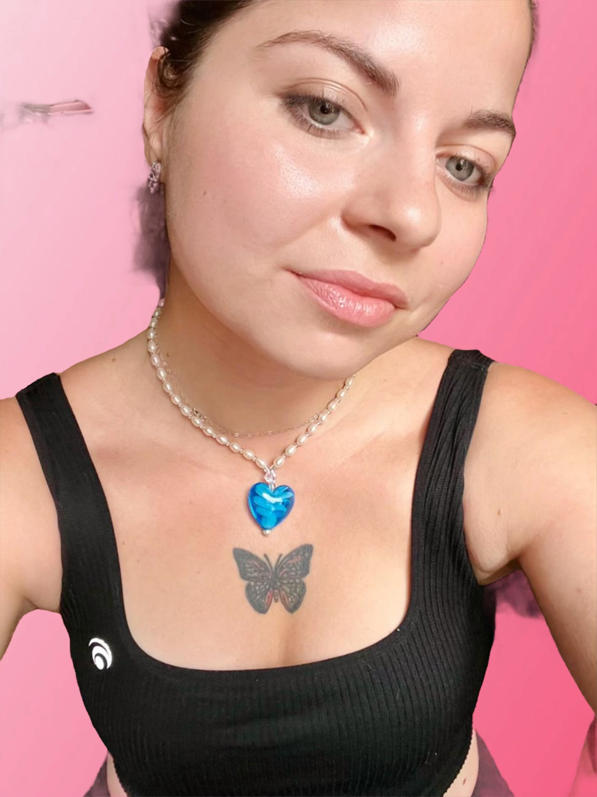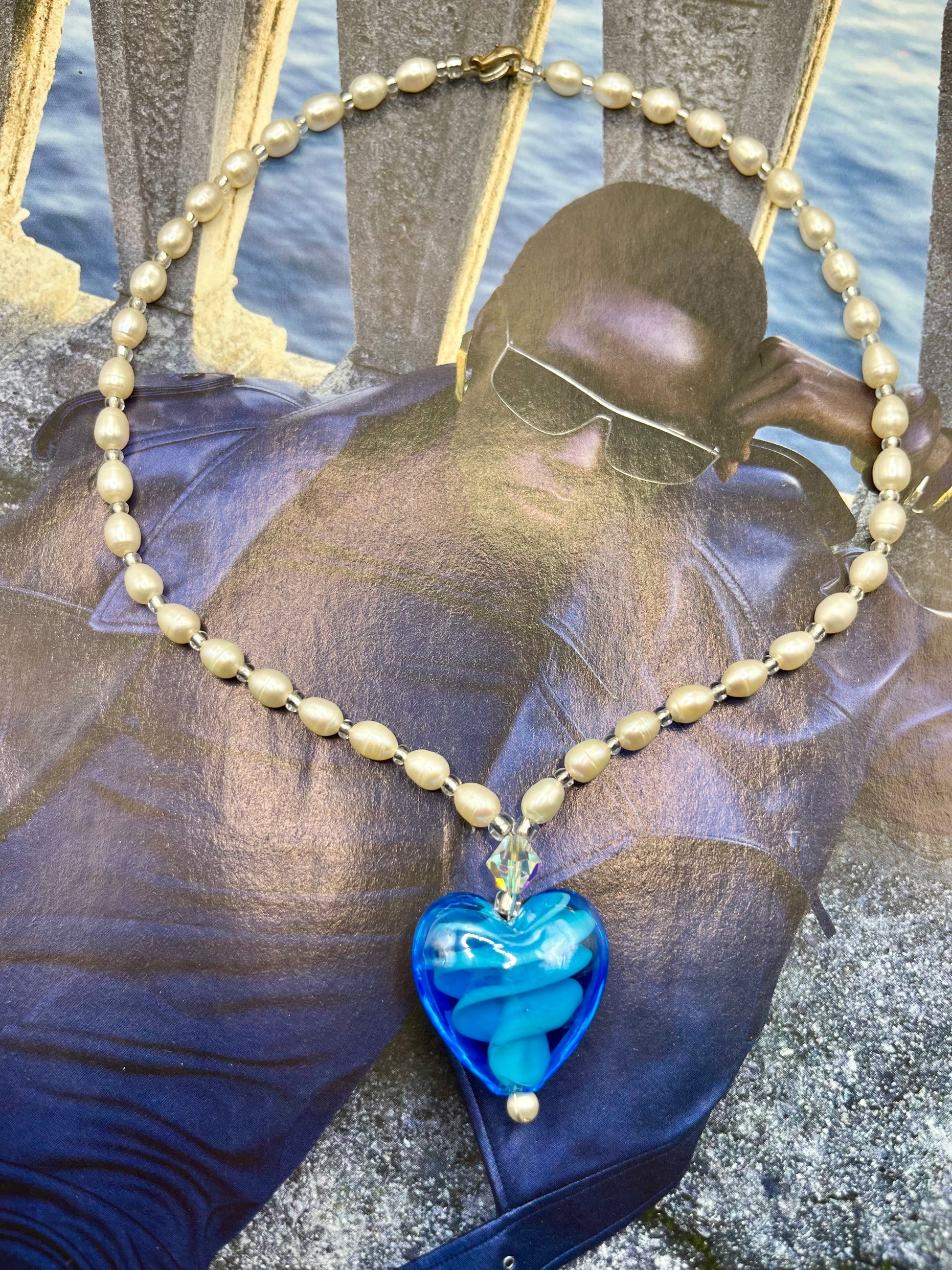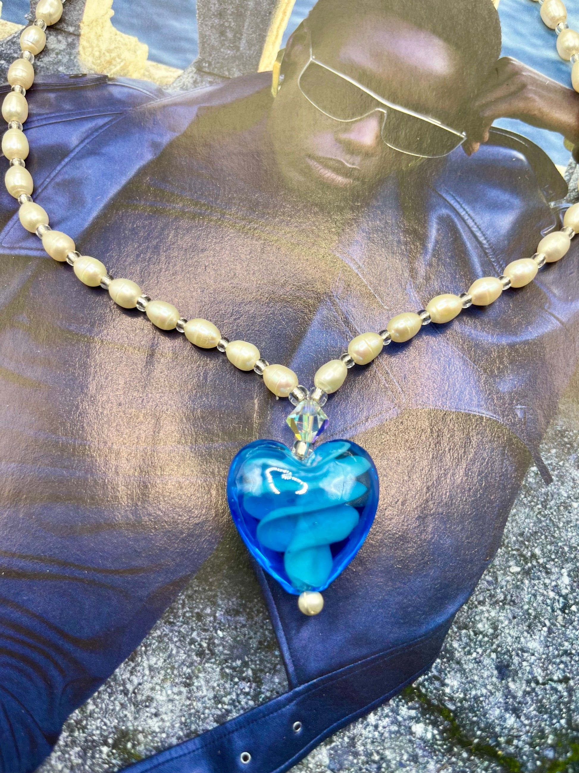 EN/ Sublime piece in real pearls with a large blue crystal heart, with a work of color and material inside. A rare and unique piece. Only the metal clasp shows signs of time, otherwise the condition is impeccable. A piece of character for a unique look.