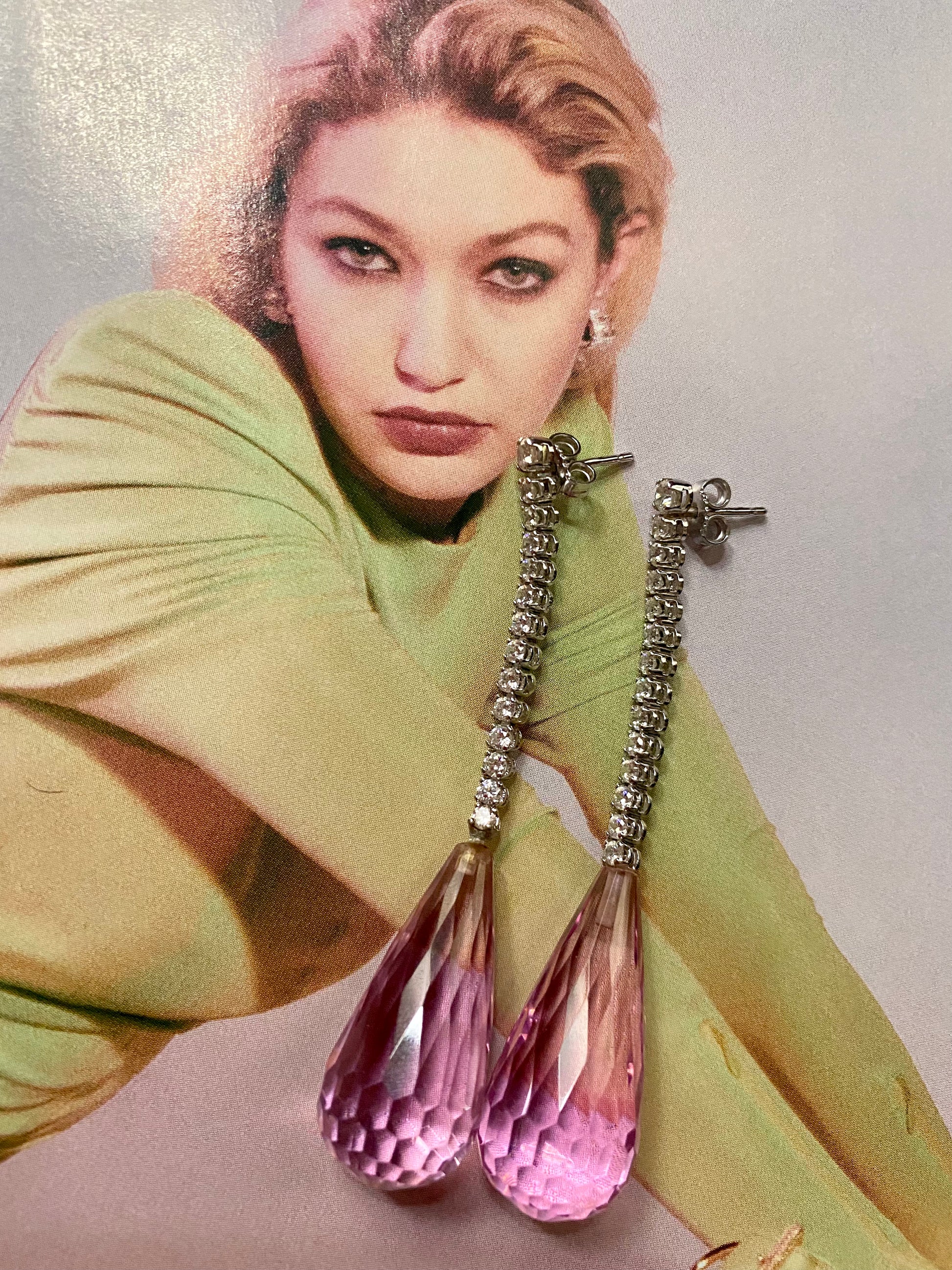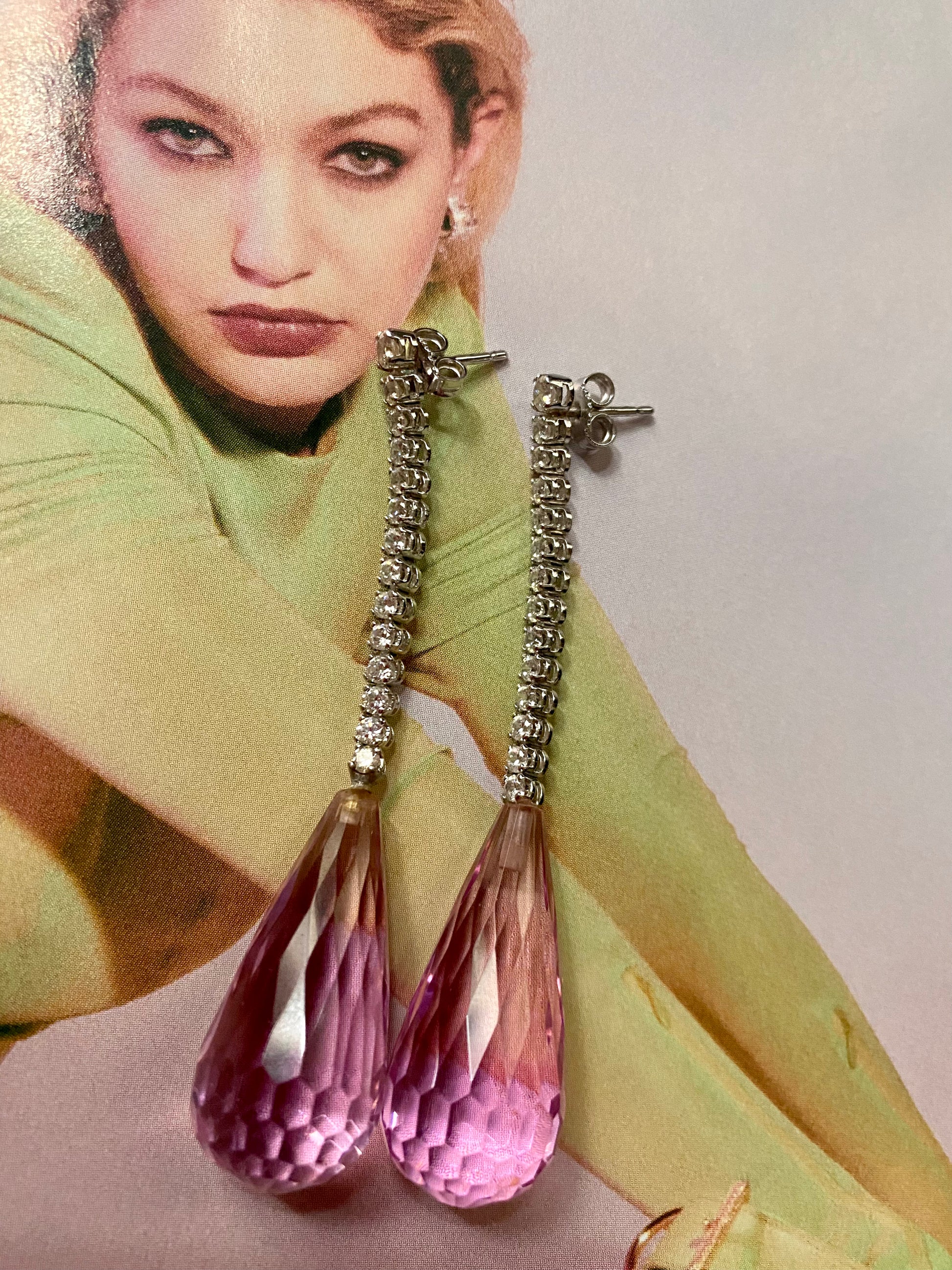 Pendantes en argent avec une cascade de zircons blancs et un gros cristal rose.