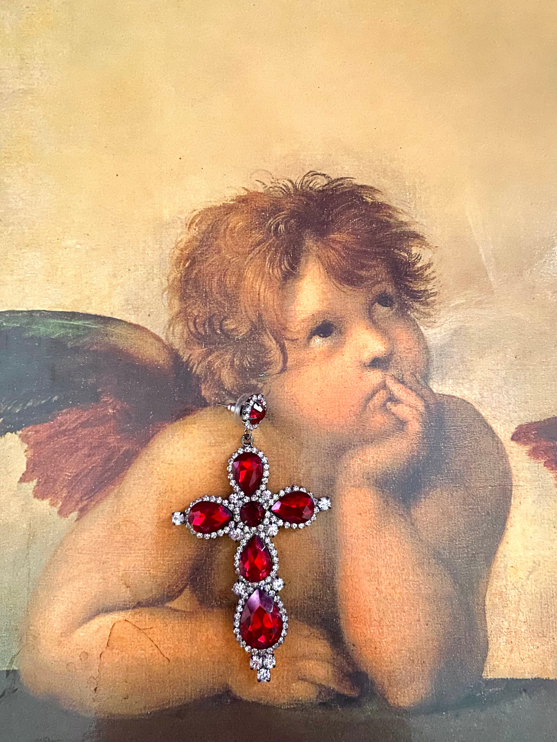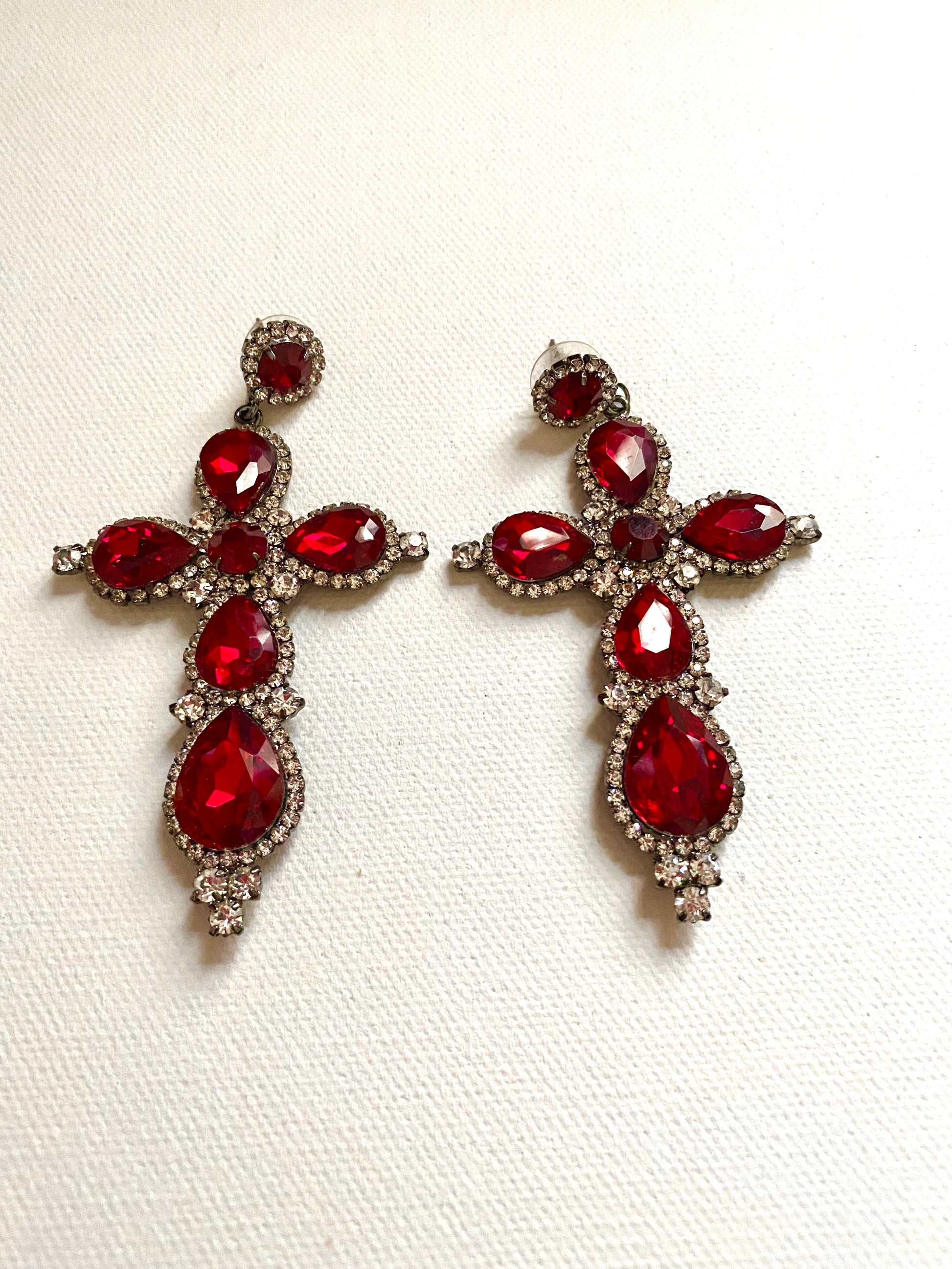 Pendants en forme de croix avec des pierres rouges et des zircons tout autour. Pour oreilles percées.