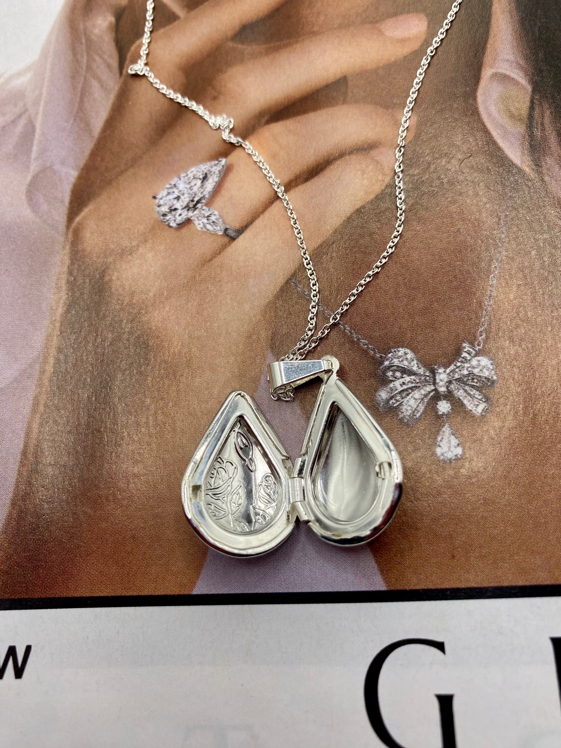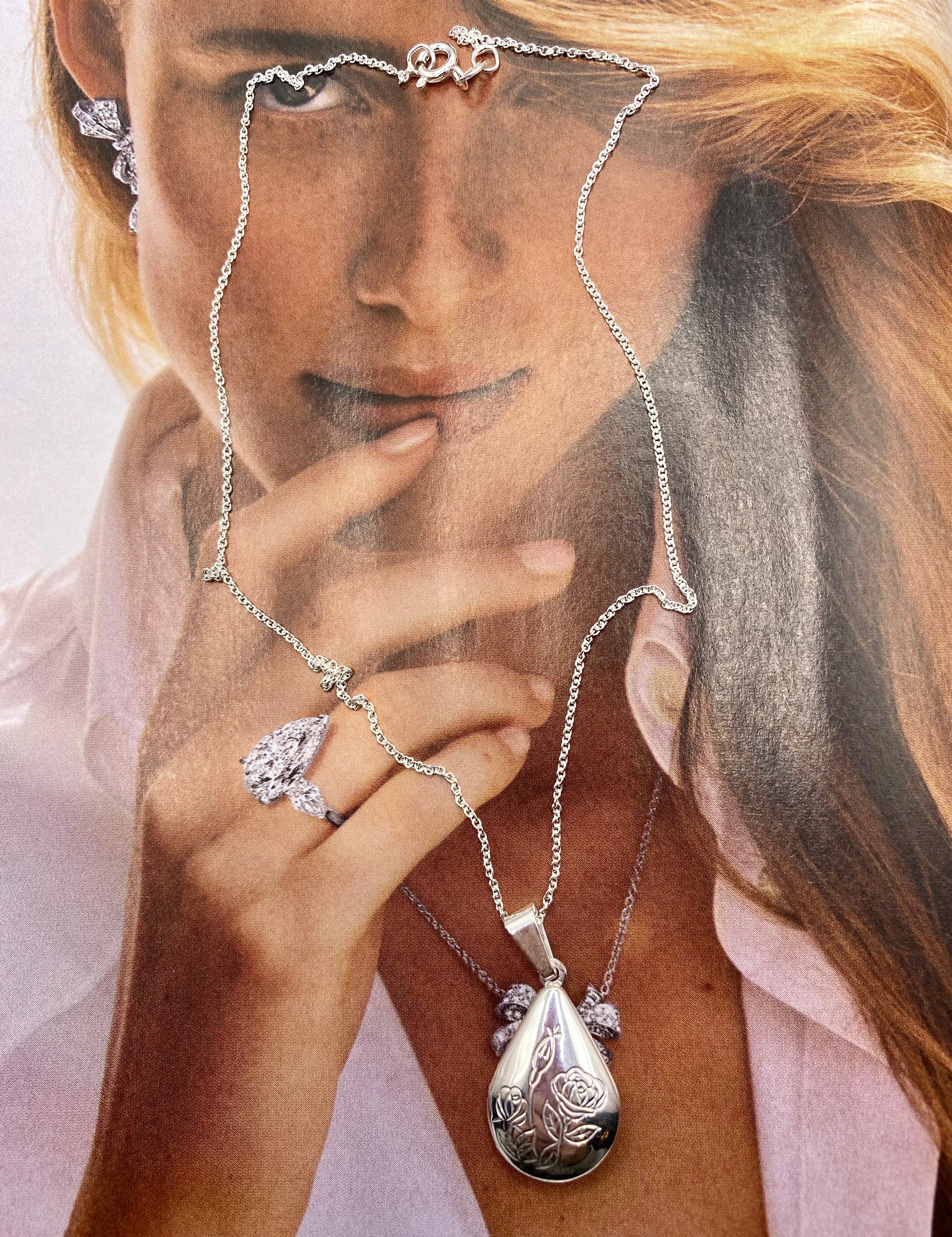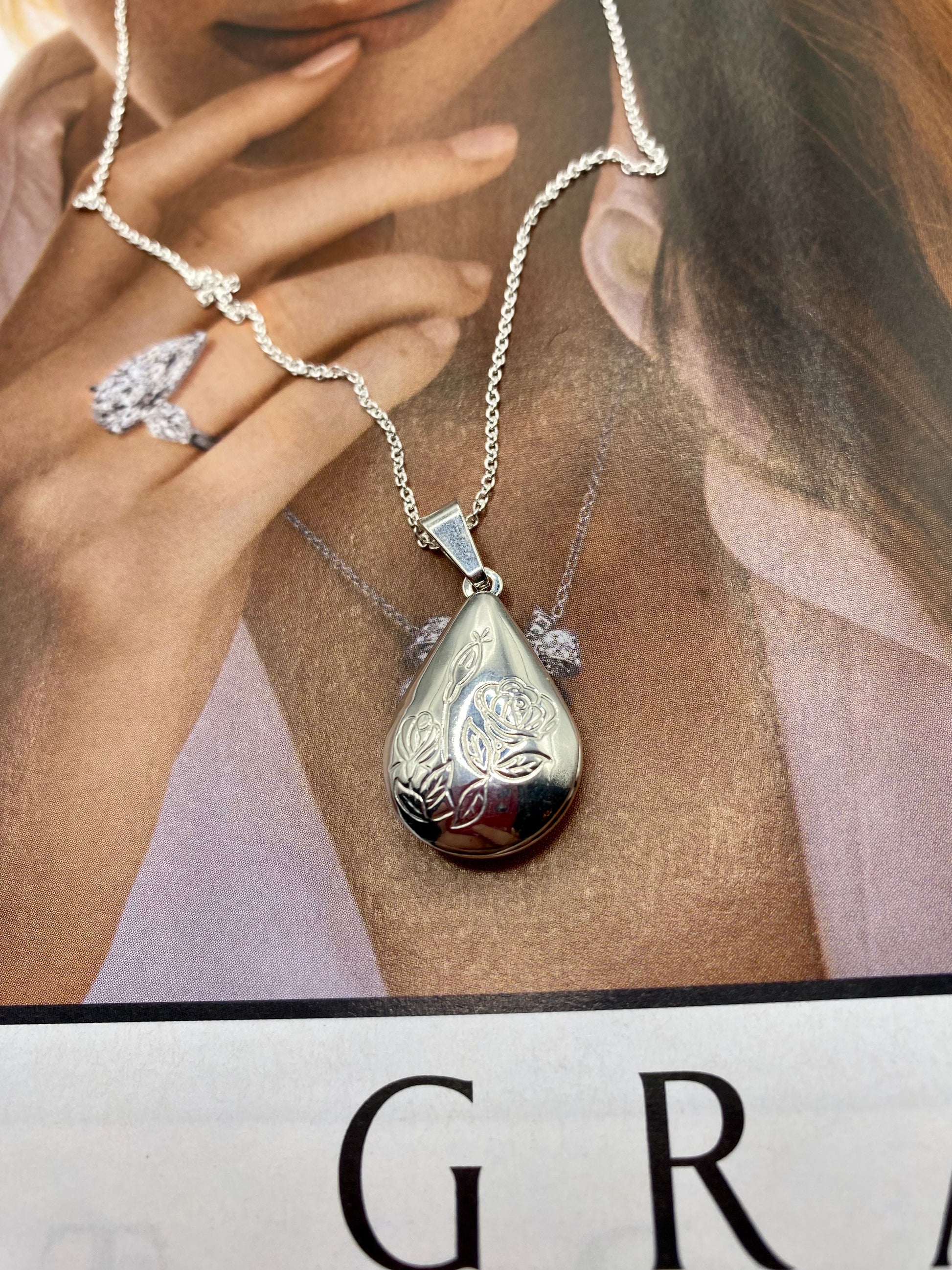 EN/ Necklace made in Italy in silver with a pendant that opens to slip a small photo or a small another thing like a thin piece of paper with something wrote on it to keep it near the heart. I love this kind of necklace that immediately becomes a emotional jewel. The pendant is engraved with pretty roses and the drop shape makes it original compared to other pendants of this style, which was widespread at the time.