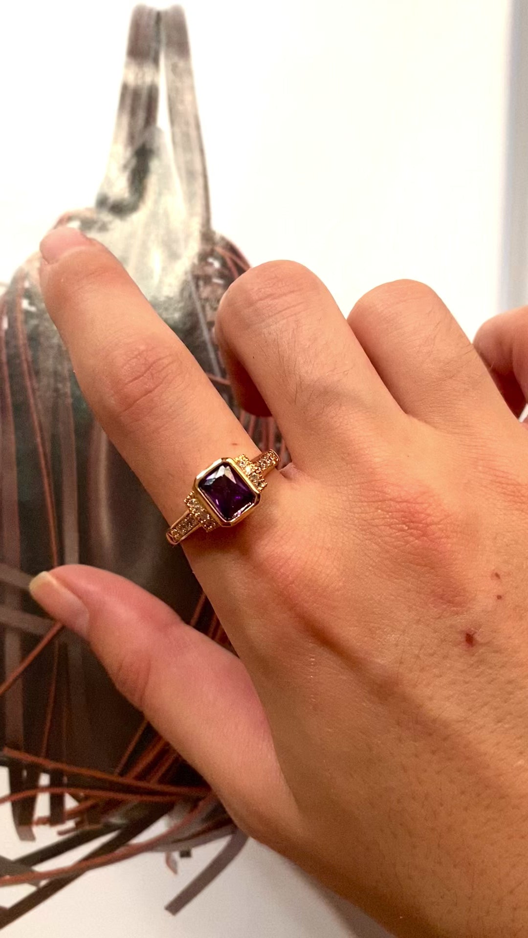 EN/ Pink golden brass ring with a solitaire purple crystal and zirconiums. This stunning piece stand out.