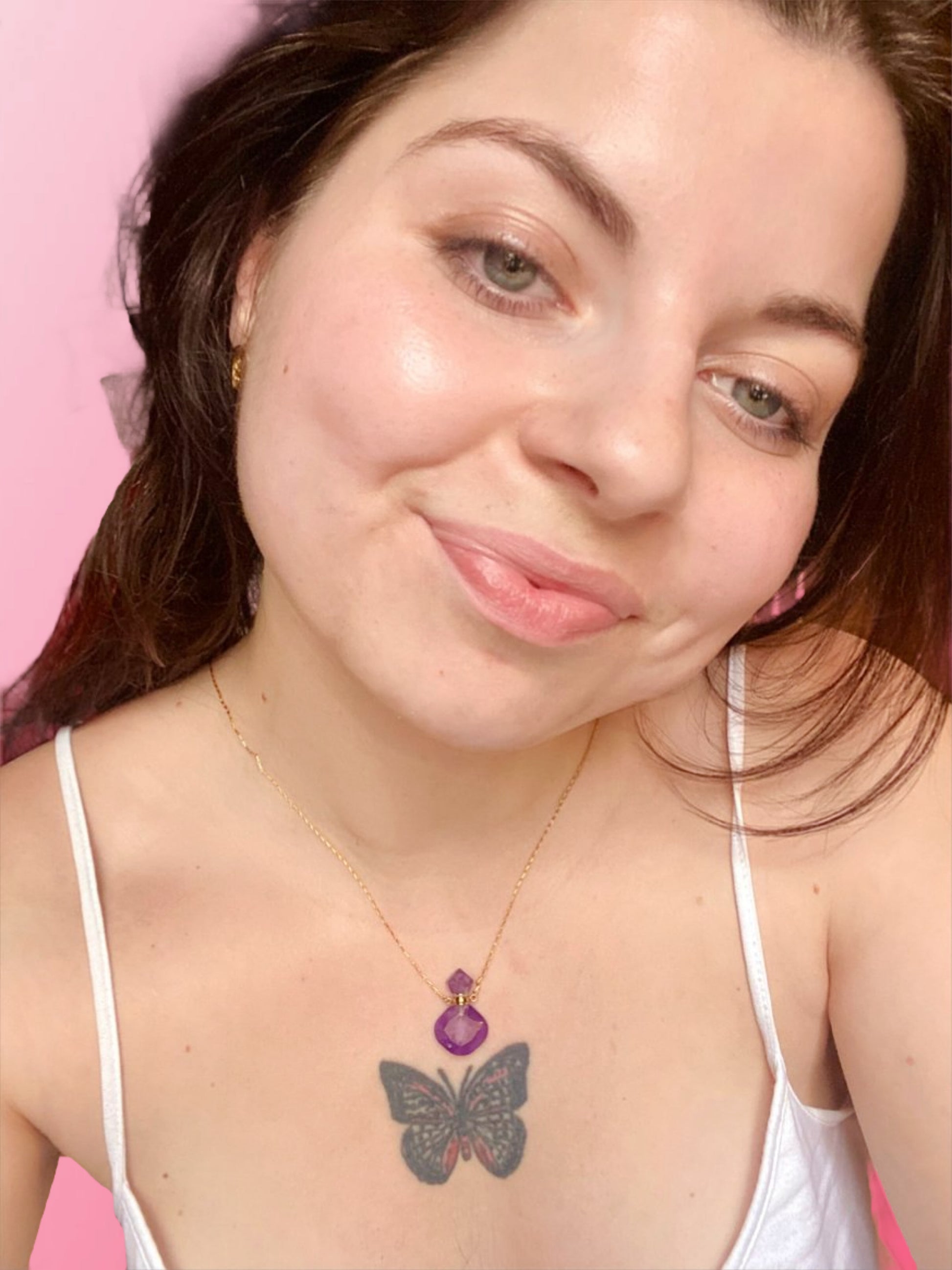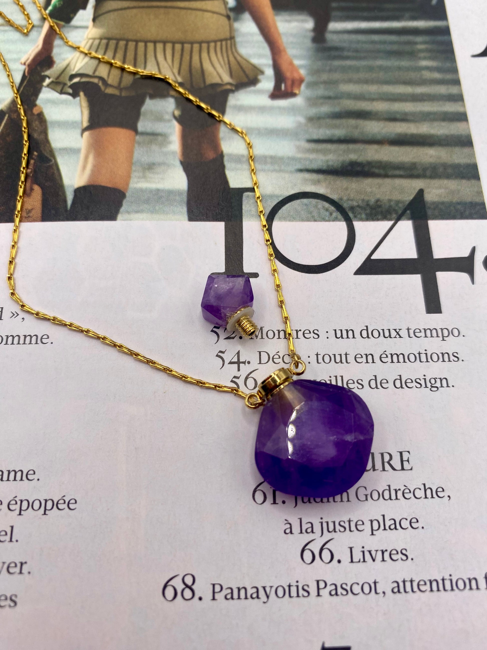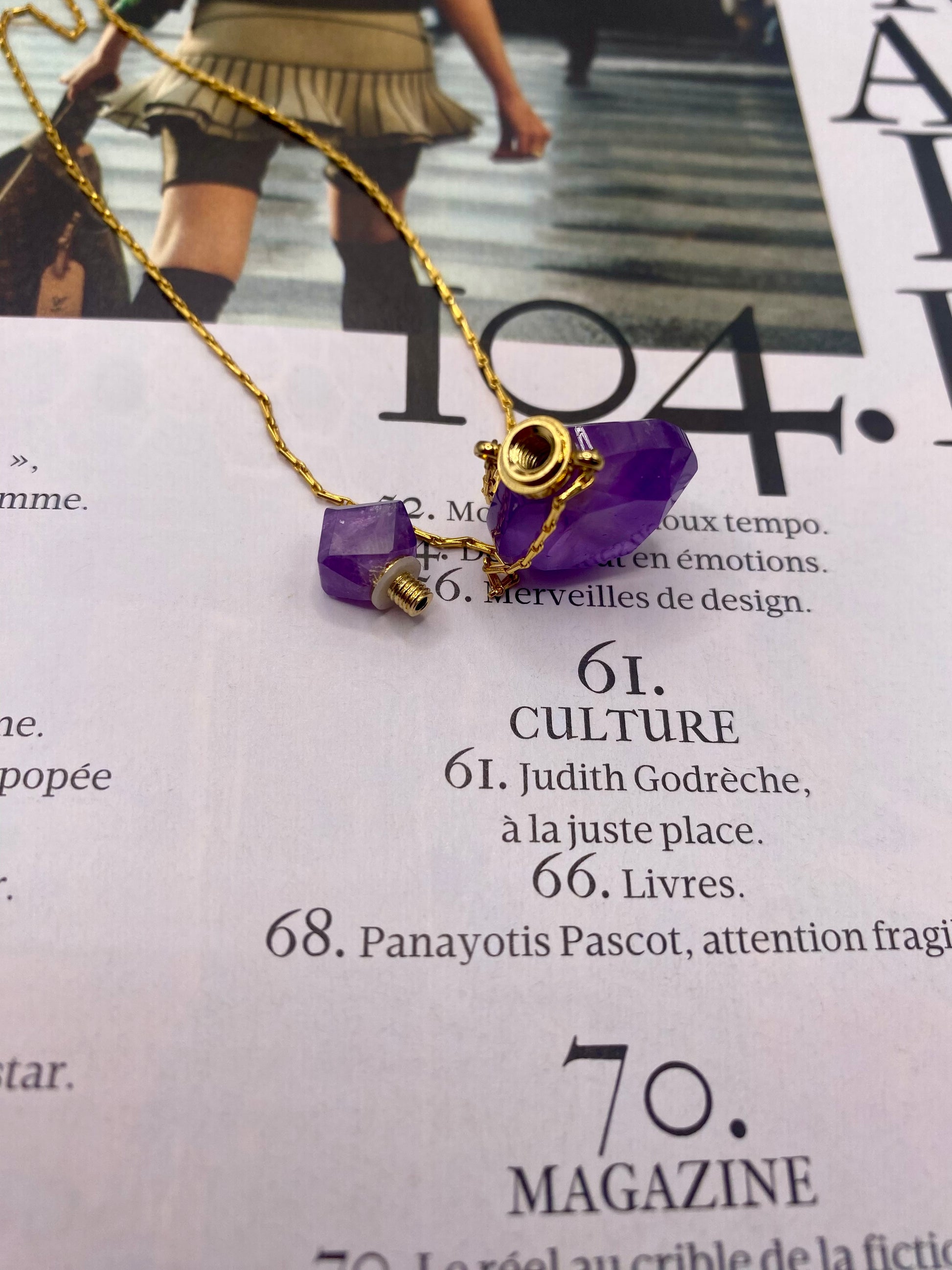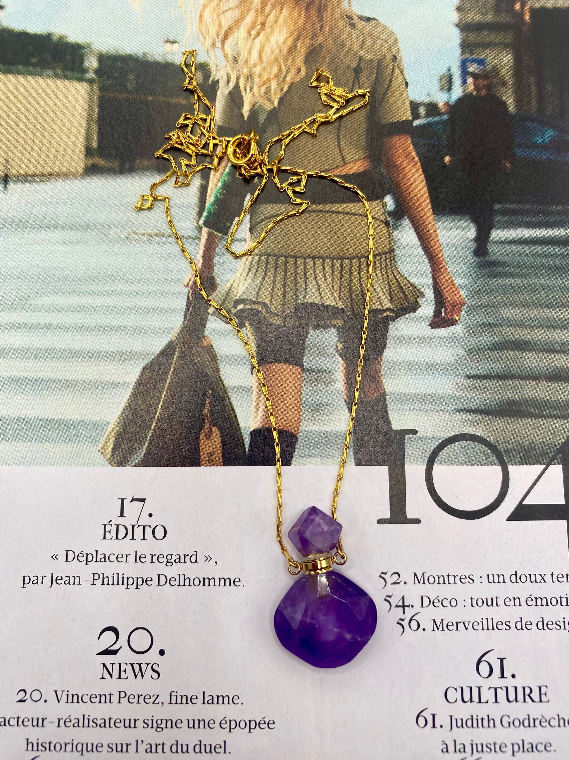 Ce collier est une chaîne en plaqué or avec un pendentif incroyable. C’est une « gourde » en améthyste, vous pouvez véritablement y glisser quelque chose. La personne qui me l’a vendu m’a avoué en porter un avec son parfum à l’intérieur. Une pièce mystique avec son secret.