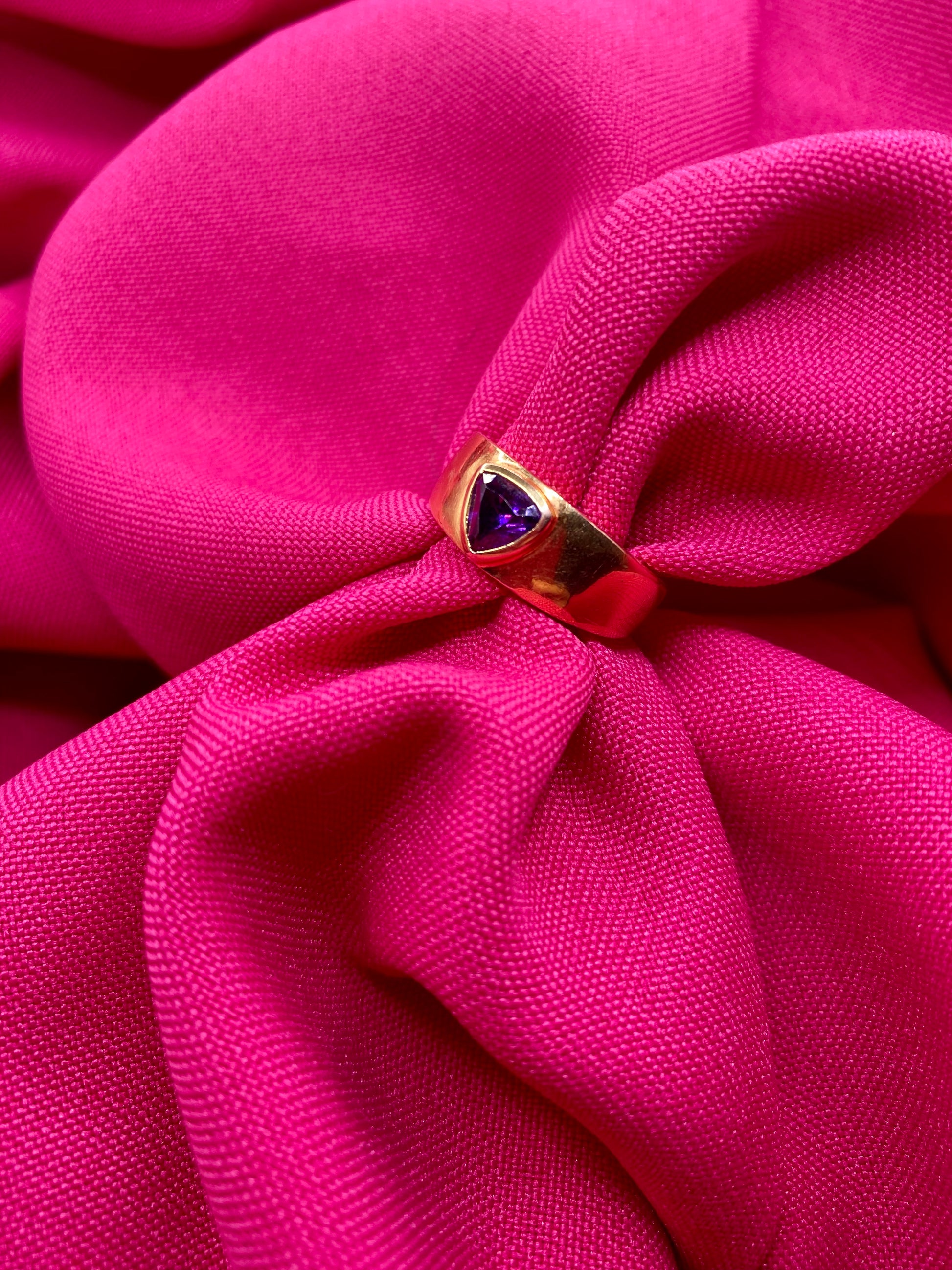 FR/ Bague anneau des années 80 avec un très beau plaqué or sertie d’un cristal violet profond. Une pièce qui sublime une main.