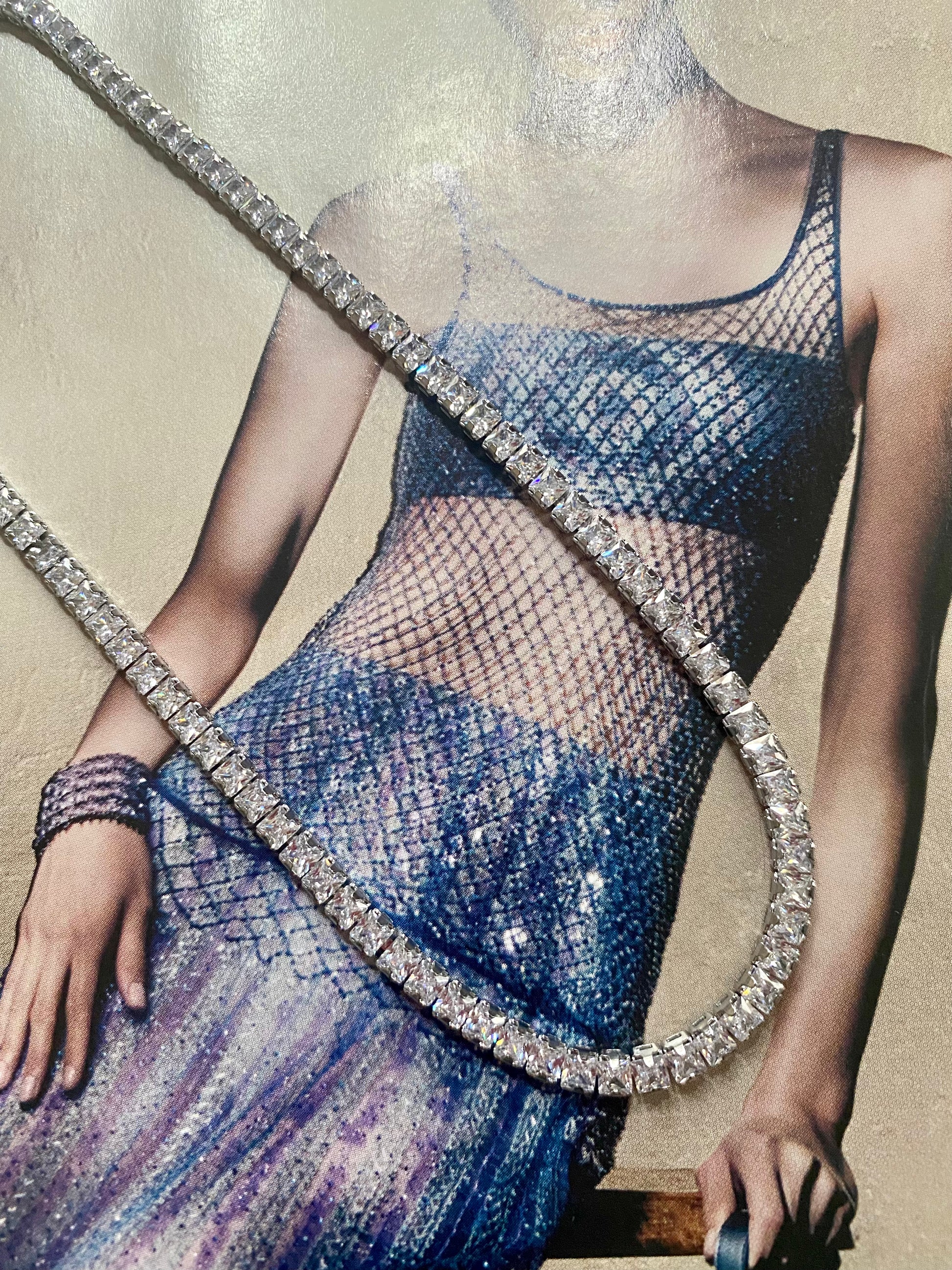 Ras de cou entièrement fait de petits cristaux Swarovski blancs. Il est en acier inoxydable, il ne bougera pas d’un pouce!