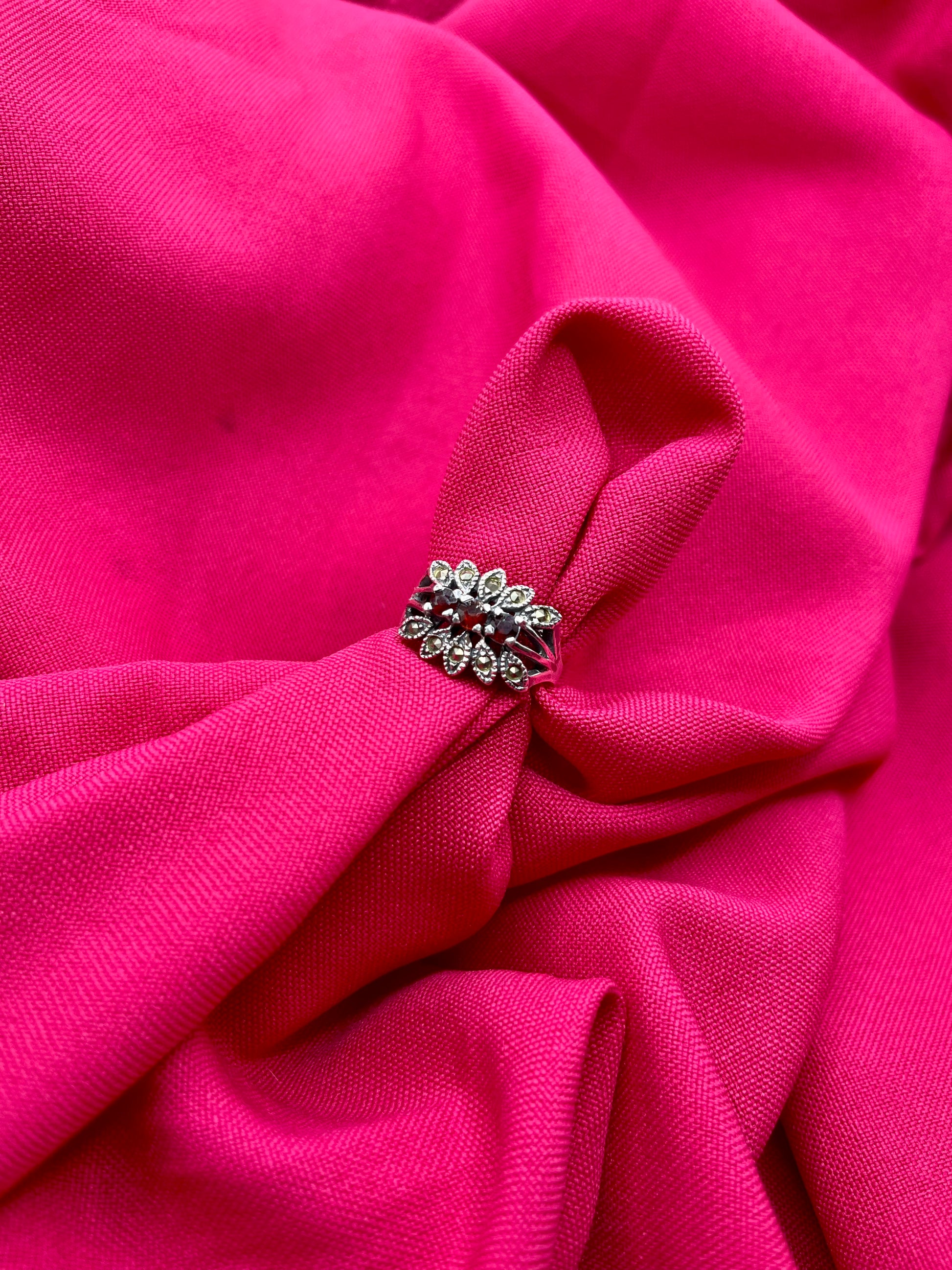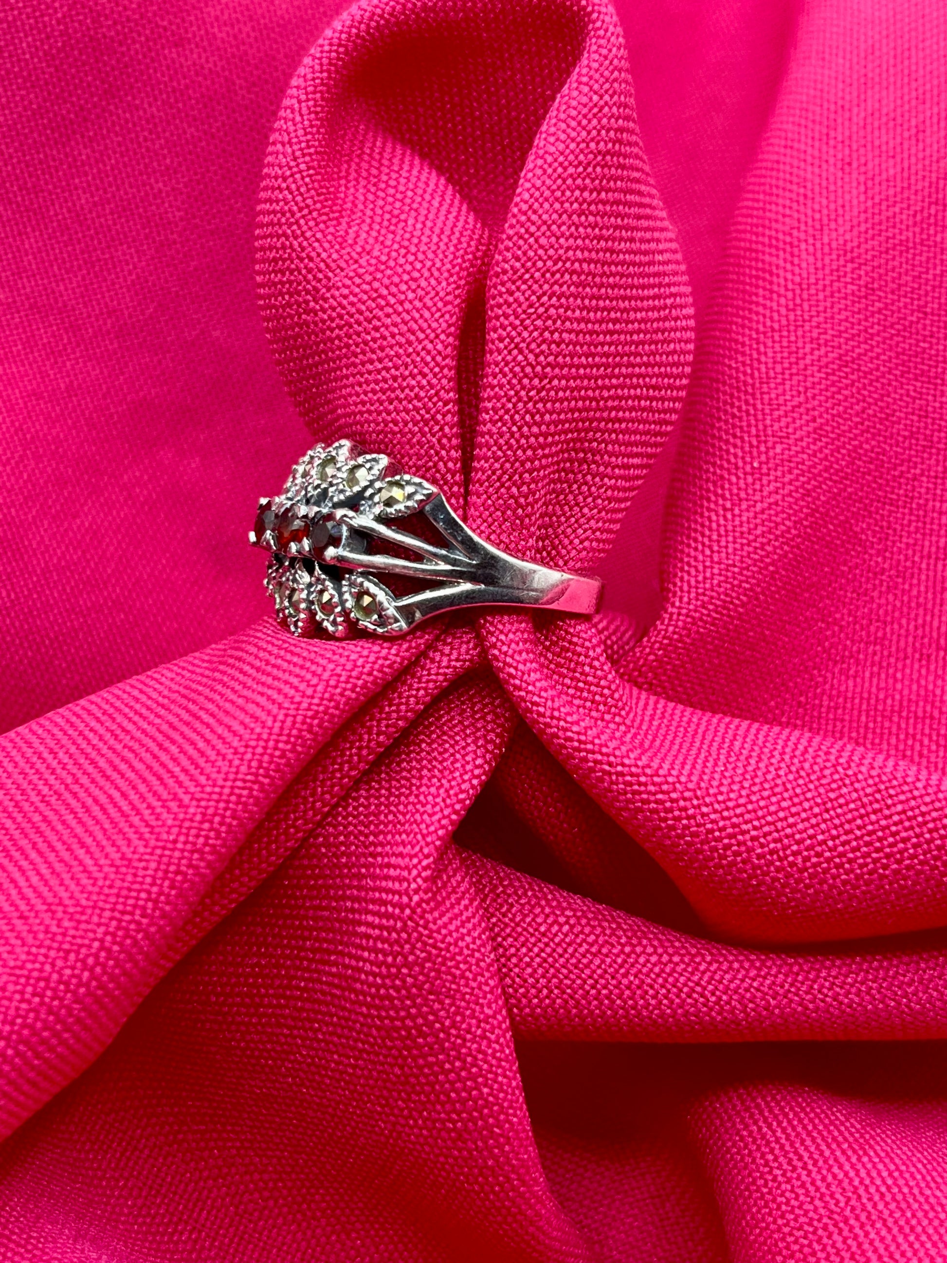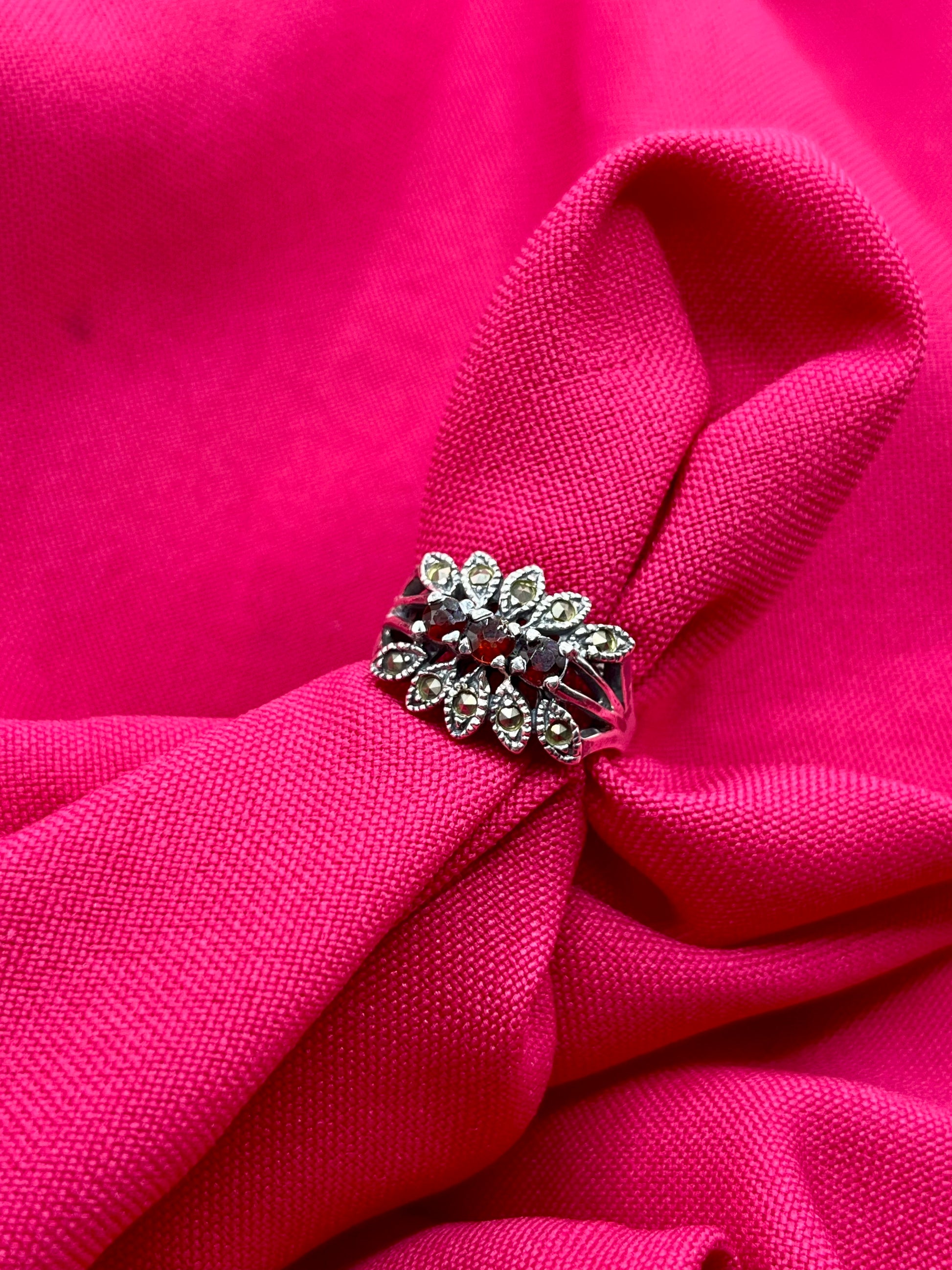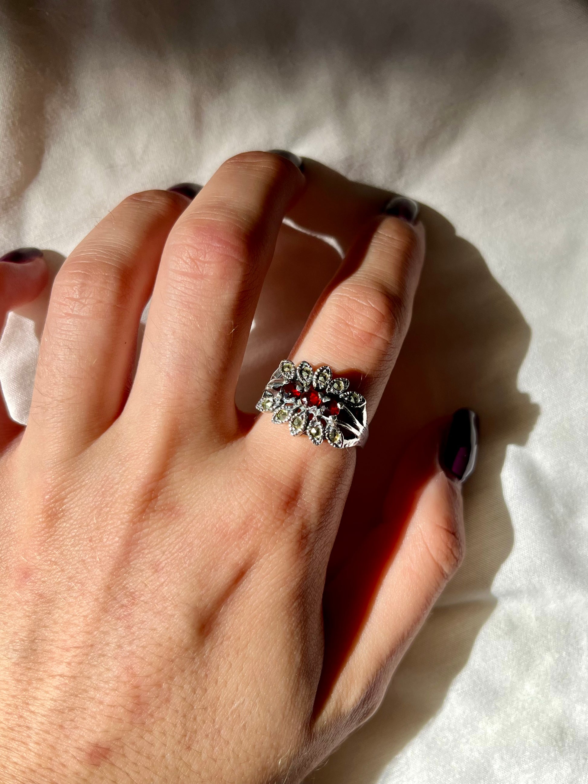 FR/ Bague en argent 925 sertie de trois cristaux rouges foncés et de multiples hématites. Une pièce à l’ambiance gothique avec un joli travail de forme.