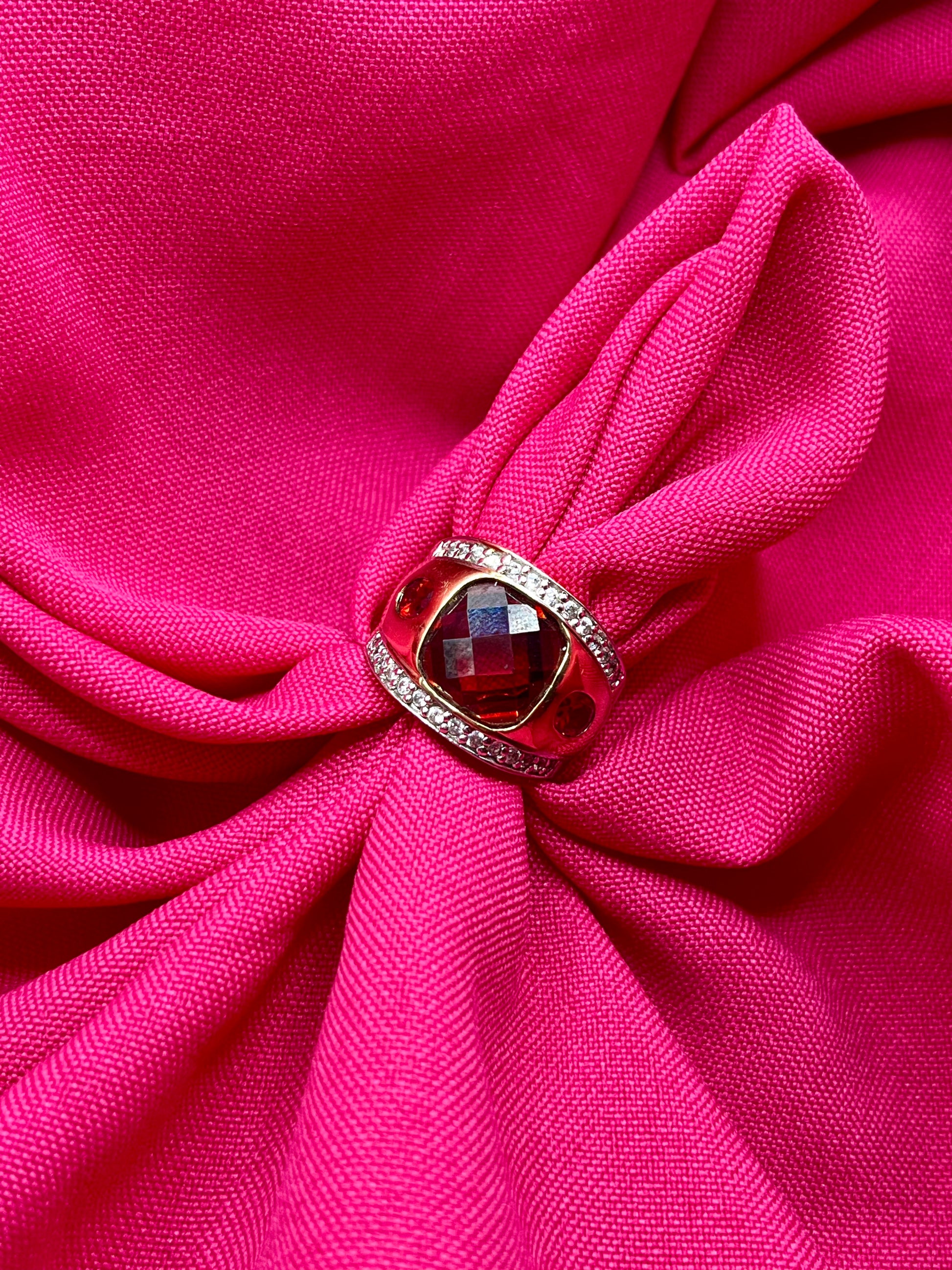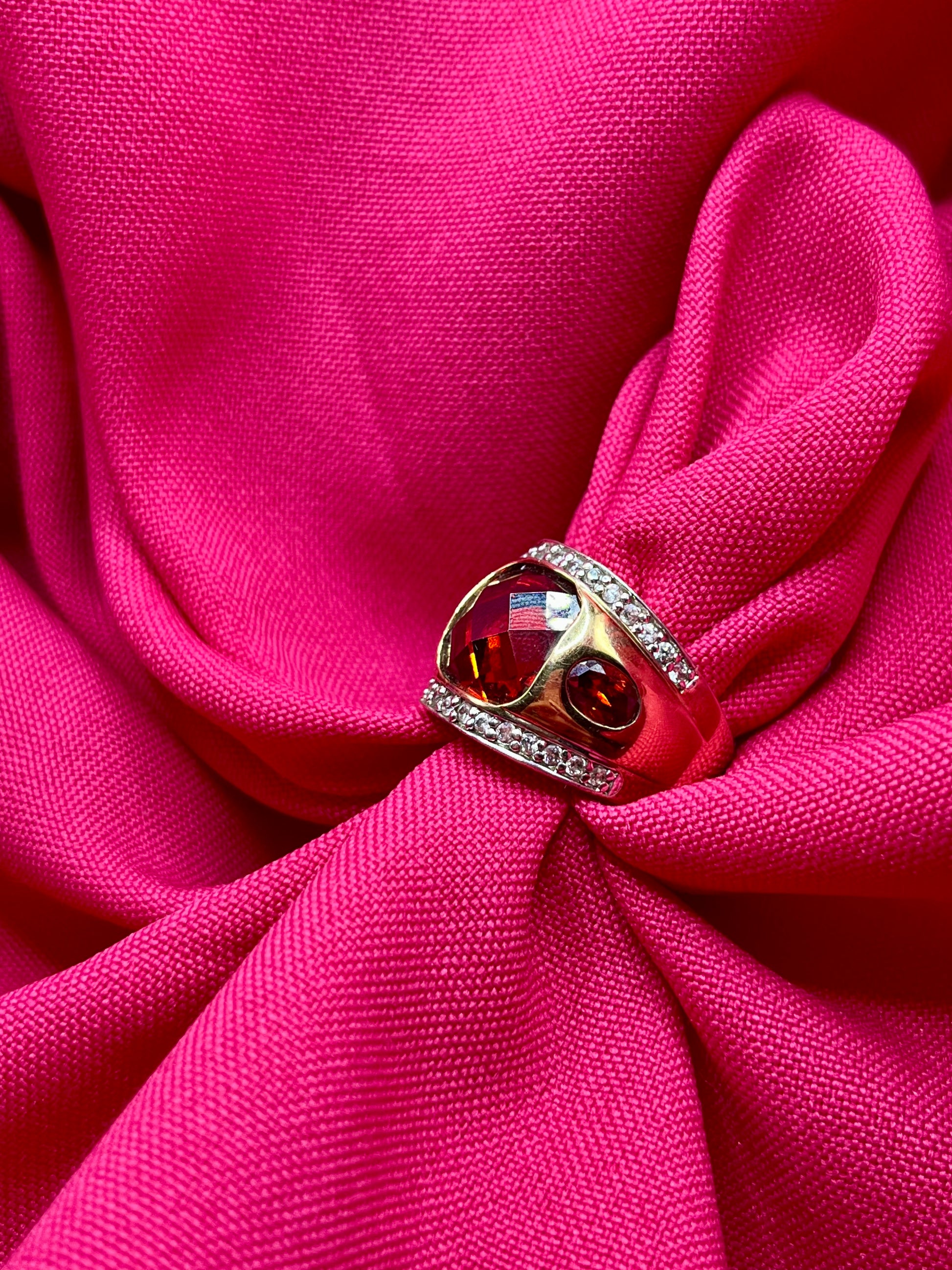 FR/ Sublime bague en plaqué or sertie de trois pierres rouges profond et zirconiums. Une pièce statement, lumineuse et qui sort de l’ordinaire.