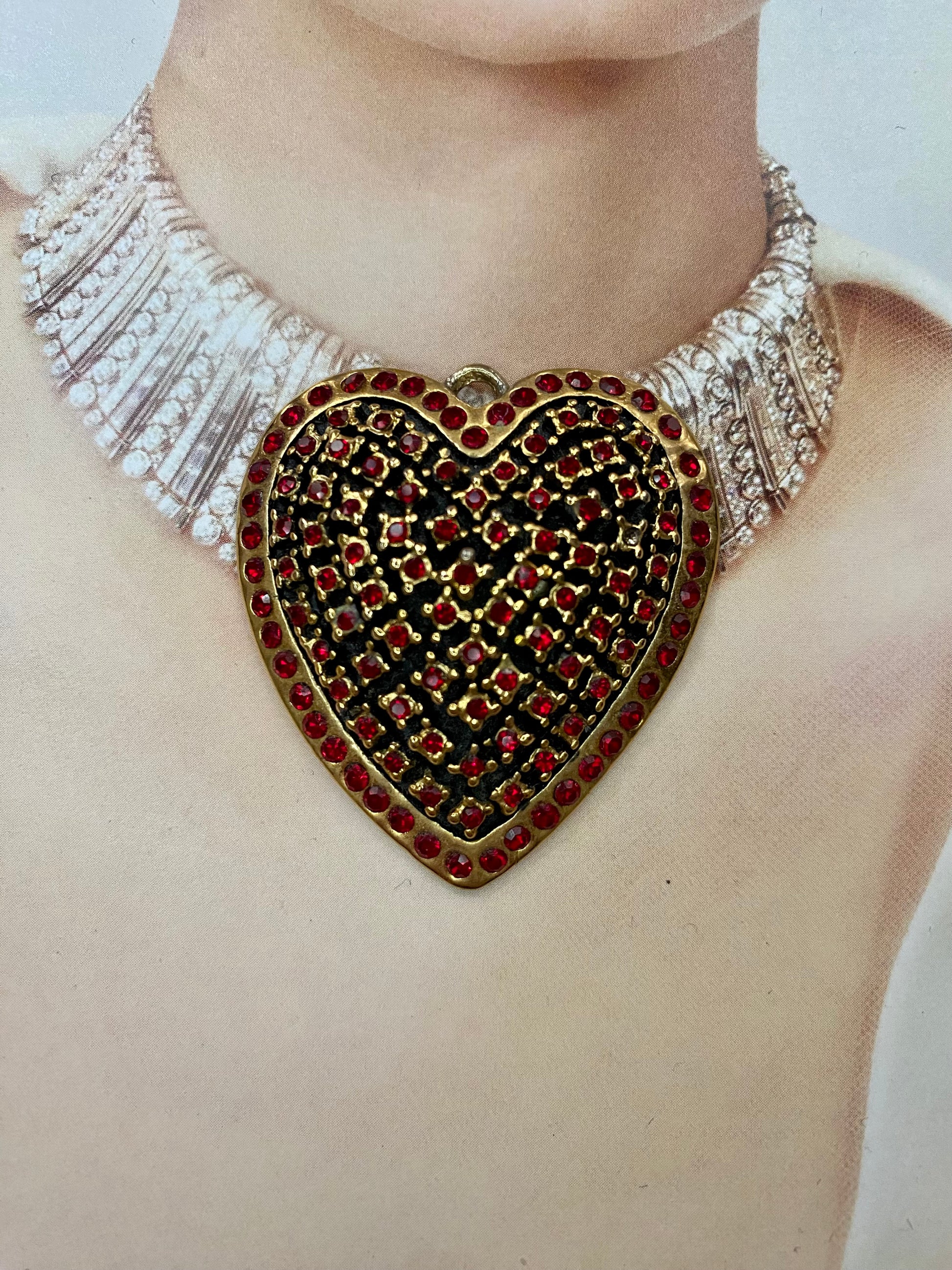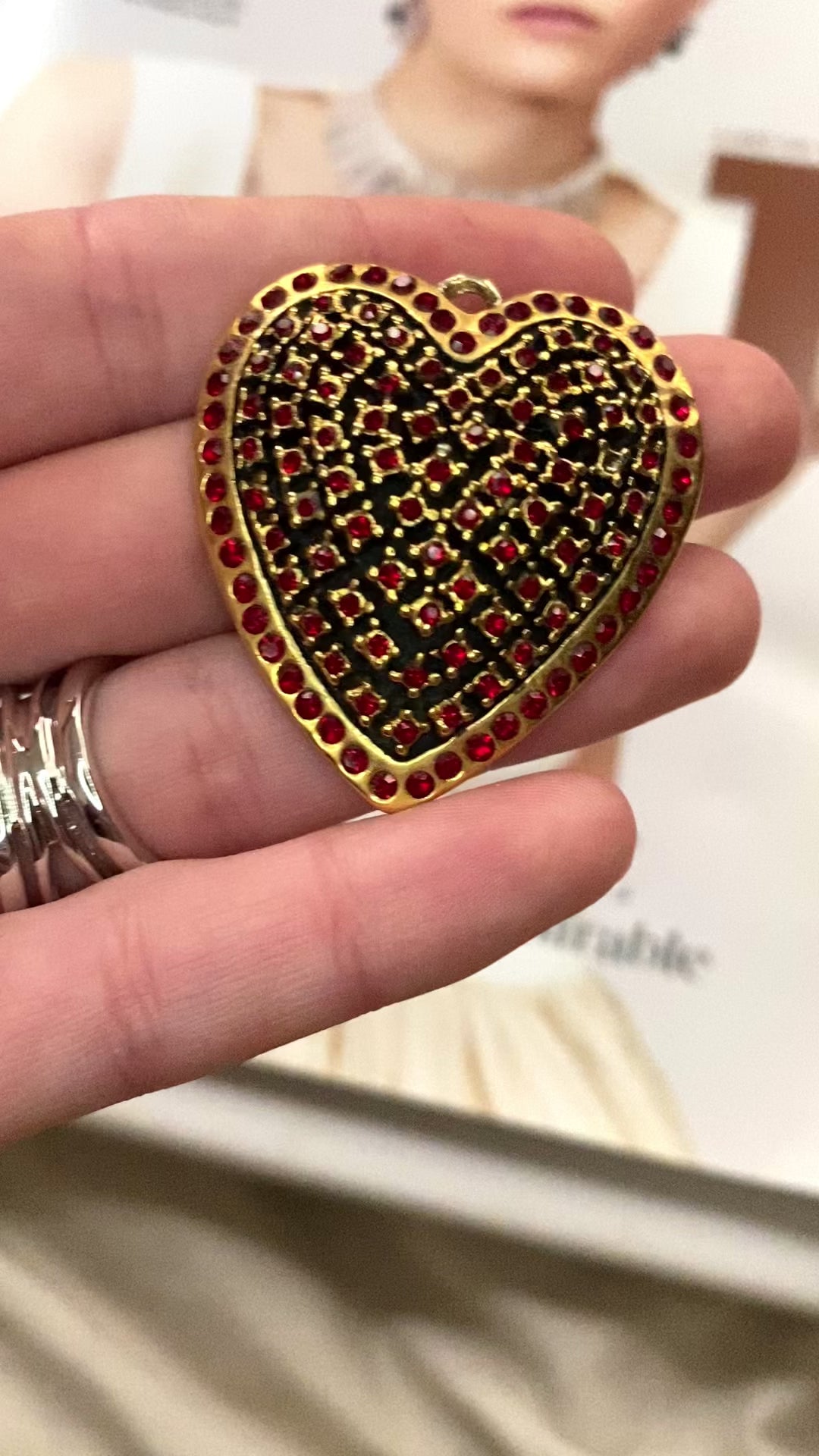 FR/ Pendentif en forme de cœur en plaqué or serti d’une multitude de zirconiums rouges. Cadeau parfait pour la saint Valentin qui arrive (même de toi à toi!), il est resplendissant !