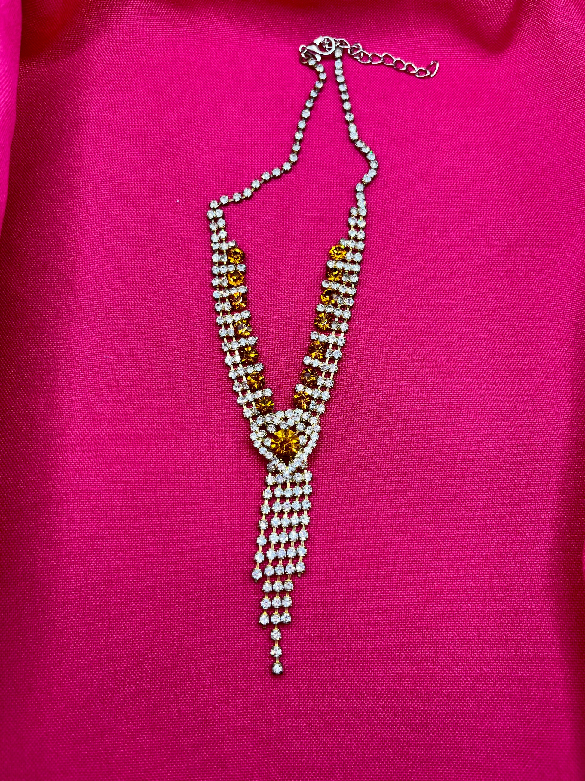 FR/ Collier très court, ultra lumineux avec ses strass oranges et blancs. Une pièce ultra sexy et élégante.