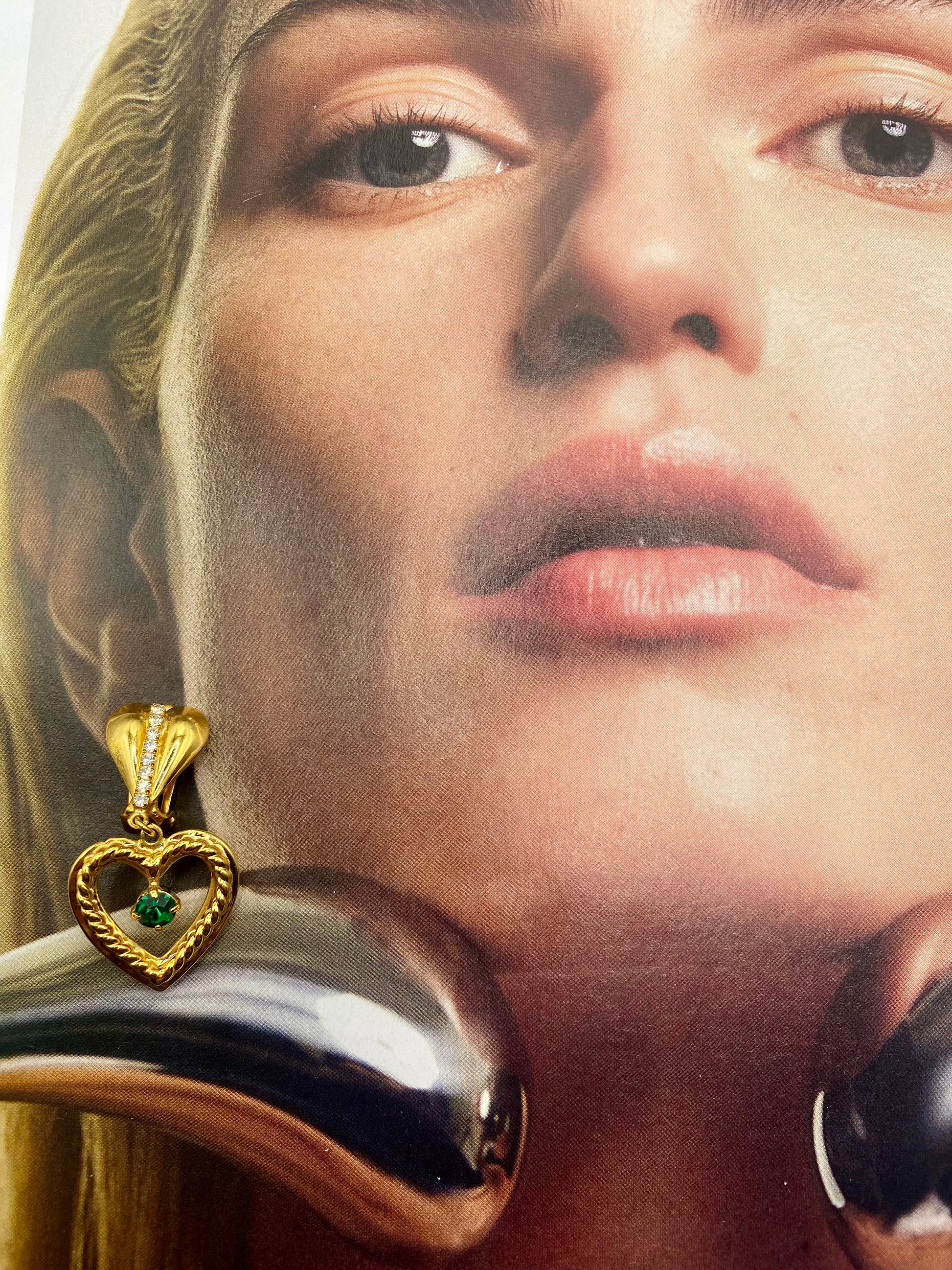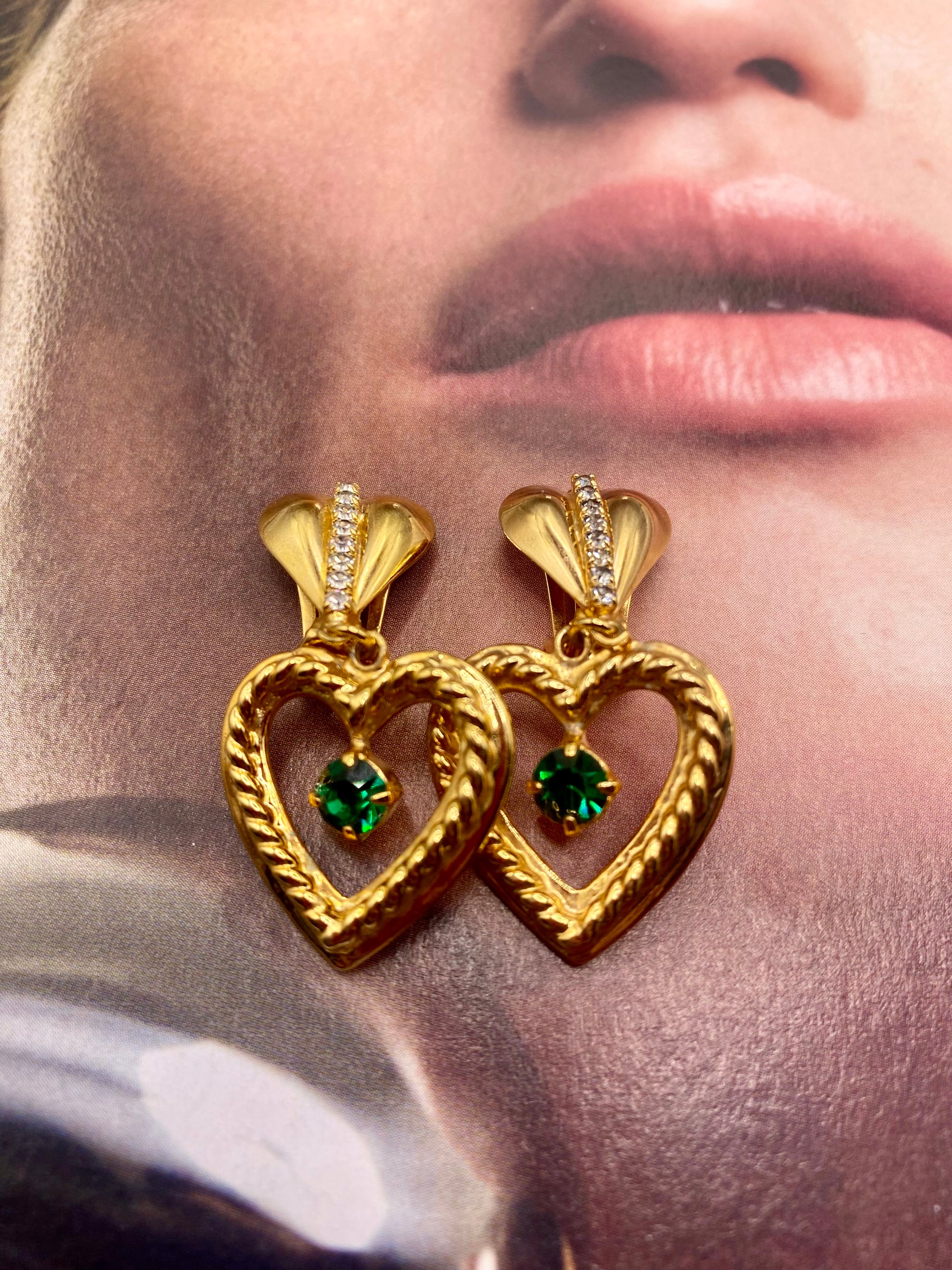 EN/ These romantic clips with an art deco spirit are extremely light and pleasant to wear. A piece filled with finesse, made of gold-colored metal, a small green zirconium and rhinestones.